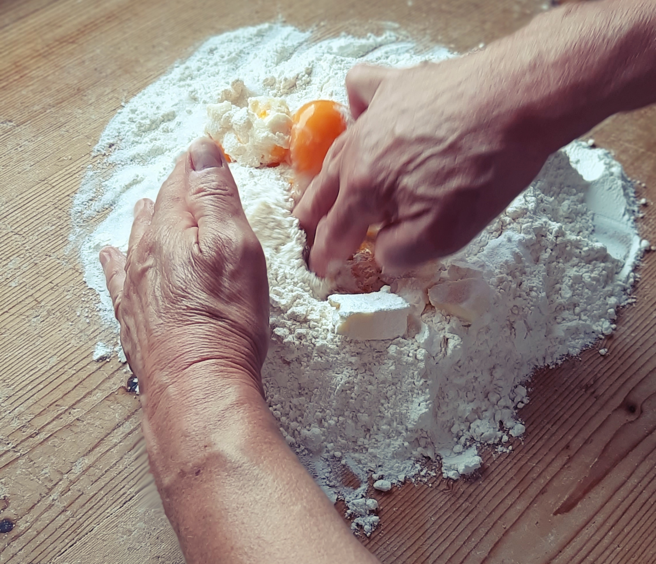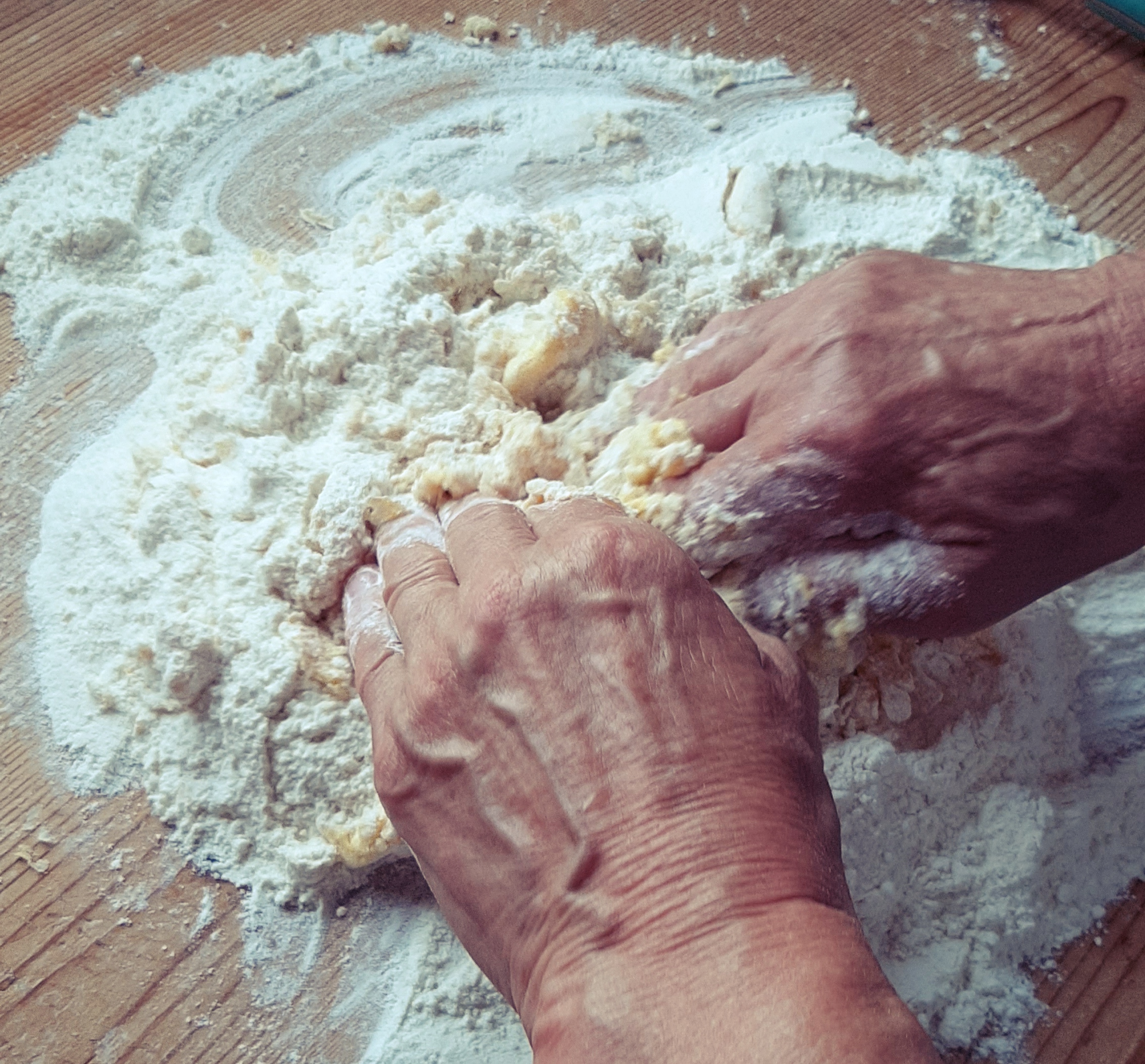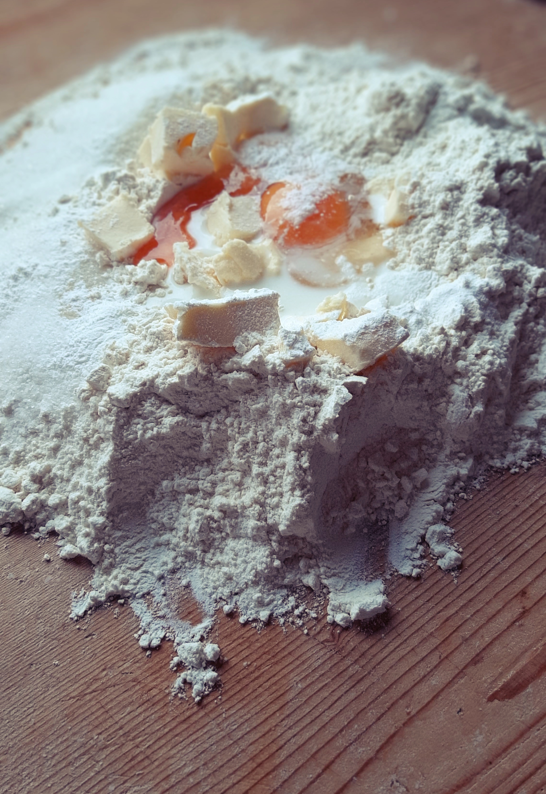 Passiamo alla preparazione della frolla; facciamo la classica fontana con la farina, creando un incavo in cui metteremo tutti gli altri ingredienti e cominciamo a lavorare fino ad ottenere il nostro panetto di frolla, senza lavorarlo troppo specialmente d’estate.