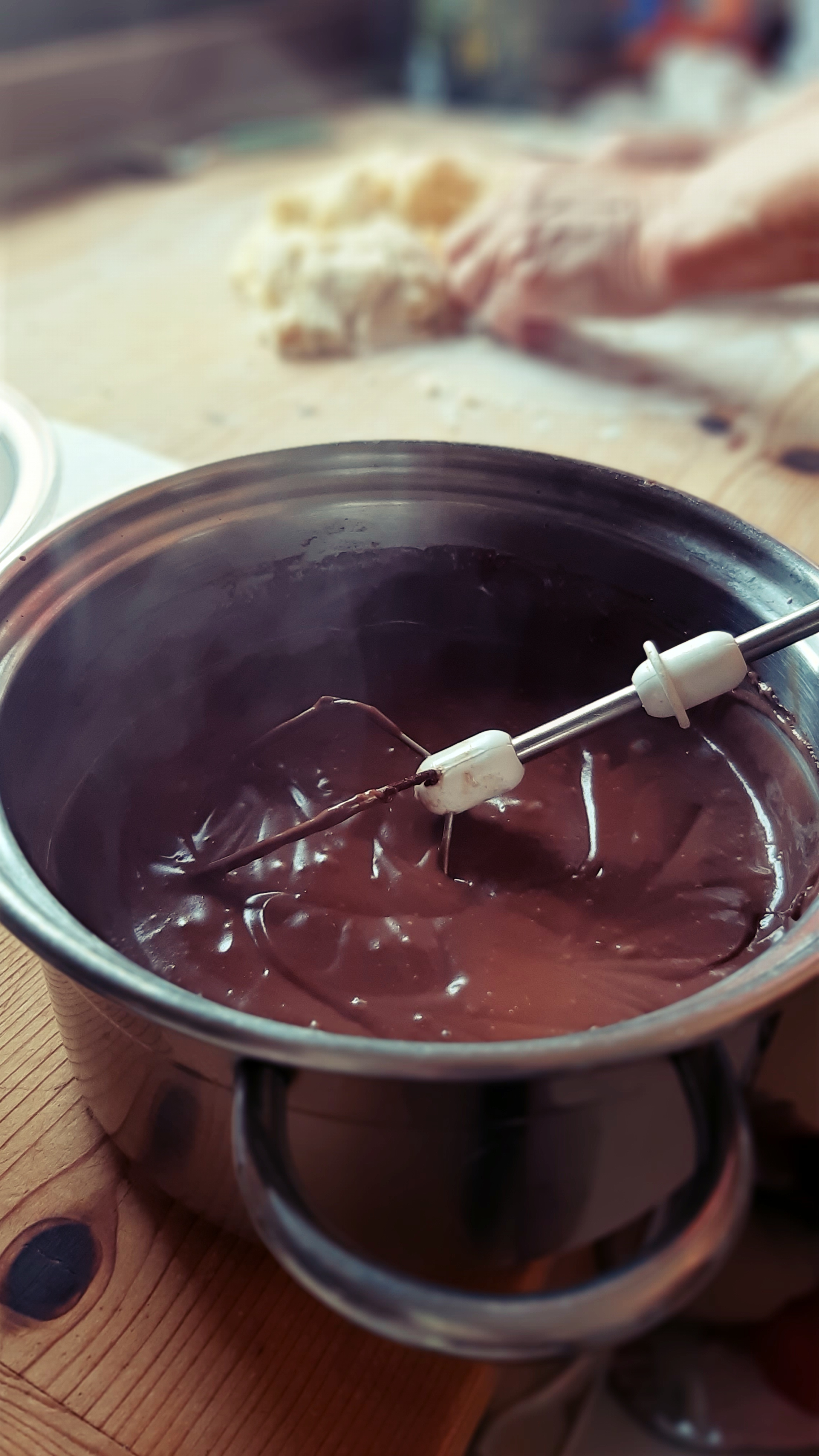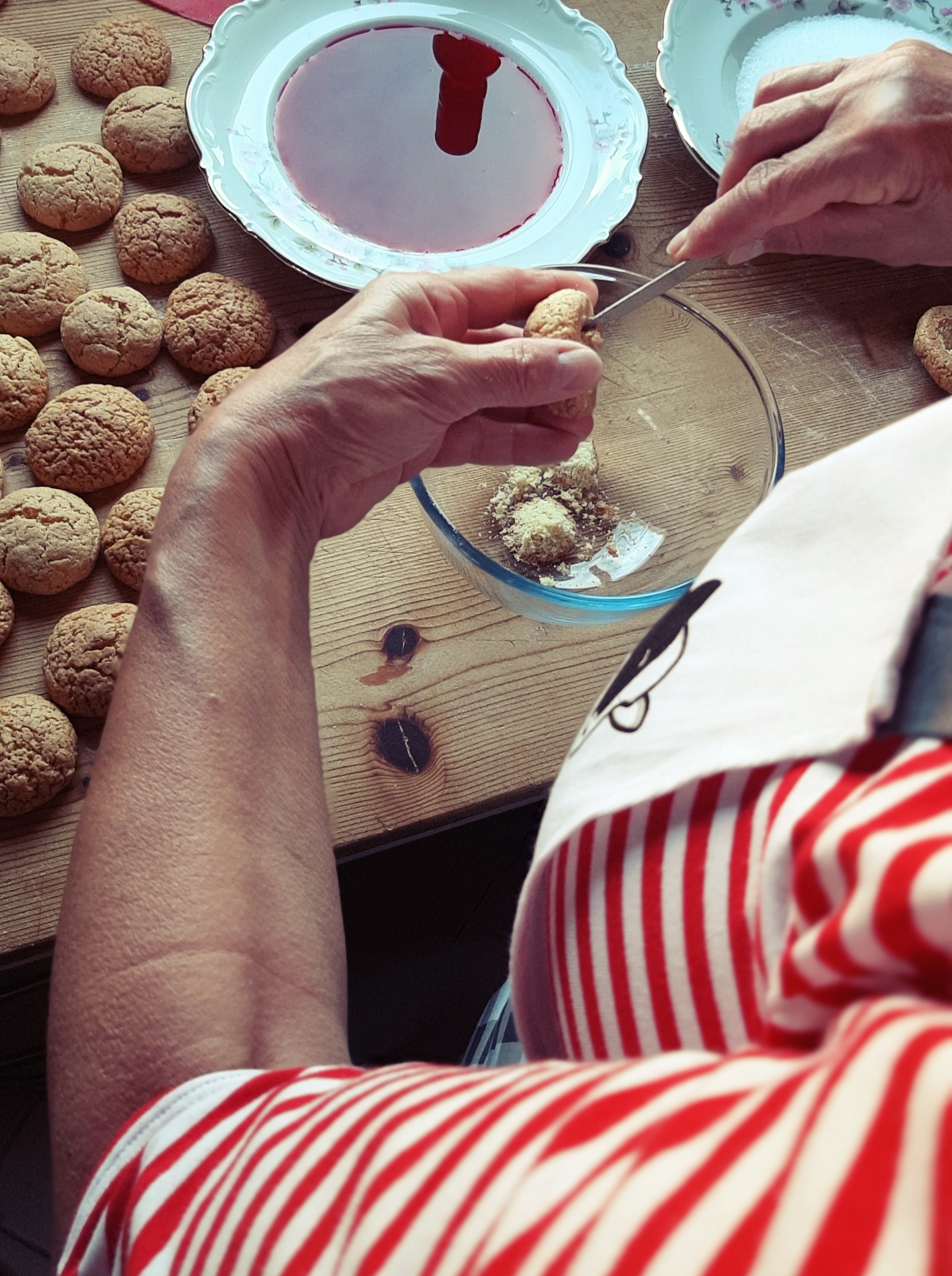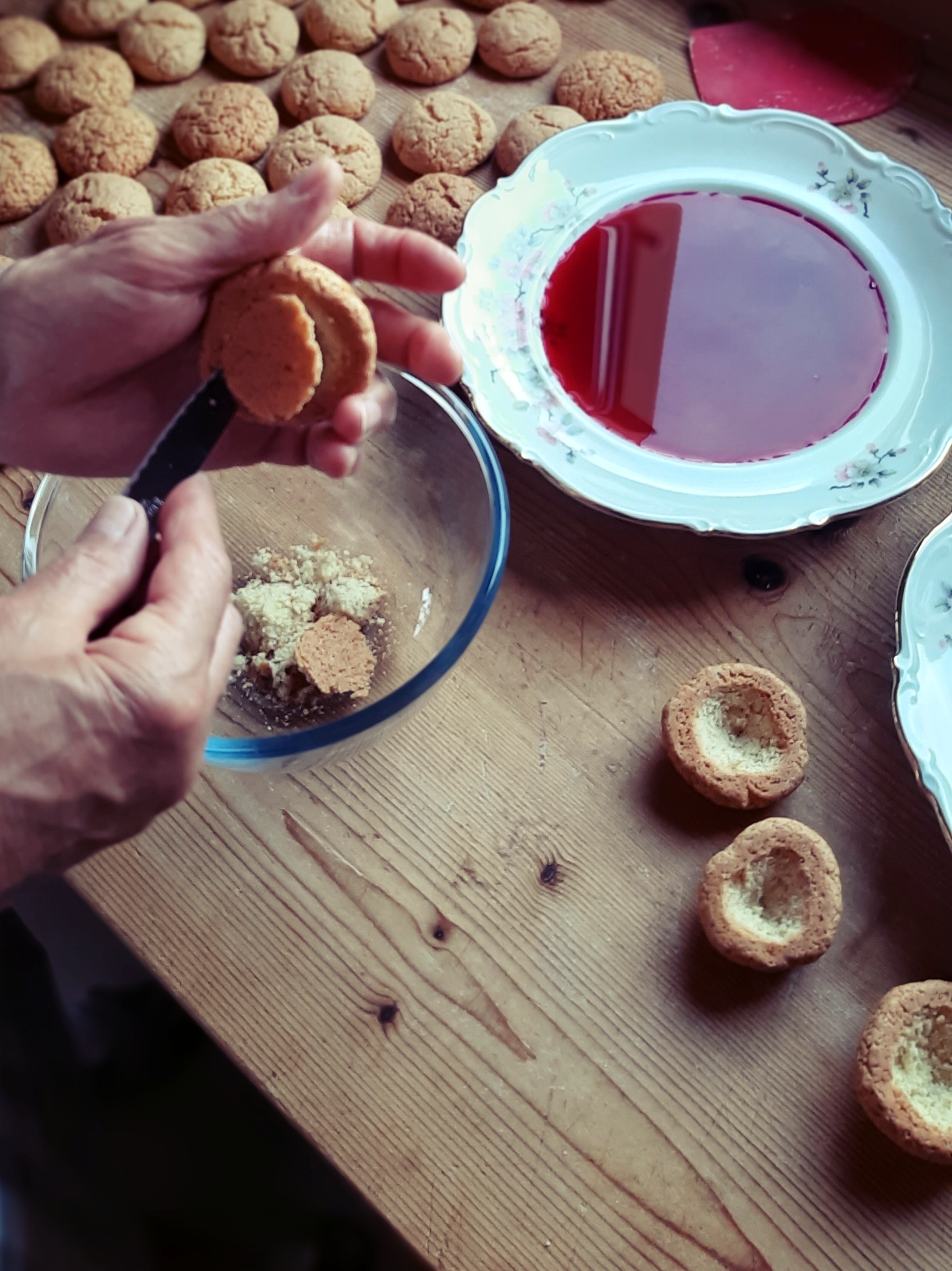 Lasciamo intiepidire leggermente e con la punta di un coltello, scaviamo il guscio che poi riempiremo con la crema al cioccolato; uniamo due gusci per formare la pesca e poi la passiamo delicatamente nell’alchermes e subito dopo nello zucchero semolato.