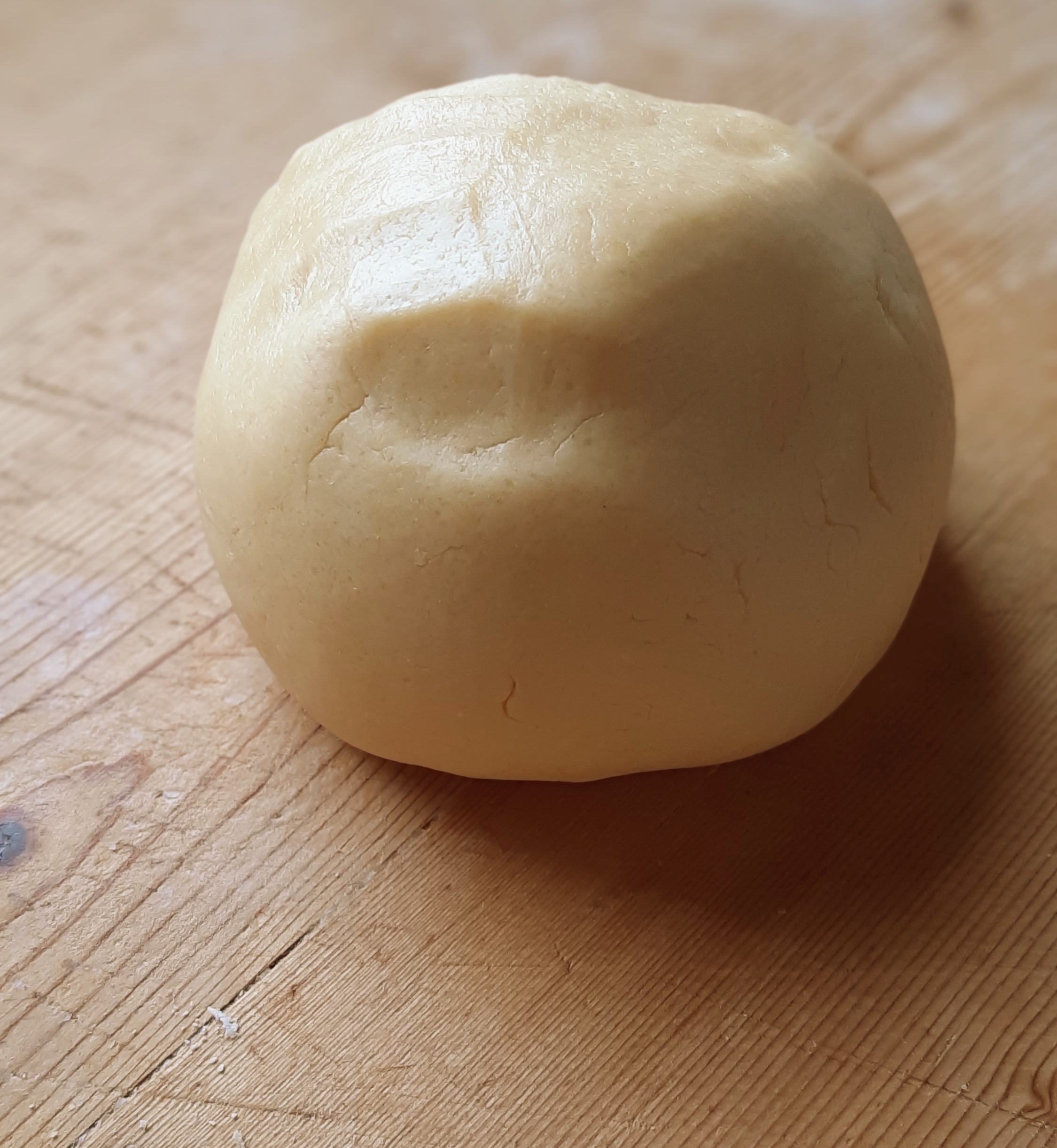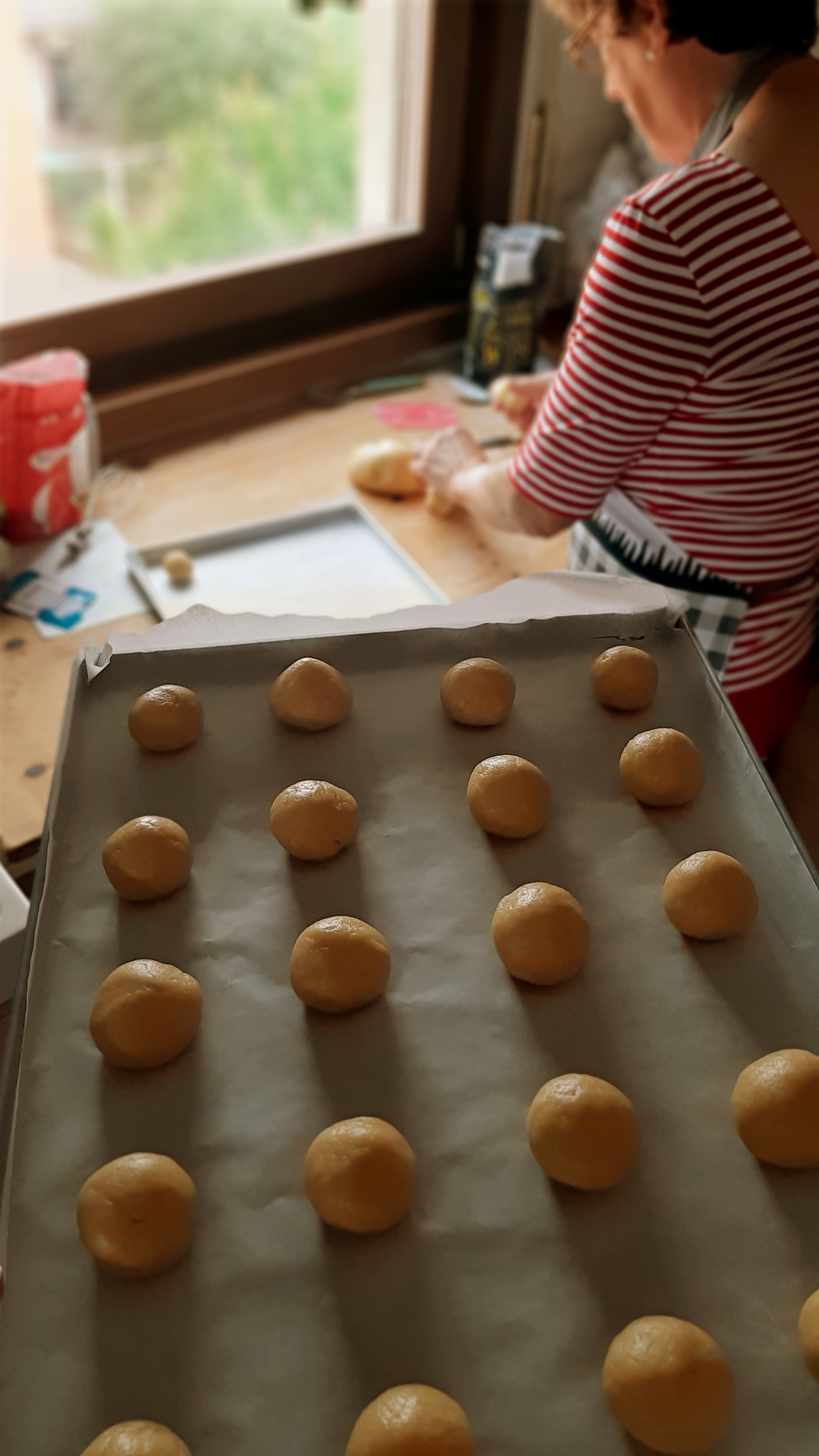 Formiamo subito le palline per i gusci delle pesche; per farle come quelle della Paola che, come vi dicevamo, sono pesche abbastanza grandine, pesiamo dei tocchettini di circa 25 g.