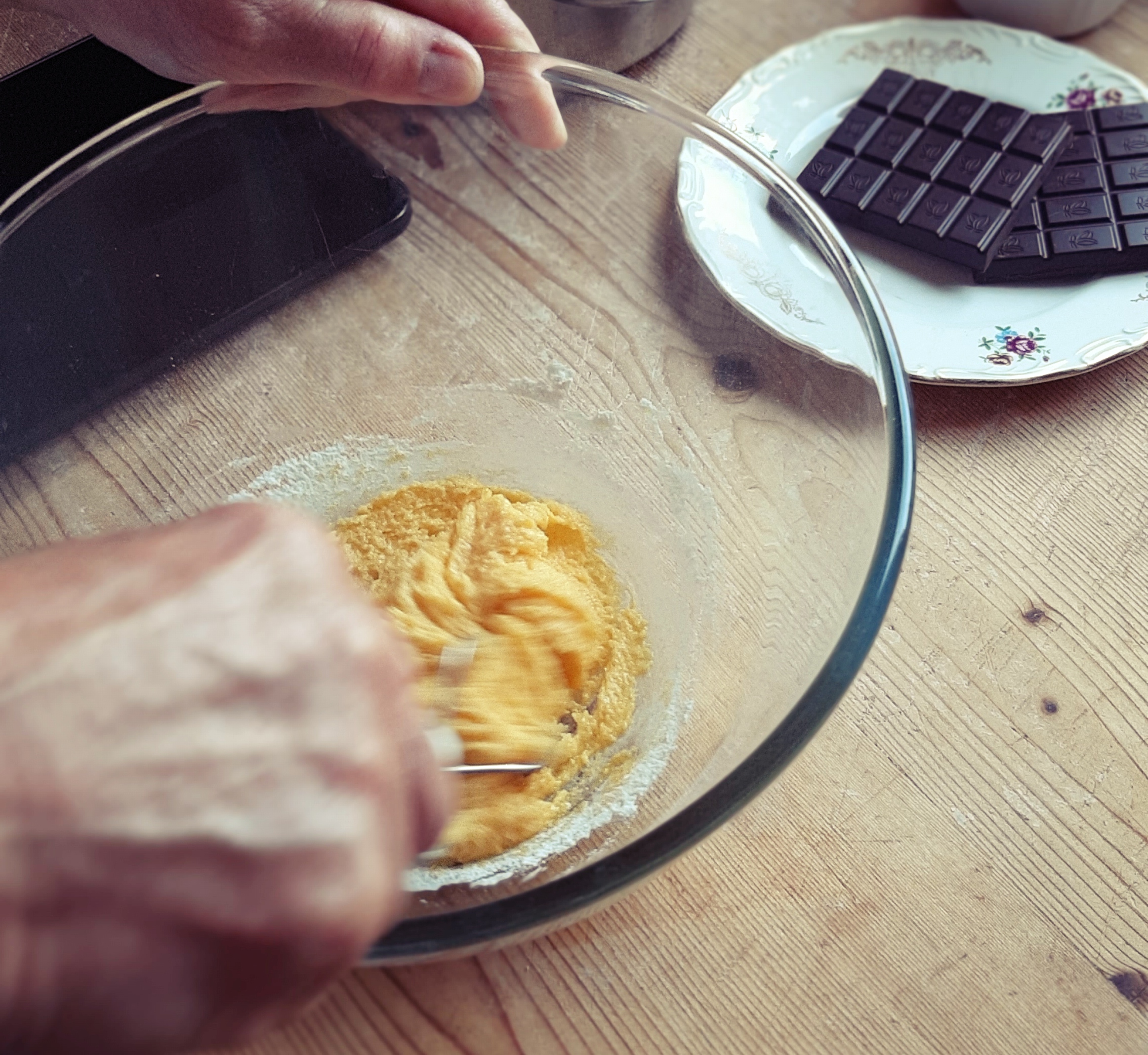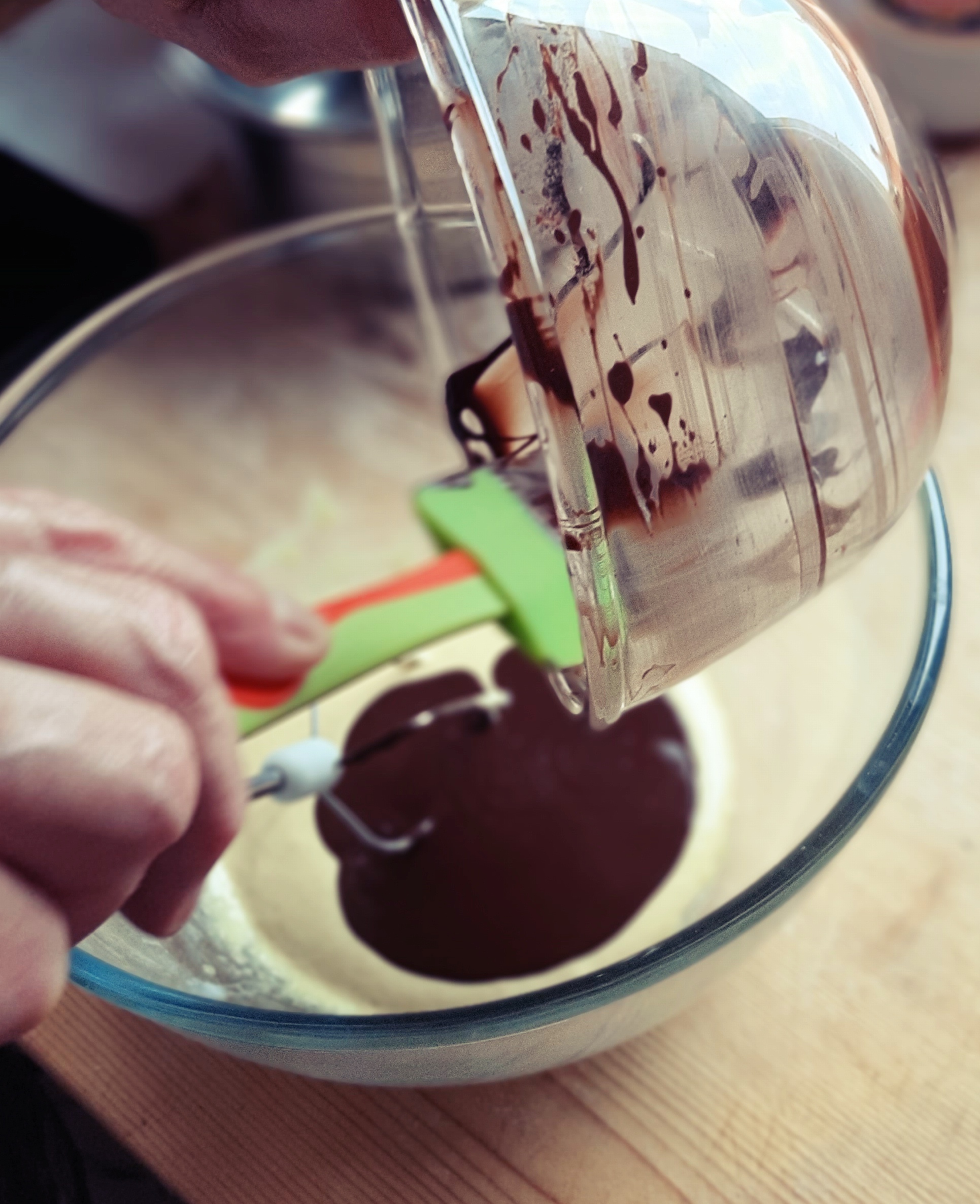 Cominciamo dalla crema che dovrà raffreddare: mettiamo a scaldare il latte e a sciogliere il cioccolato (a bagnomaria o al microonde) e nel frattempo, mescoliamo energicamente con una frusta i tuorli con lo zucchero e la farina.