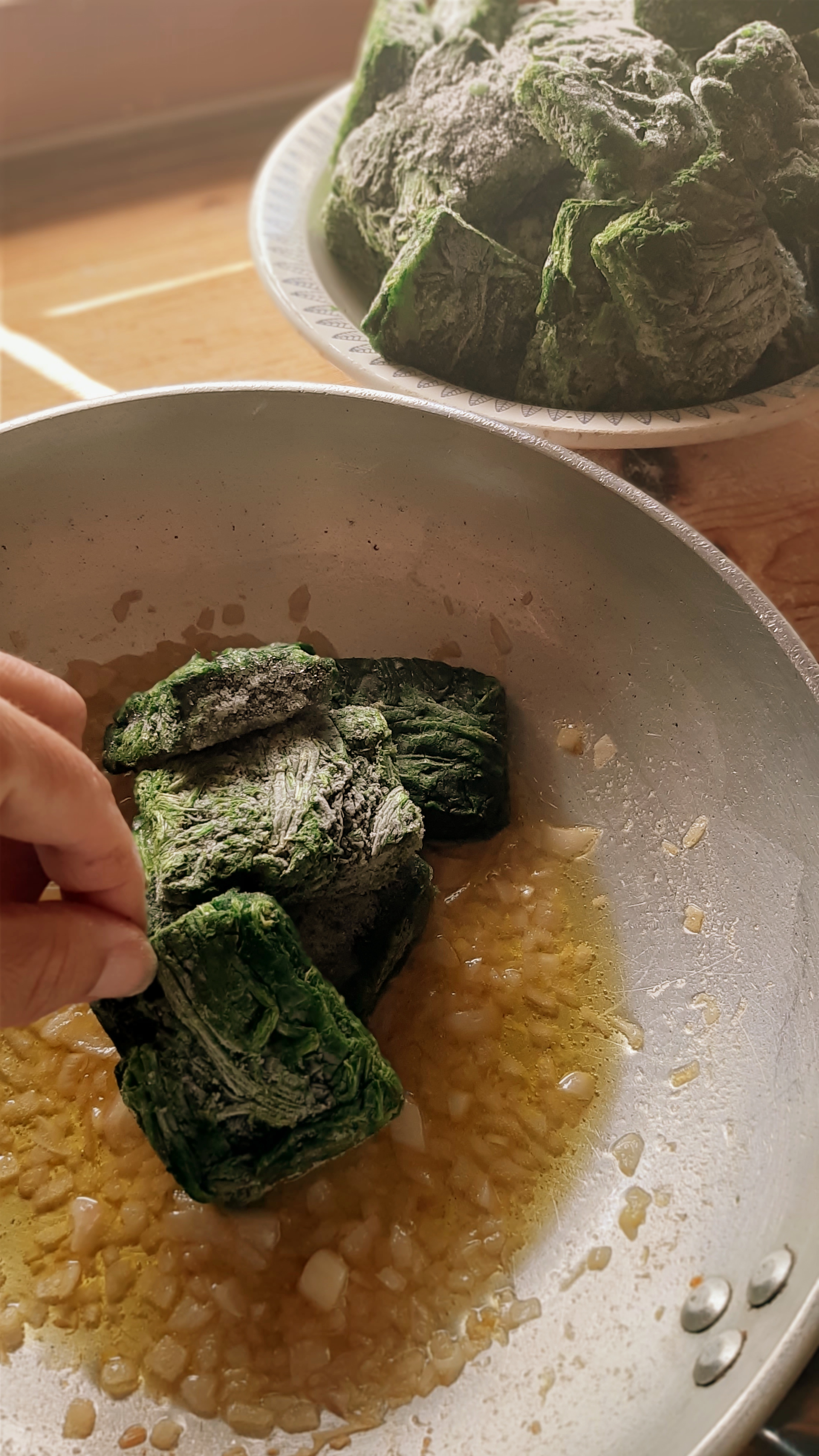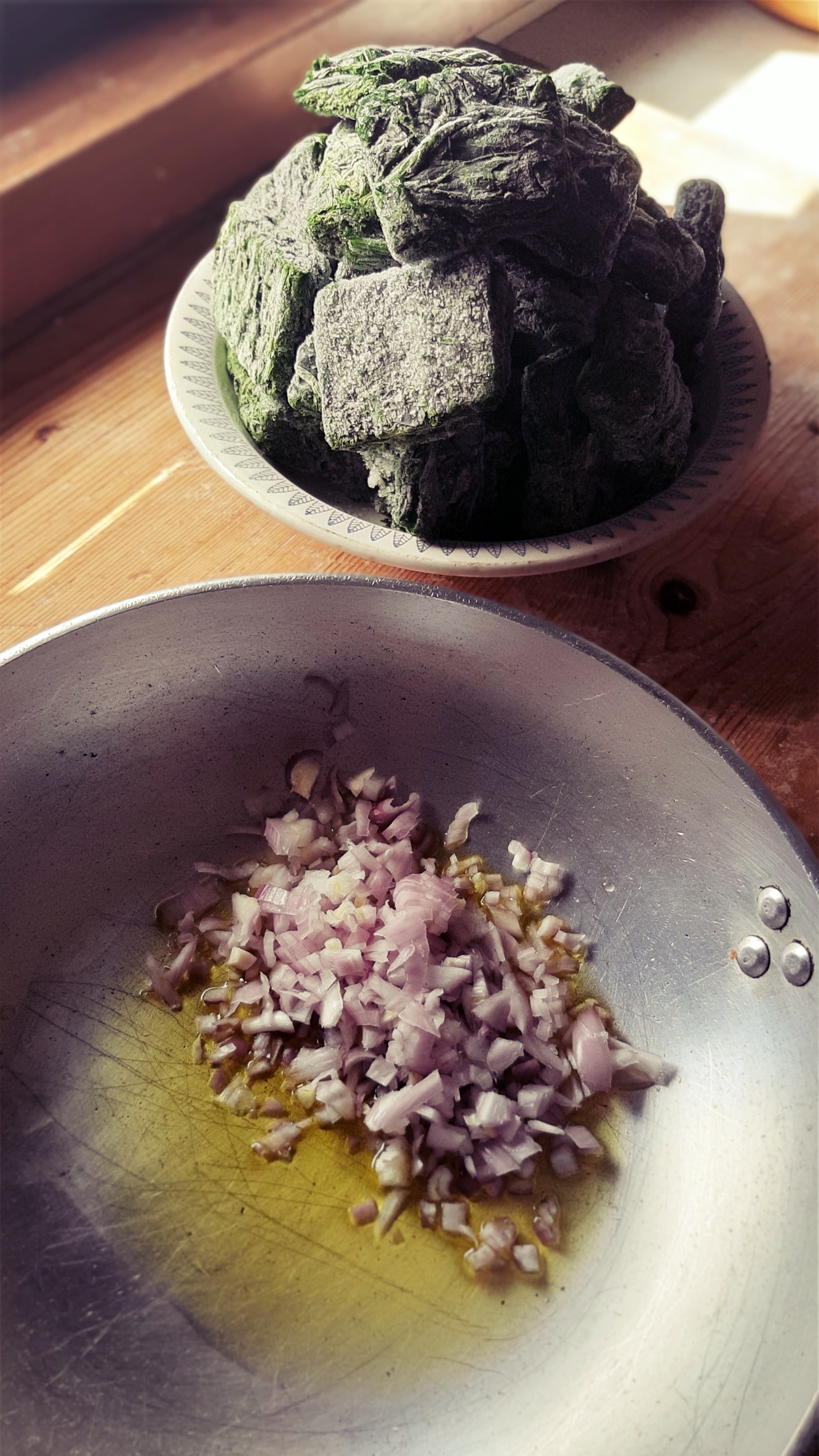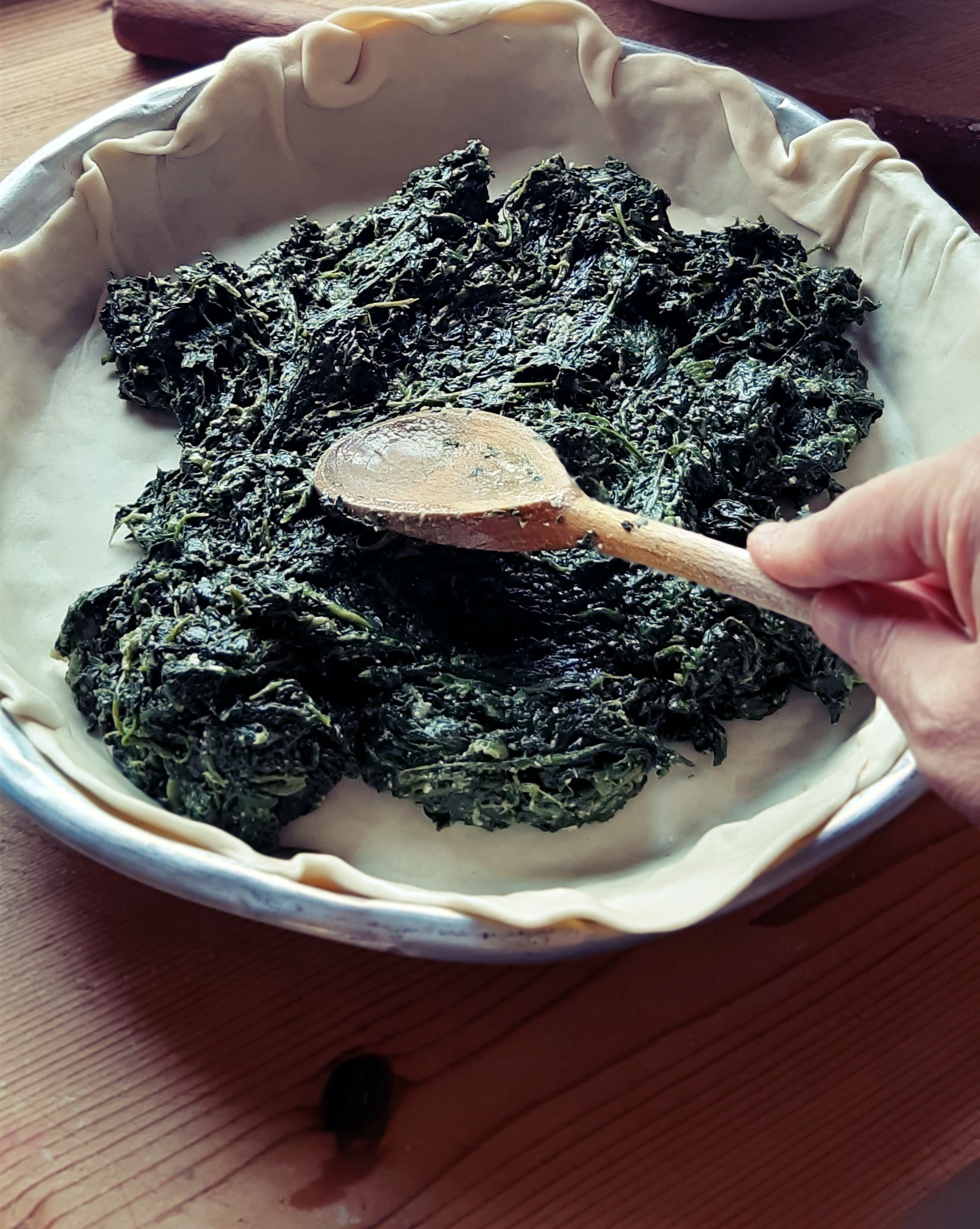 Partiamo dal ripieno che dovrà raffreddare; in una casseruola facciamo appassire gli scalogni tritati finemente con l’olio extra vergine, a fuoco basso. Aggiungiamo gli spinaci (che per comodità abbiamo scelto surgelati… l’Ercolina capirebbe!) e cuociamoli finchè non si sfalderanno. Non dobbiamo aggiungere acqua perché basterà quella rilasciata durante la cottura. Con il coperchio 30 minuti poi senza per far evaporare l’acqua in eccesso. A fine cottura aggiustiamo di sale e da freddi li tritiamo leggermente e uniamo il Parmigiano Reggiano grattugiato.
