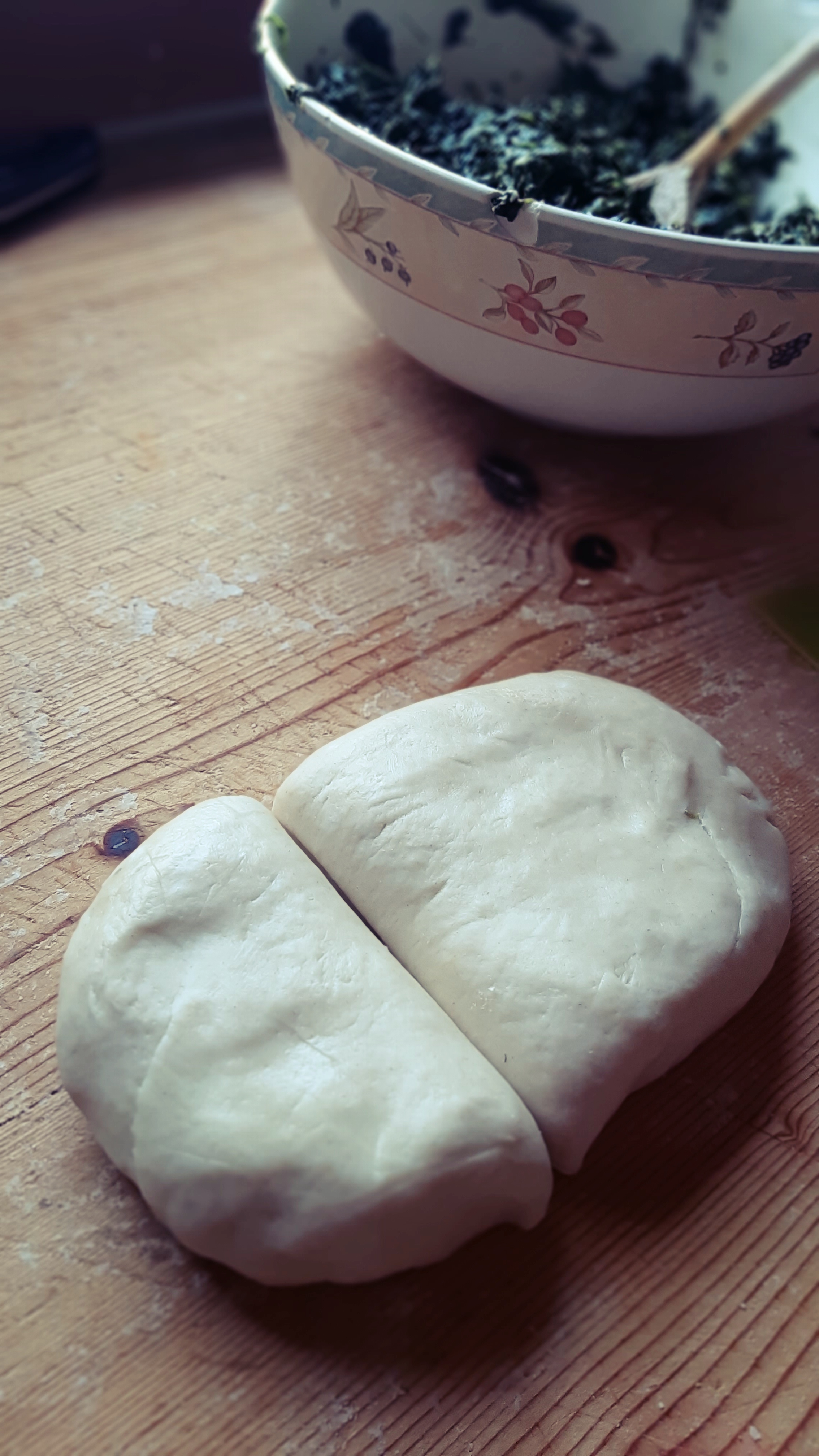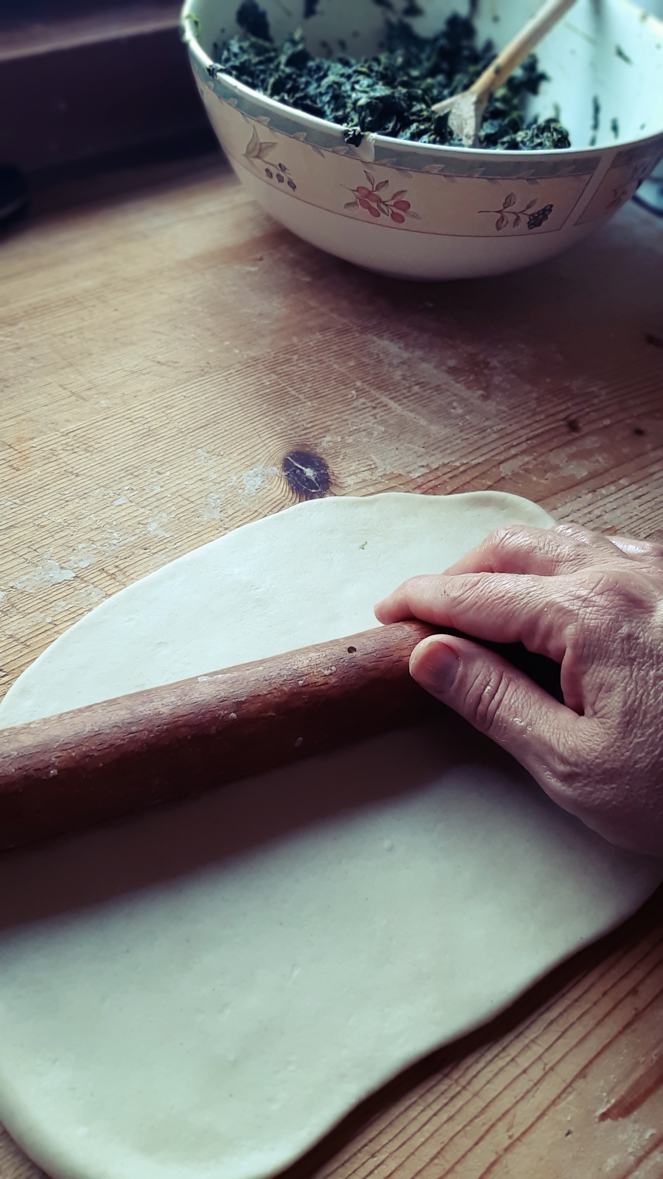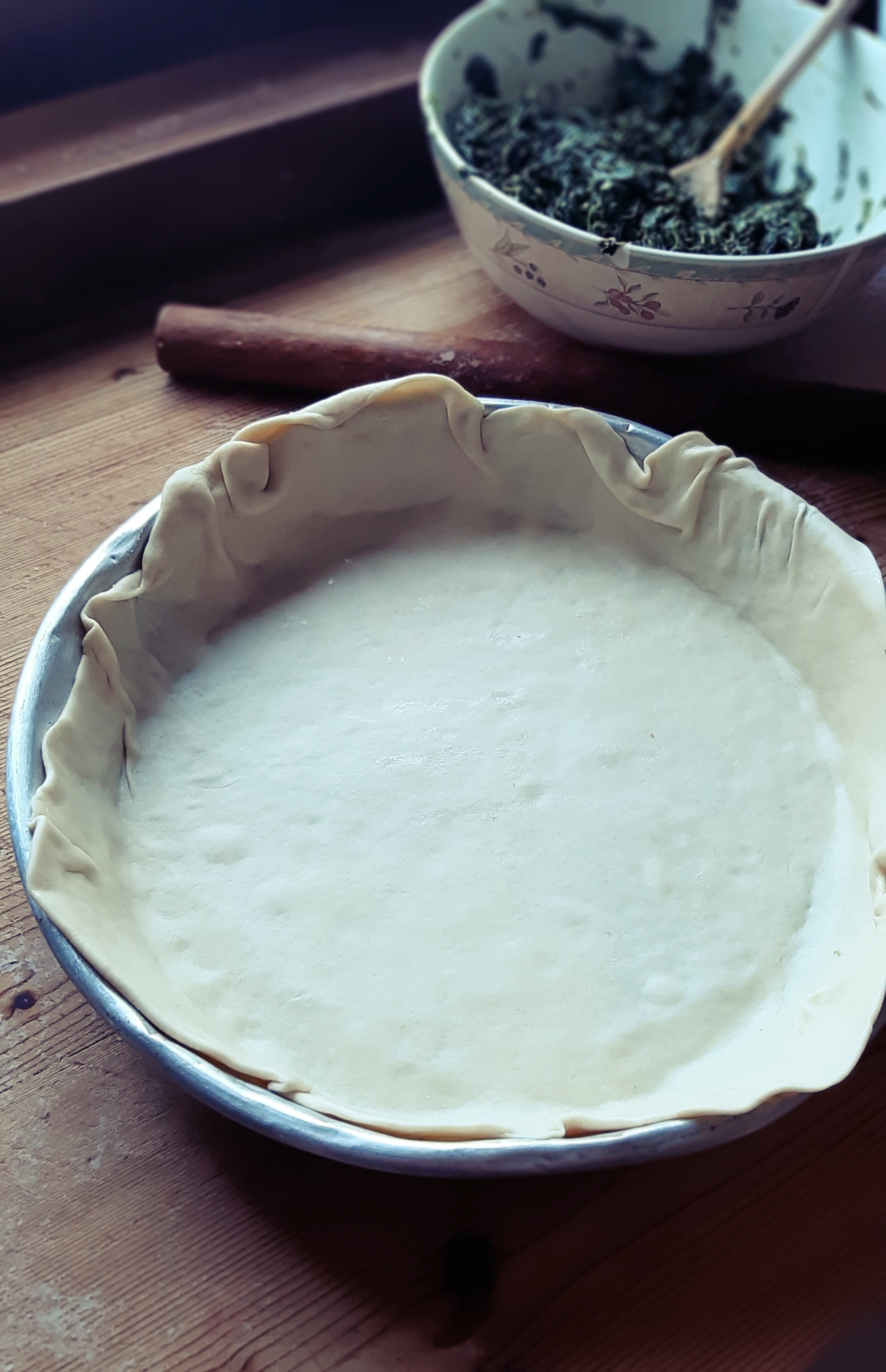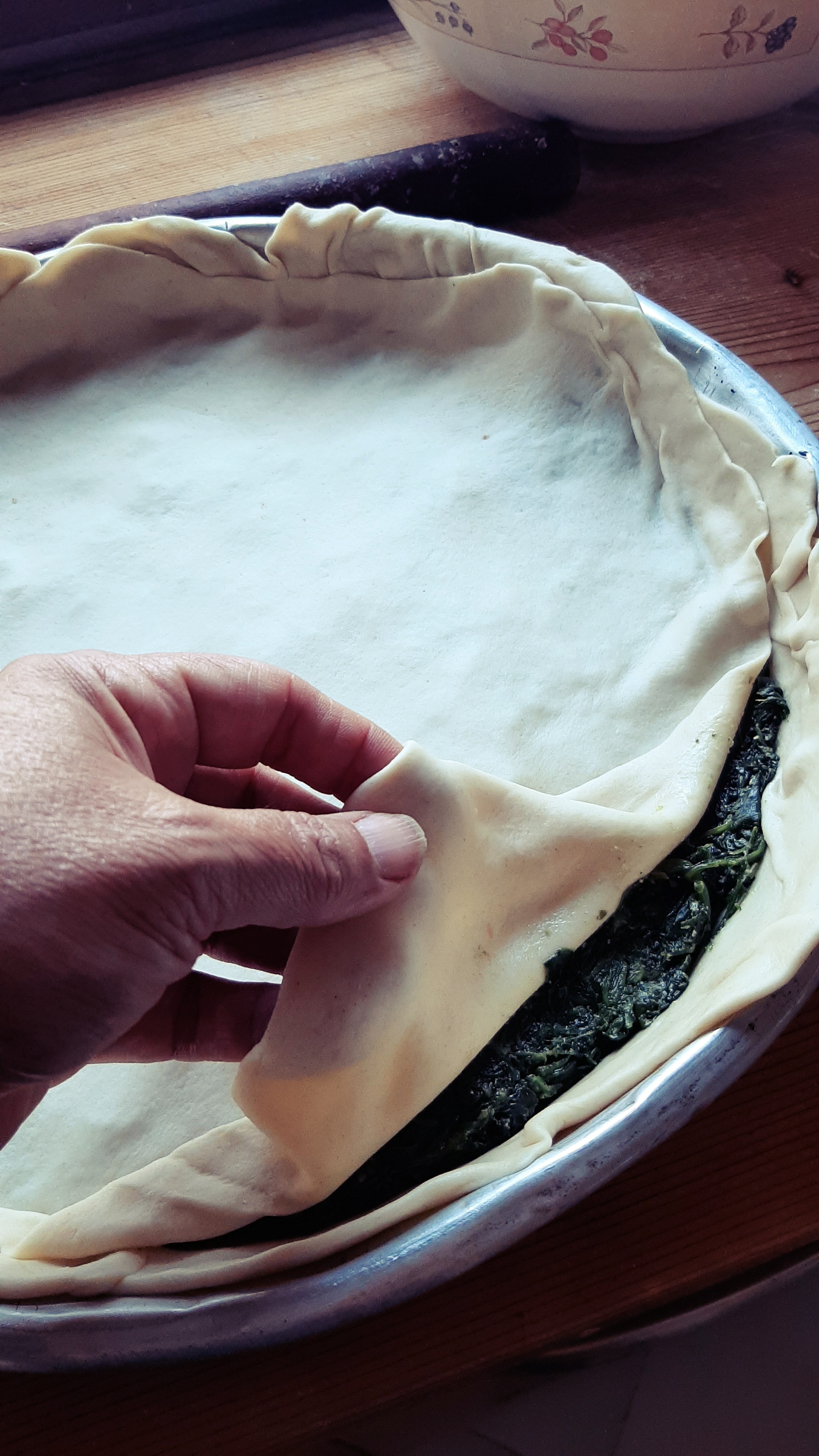 Partiamo dal ripieno che dovrà raffreddare; in una casseruola facciamo appassire gli scalogni tritati finemente con l’olio extra vergine, a fuoco basso. Aggiungiamo gli spinaci (che per comodità abbiamo scelto surgelati… l’Ercolina capirebbe!) e cuociamoli finchè non si sfalderanno. Non dobbiamo aggiungere acqua perché basterà quella rilasciata durante la cottura. Con il coperchio 30 minuti poi senza per far evaporare l’acqua in eccesso. A fine cottura aggiustiamo di sale e da freddi li tritiamo leggermente e uniamo il Parmigiano Reggiano grattugiato.