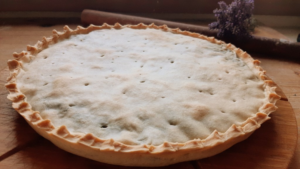 Spennelliamo la teglia con un poco di strutto e dividiamo l’impasto in due parti, una leggermente più grossa dell’altra. Stendiamo la più grossa con il mattarello e foderiamo con questa la teglia; mettiamo il ripieno e livelliamo bene e copriamo il tutto con il resto dell’impasto tirato sempre a mattarello. Bucherelliamo la superficie per evitare rigonfiamenti e spennelliamola sempre con un velo di strutto.