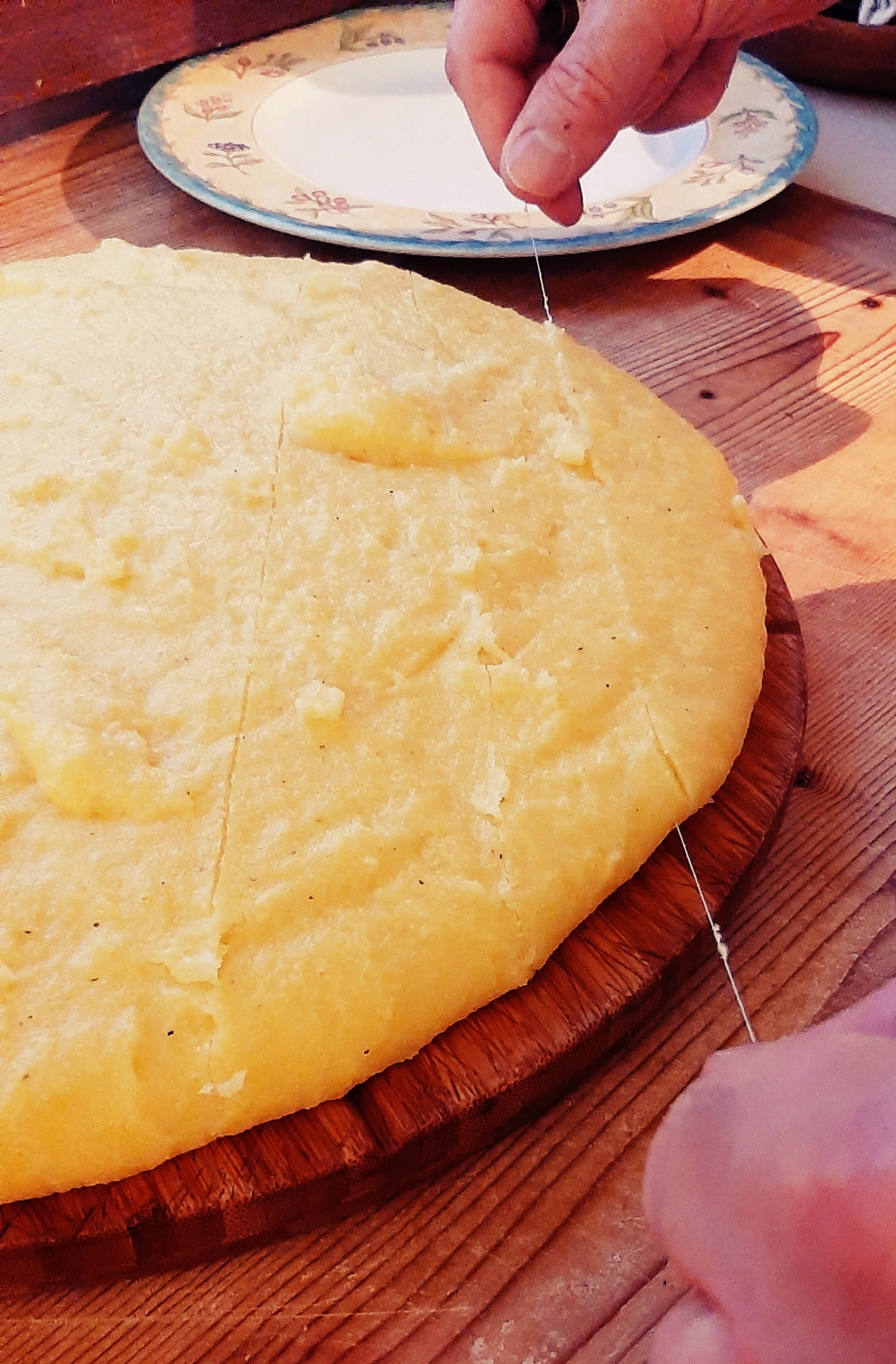Dopo aver mescolato per un’ora abbondante di continuo per non “farla attaccare”, si rovesciava quella colata di oro giallo su un tagliere di legno rotondo, compattando con il dorso del cucchiaio i bordi, per evitare che tracimassero fuori dal tagliere.