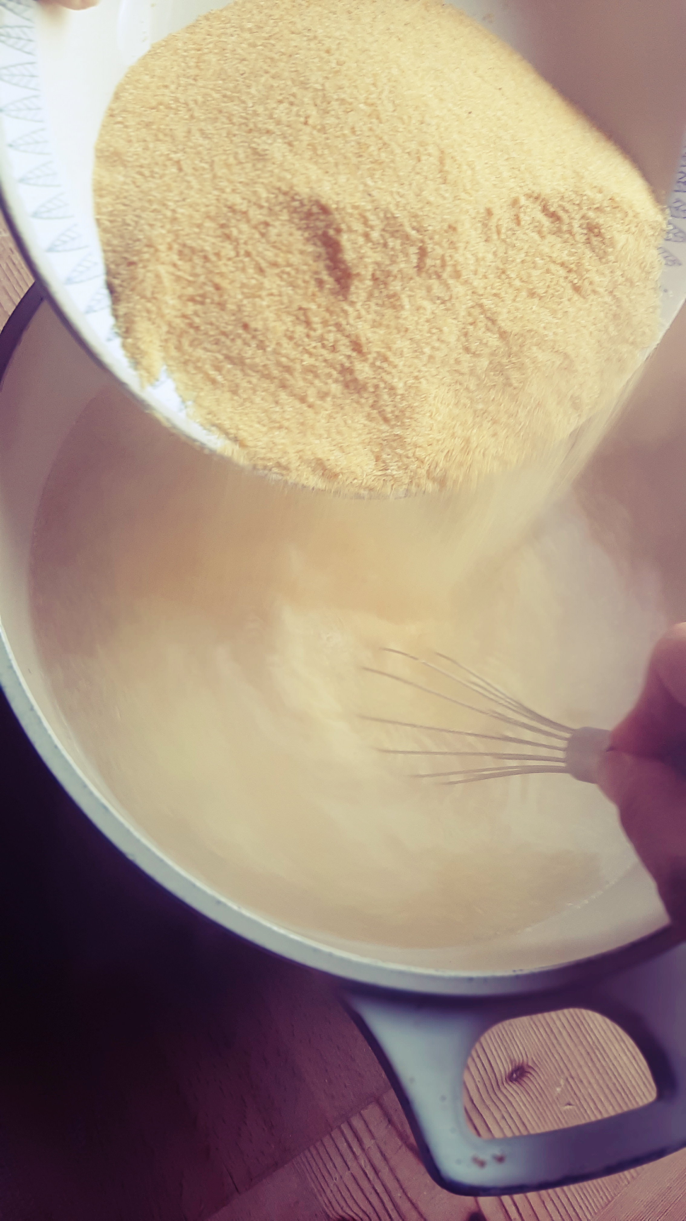 Portare ad ebollizione l’acqua e salarla; formare un mulinello con la frusta e versare a pioggia la farina di mais continuando a mescolare per evitare grumi.