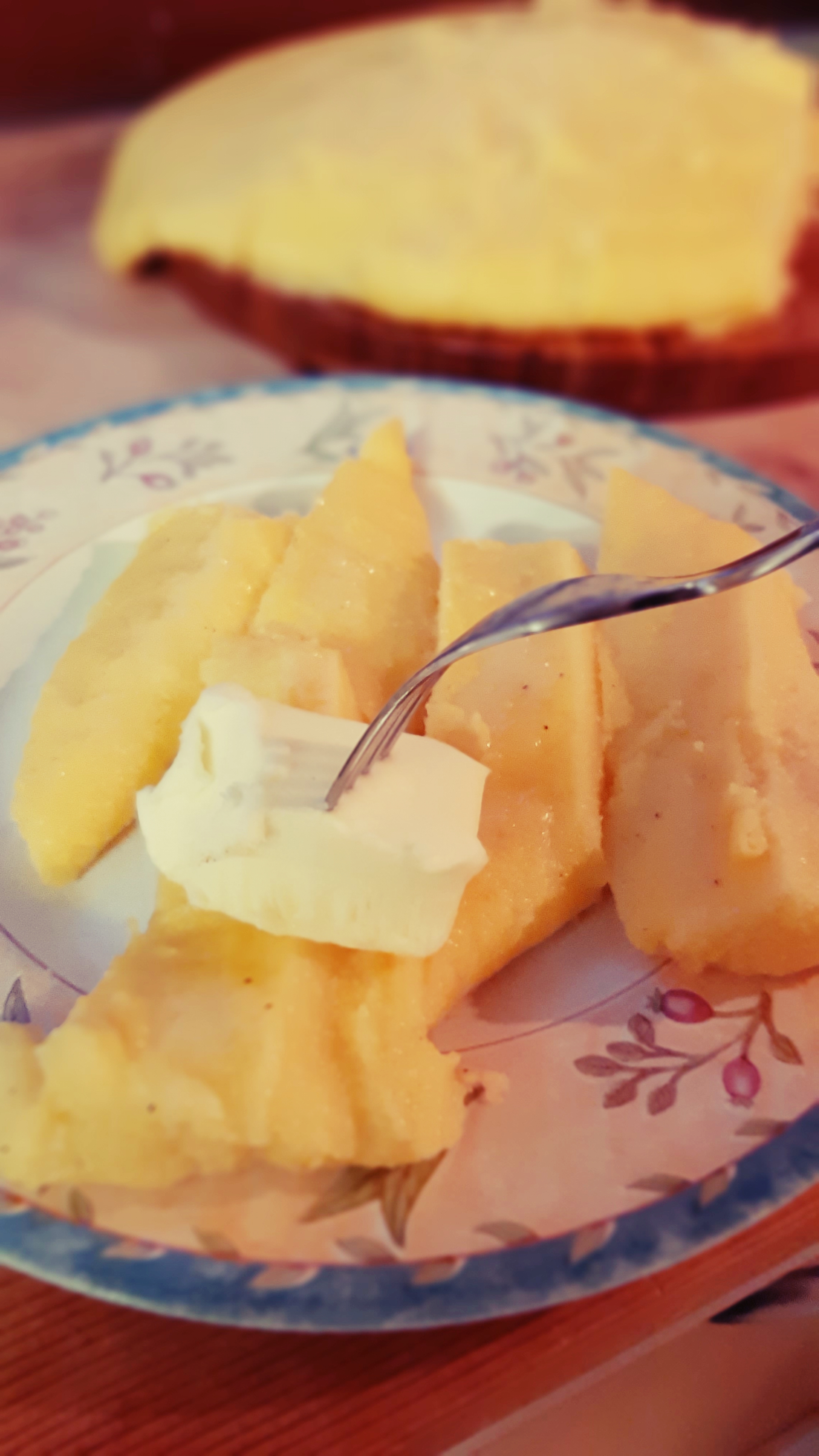 ….e il giorno dopo, quando sarà ben fredda, si può tagliare a cubettoni e passare in forno oppure sulla piastra o, peccato sublime, tagliarla a listarelle e friggerla in abbondante olio di semi e scolarla.