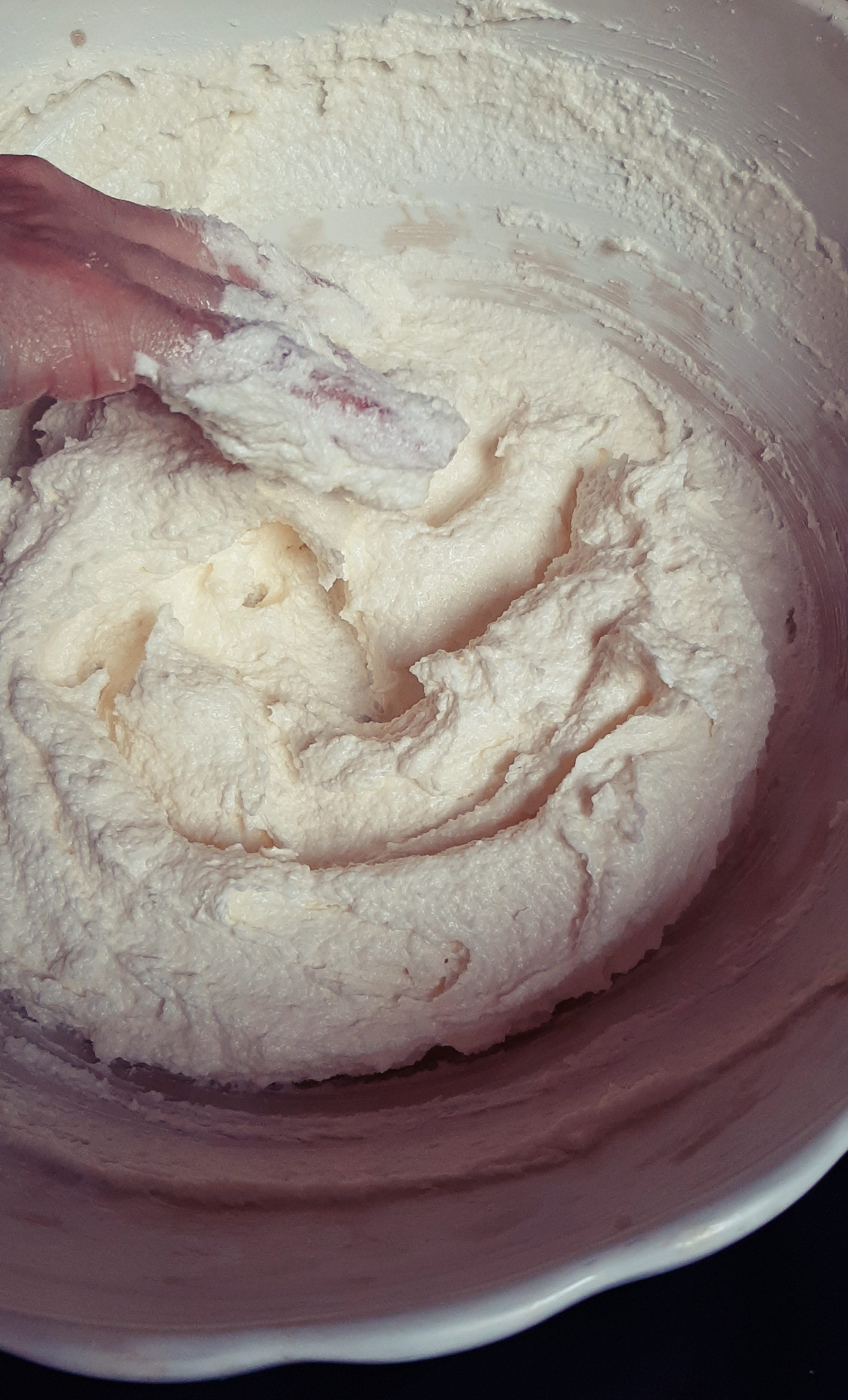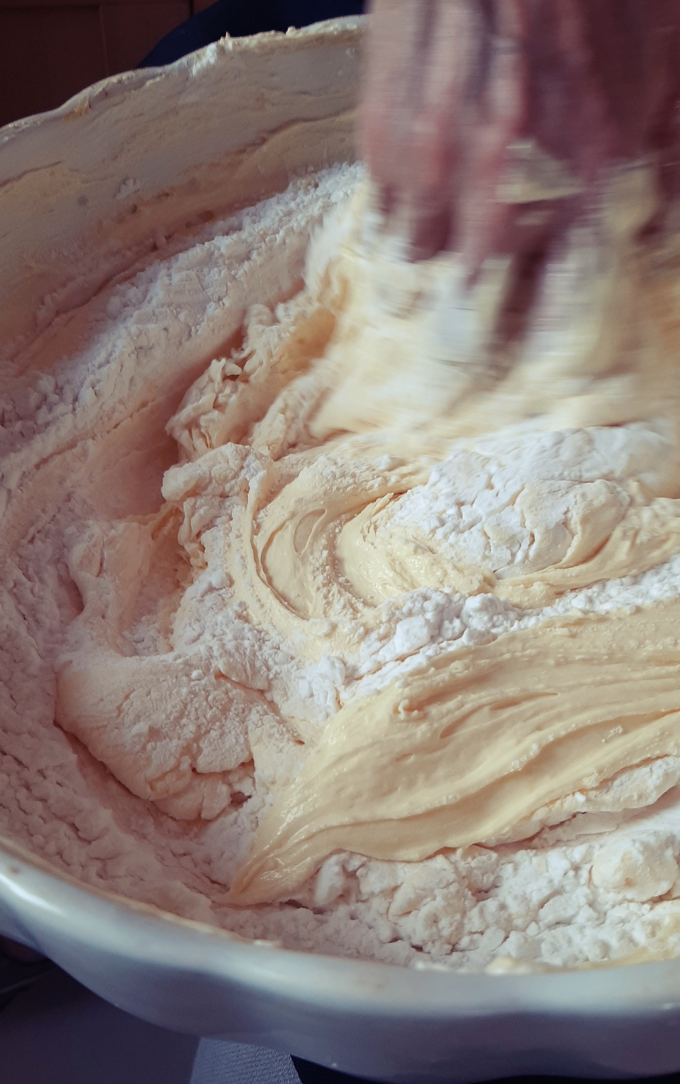 Poi è la volta delle polveri (fecola, farina e lievito) non setacciati (la nonna non setacciava!!!!) ma aggiunti pian piano a 3 o 4 cucchiaiate alla volta.