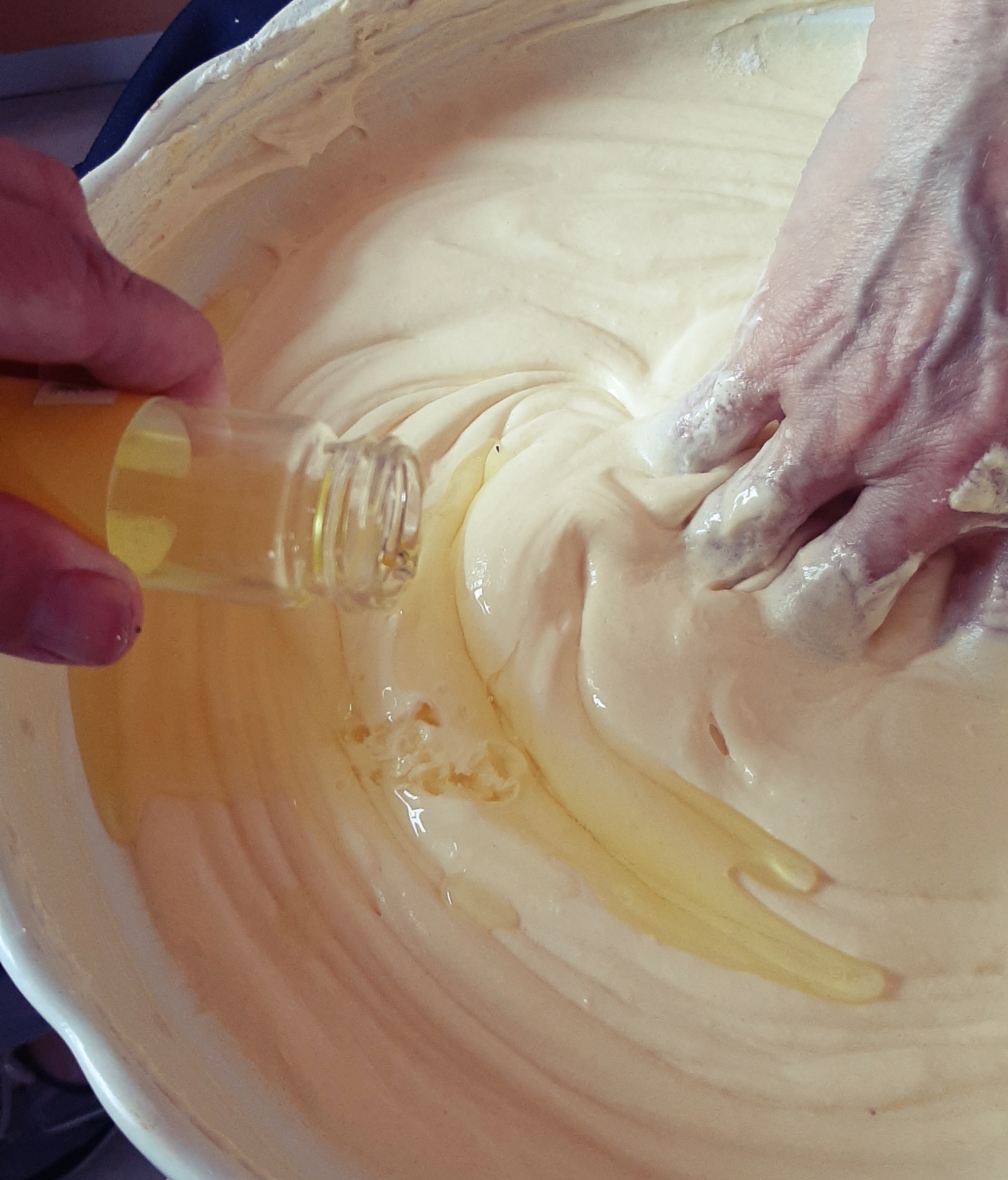 Per ultimo il liquore e appena assorbito dall’impasto via nella teglia imburrata e infarinata…. ovviamente con la mano!