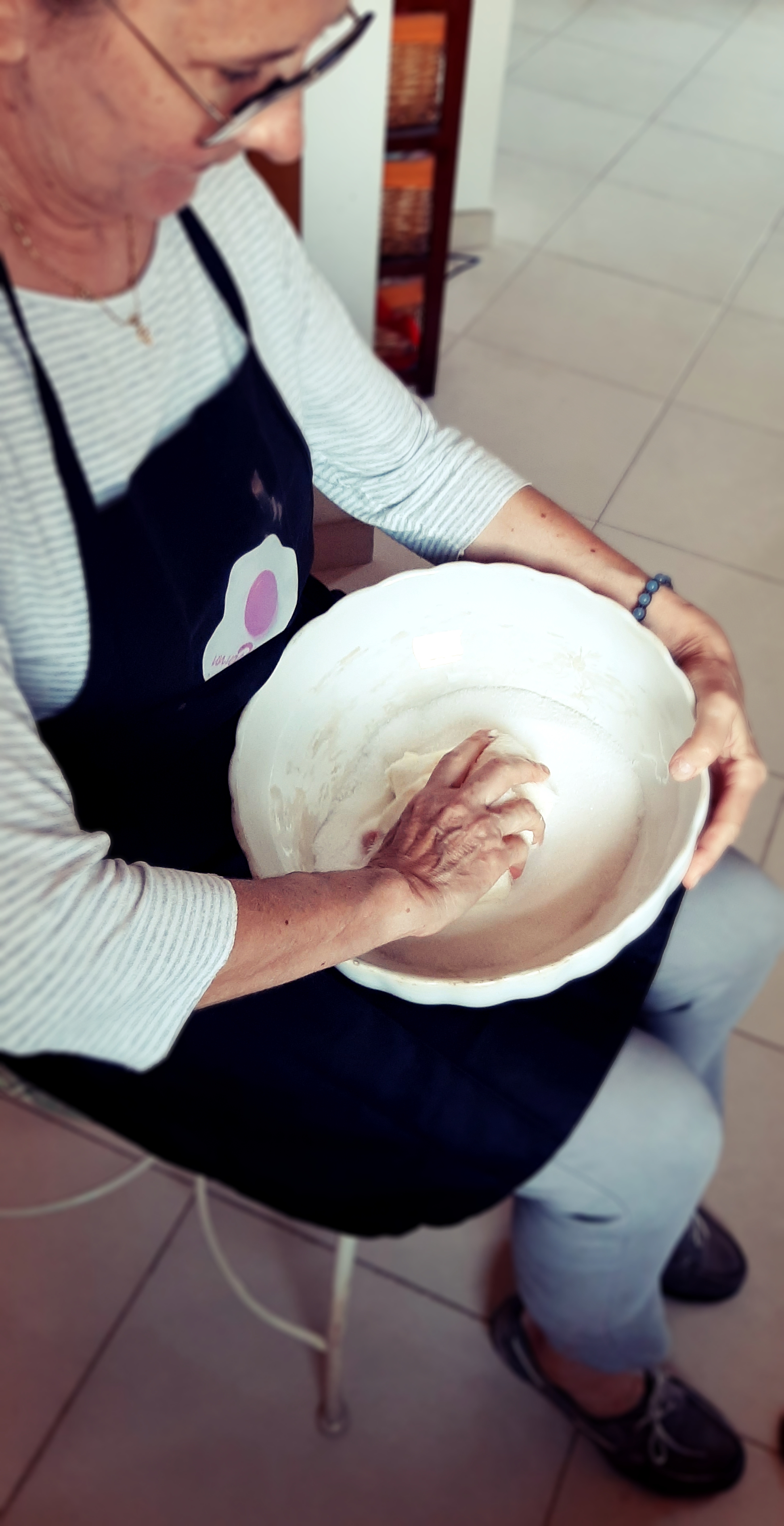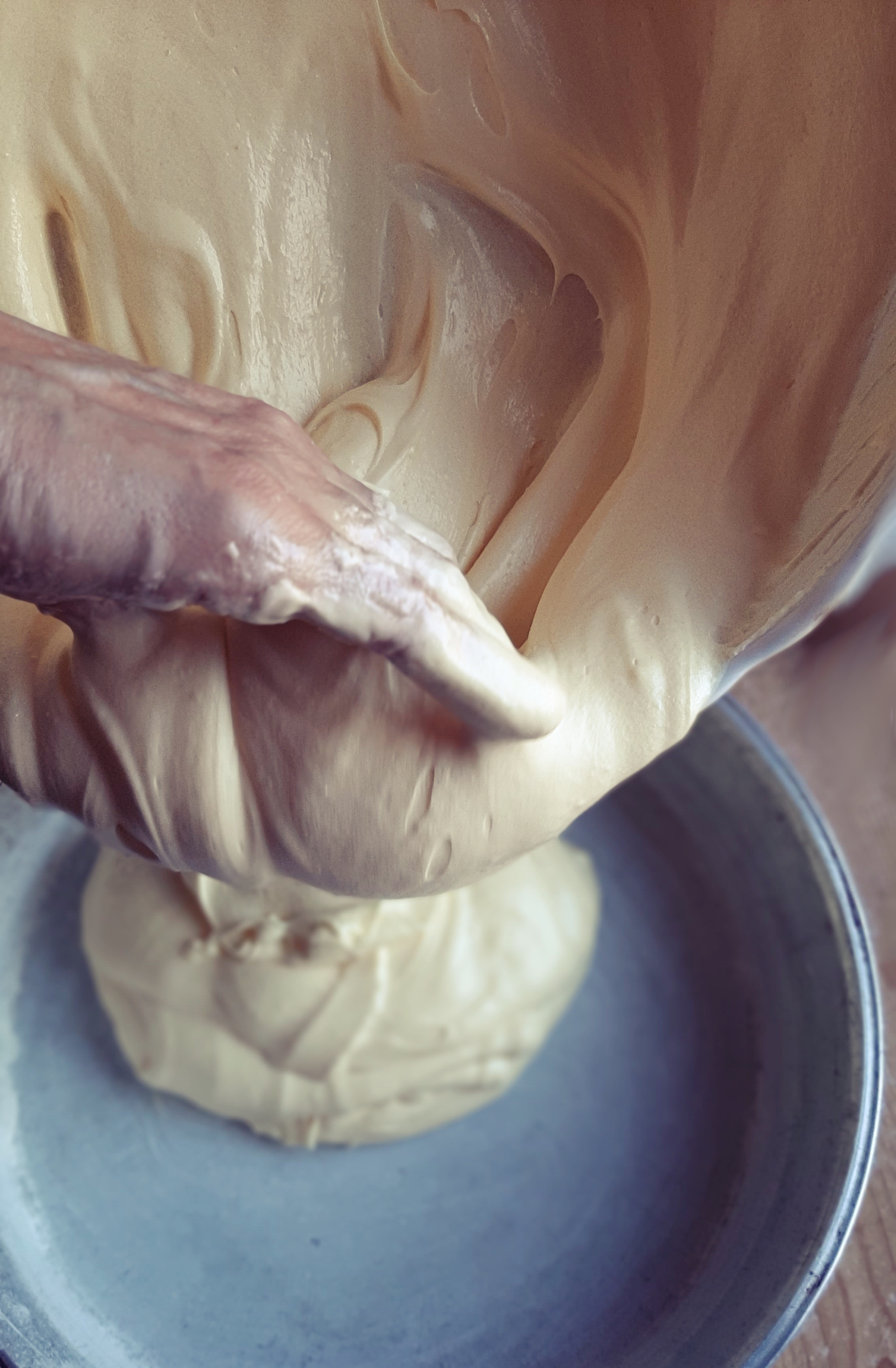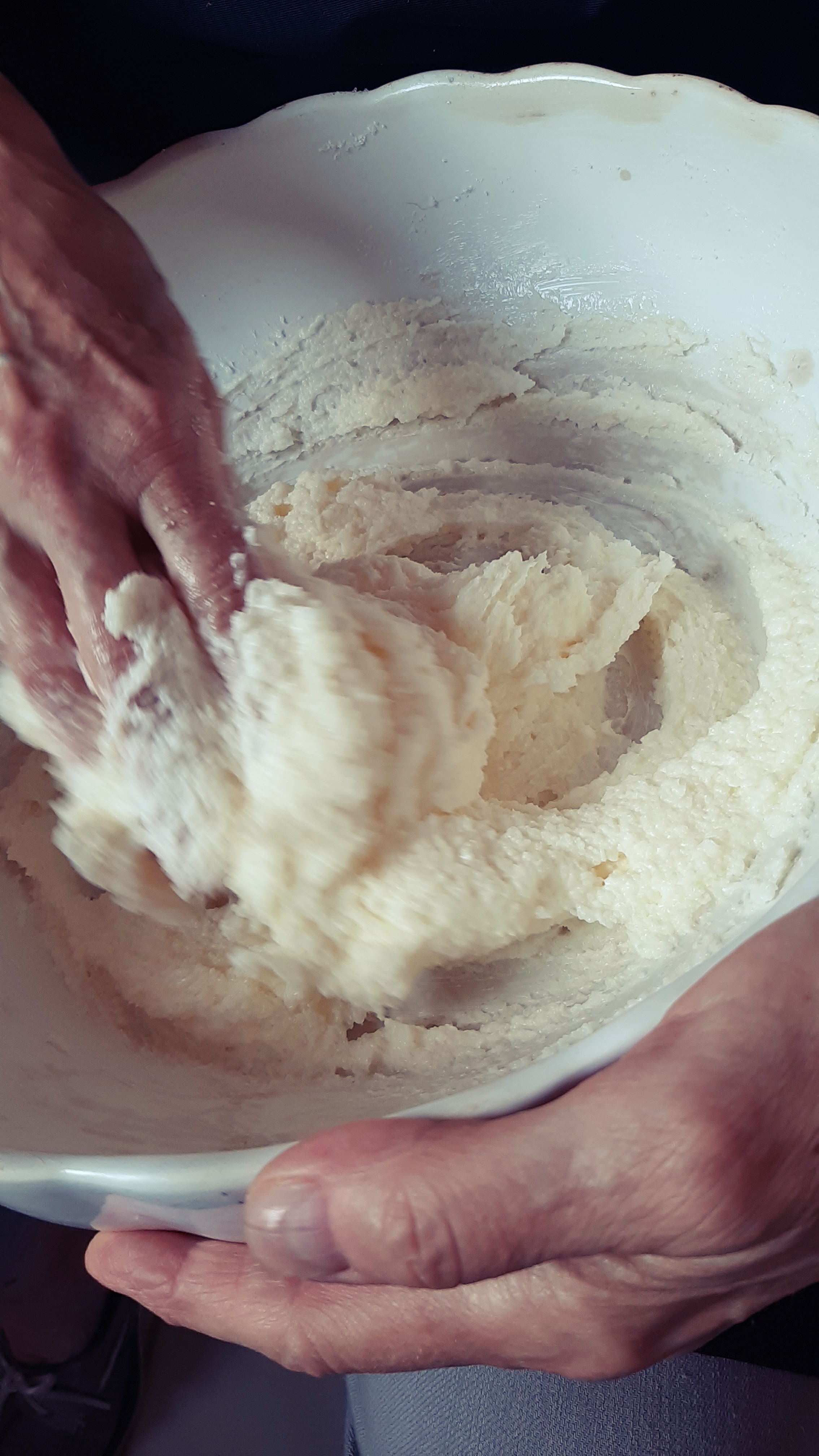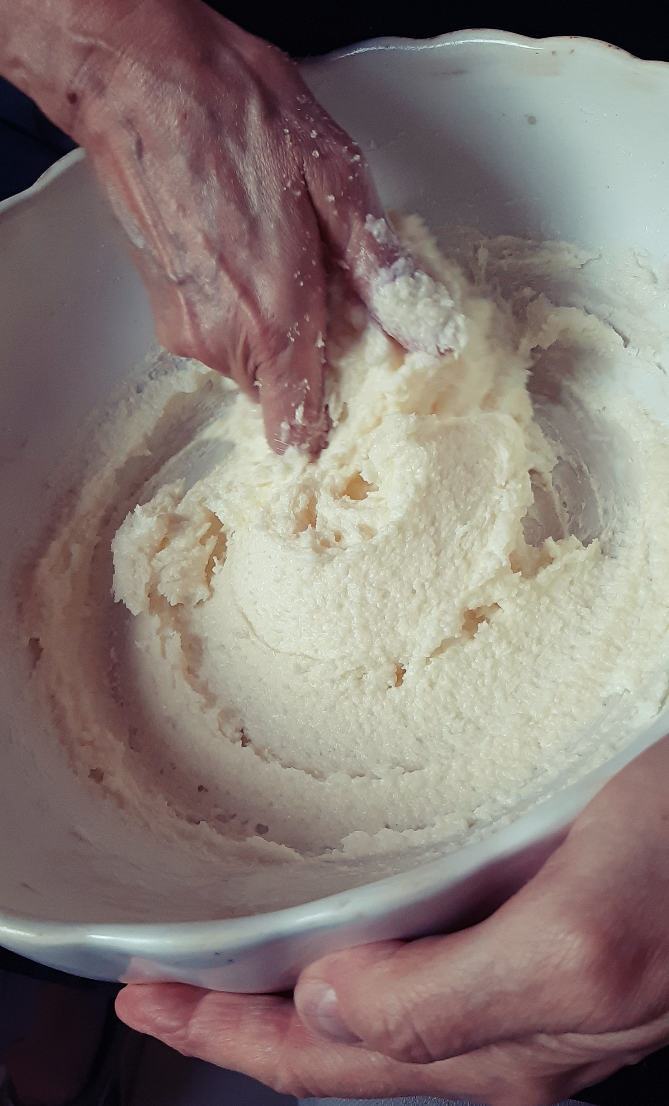 Si comincia a lavorare in una ciotola il burro bello morbido (non deve essere sciolto!) e lo zucchero, sedendosi con la ciotola appoggiata alle gambe e lavorando con una sola mano, possibilmente sempre nello stesso senso.