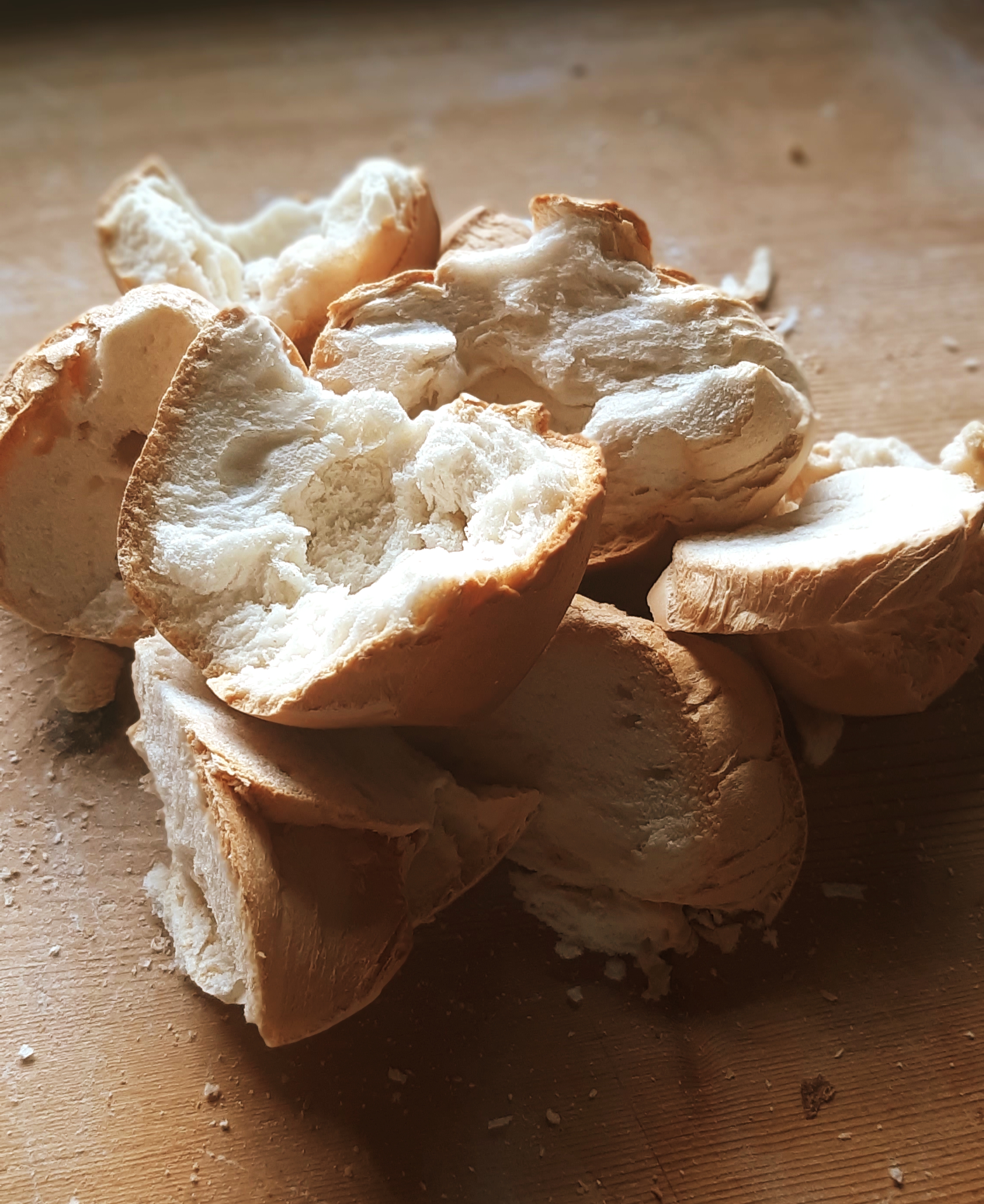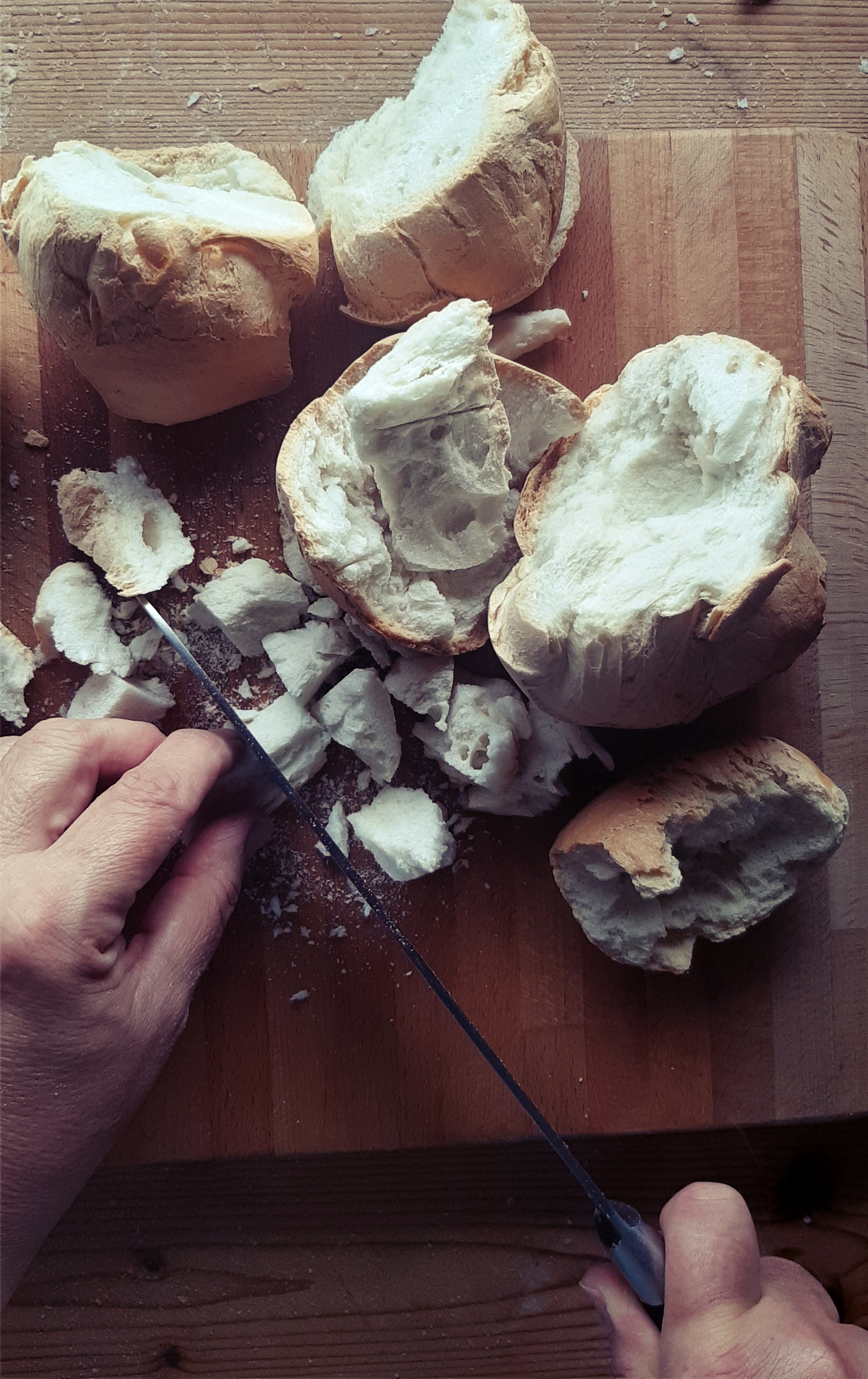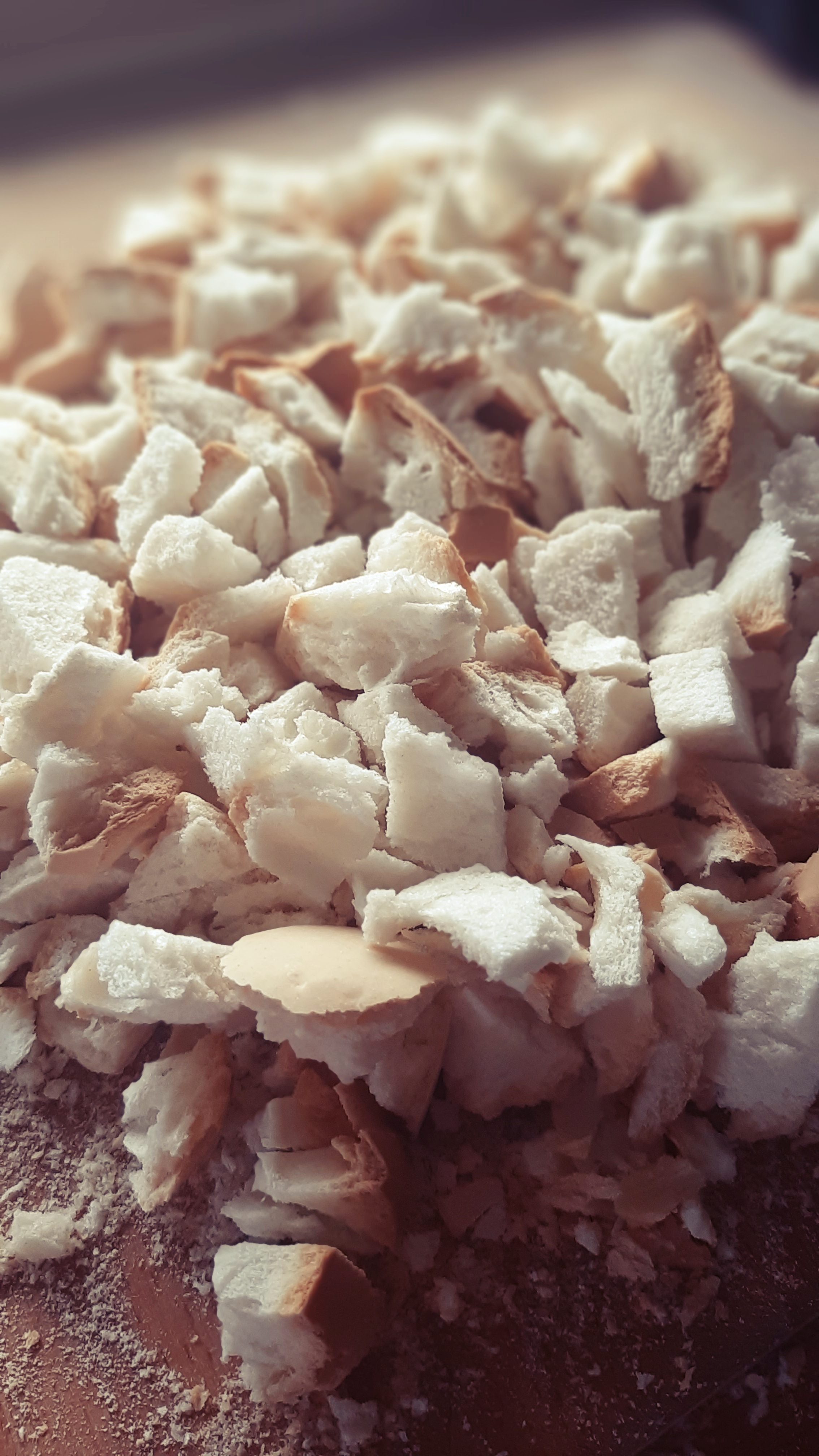 Procedimento semplicissimo: tagliamo il pane a pezzettini piuttosto piccoli; noi avevamo la classica micca di Parma.