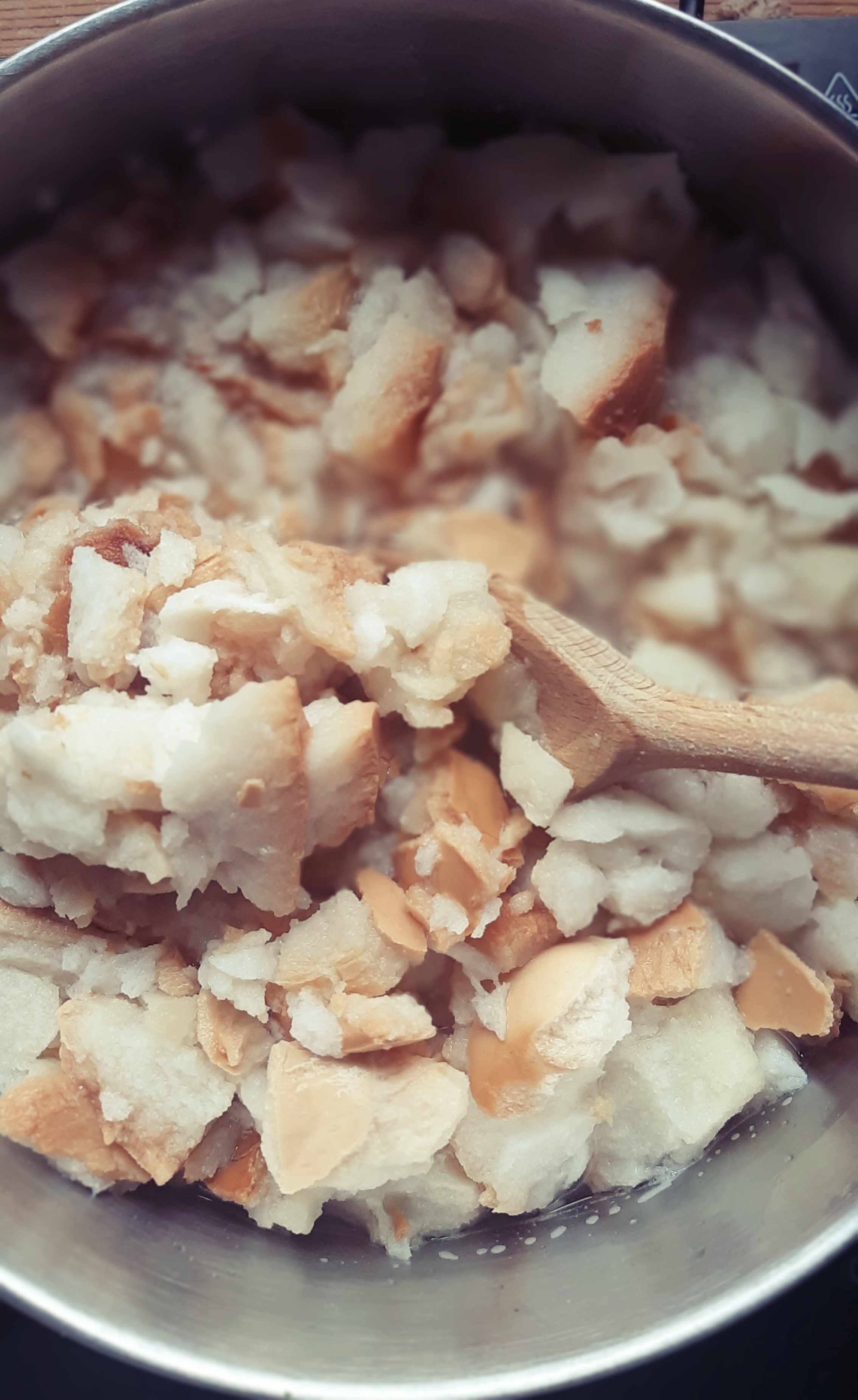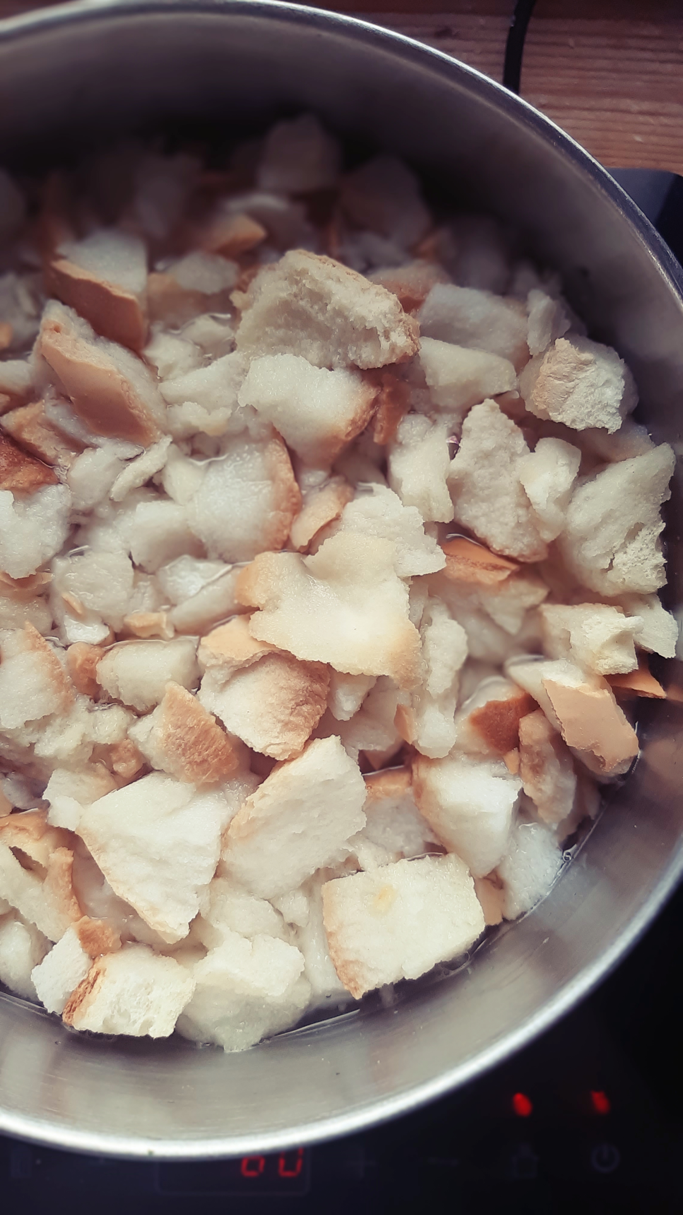 Mettiamo tutto il pane in un tegame e aggiungiamo tutta l’acqua; cominciamo a cuocere prima con fiamma vivace per poi abbassare e fare sobbollire il tutto circa un’oretta, mescolando di tanto in tanto per evitare che si attacchi al fondo della pentola.