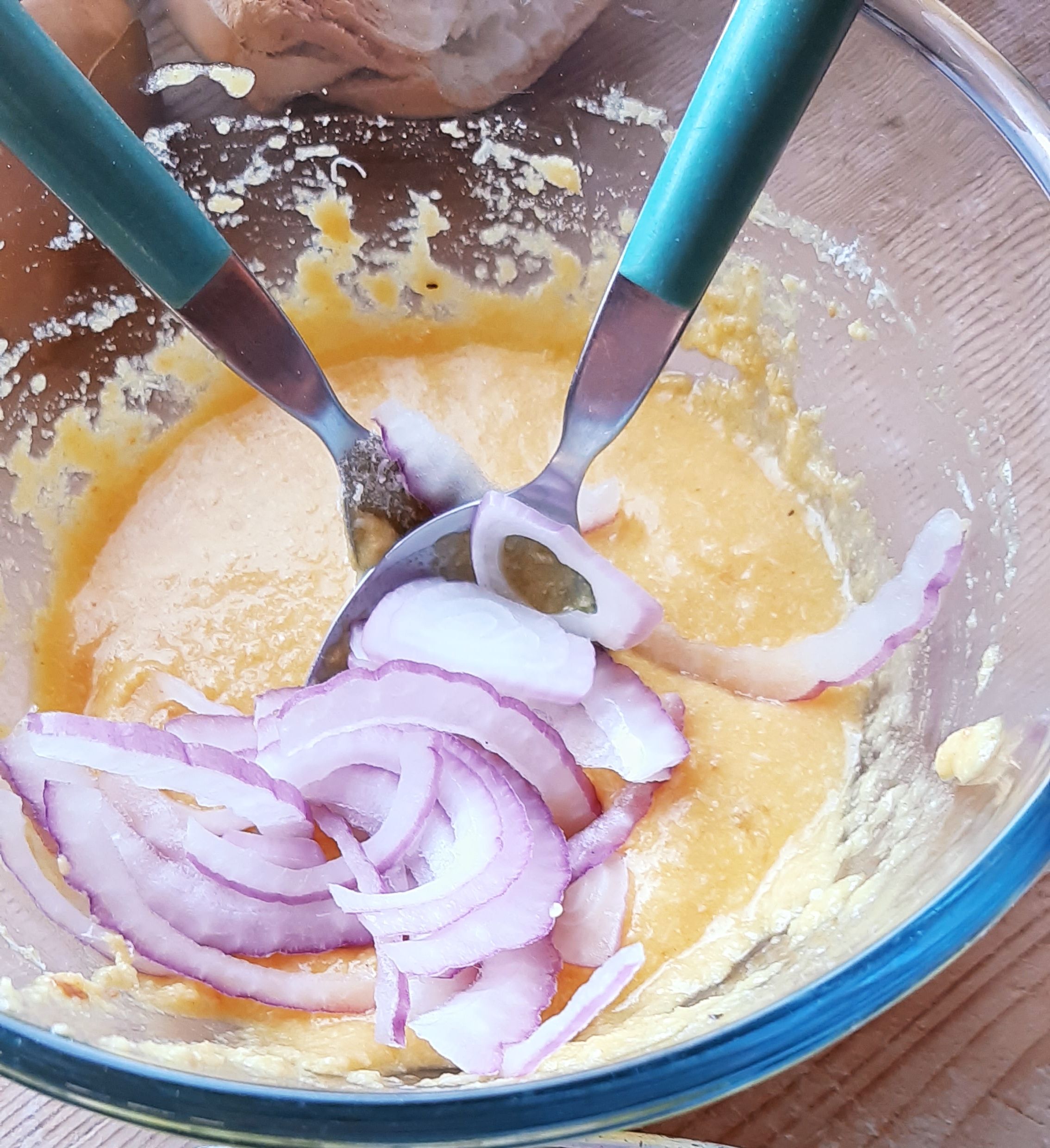 Se le volete preparare con le cipolle, basta tagliarle a fettine sottili e unirle crude all’impasto.