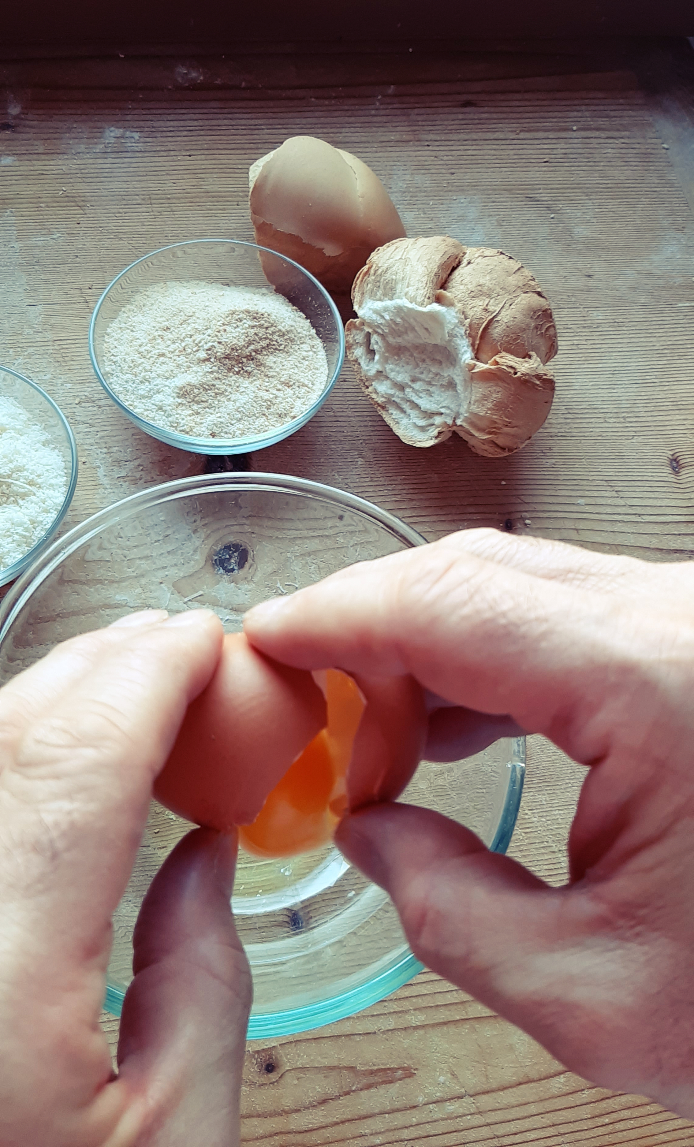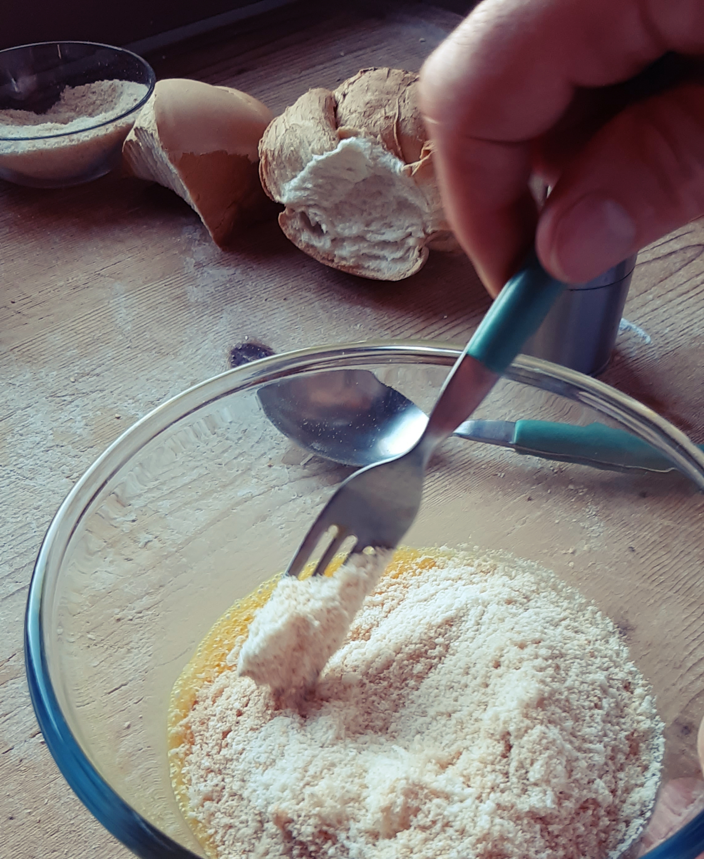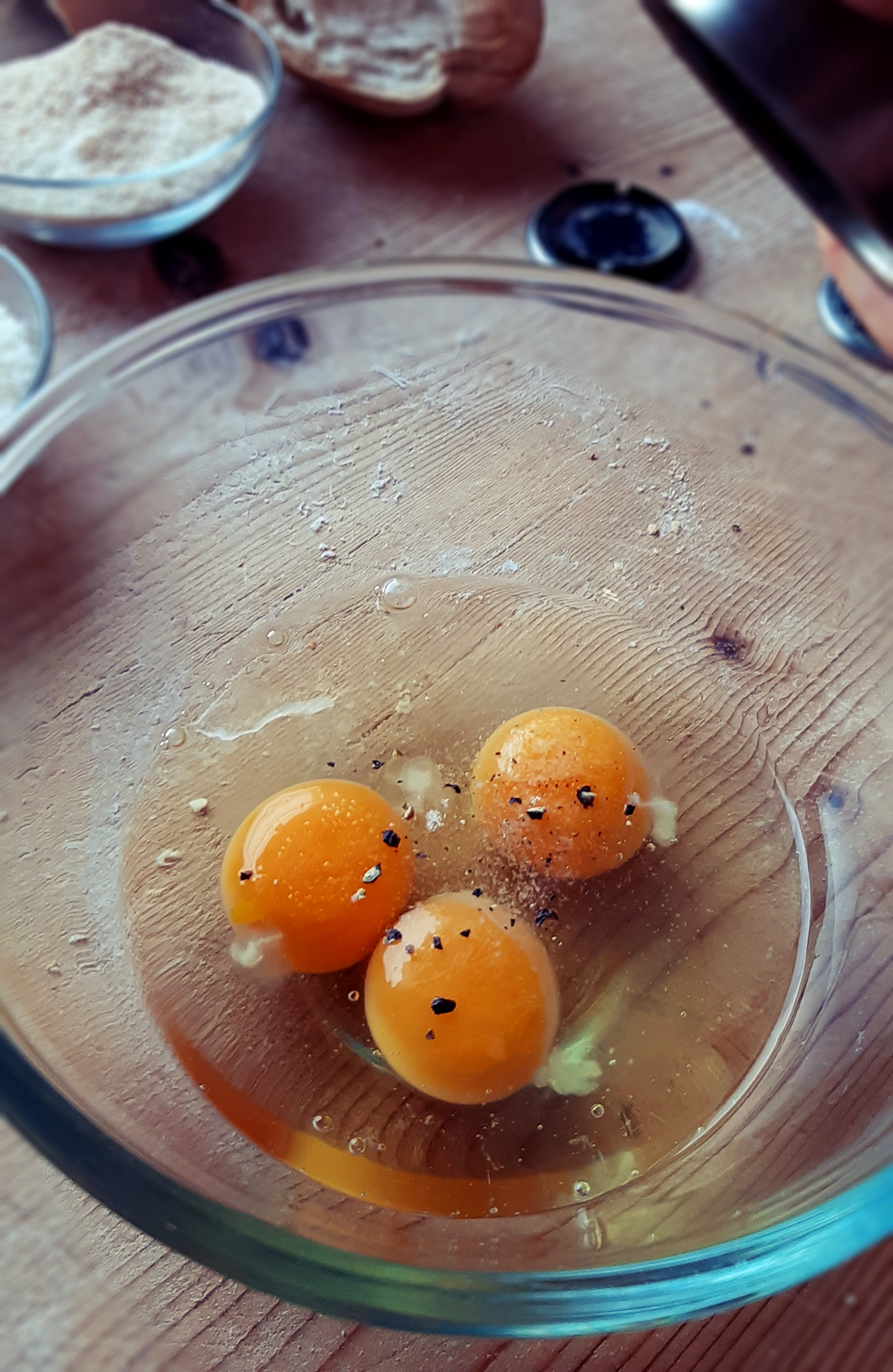 Rompiamo le uova in una terrina e cominciamo a romperle con i rebbi della forchetta, girando velocemente e in modo energico per circa un minuto.