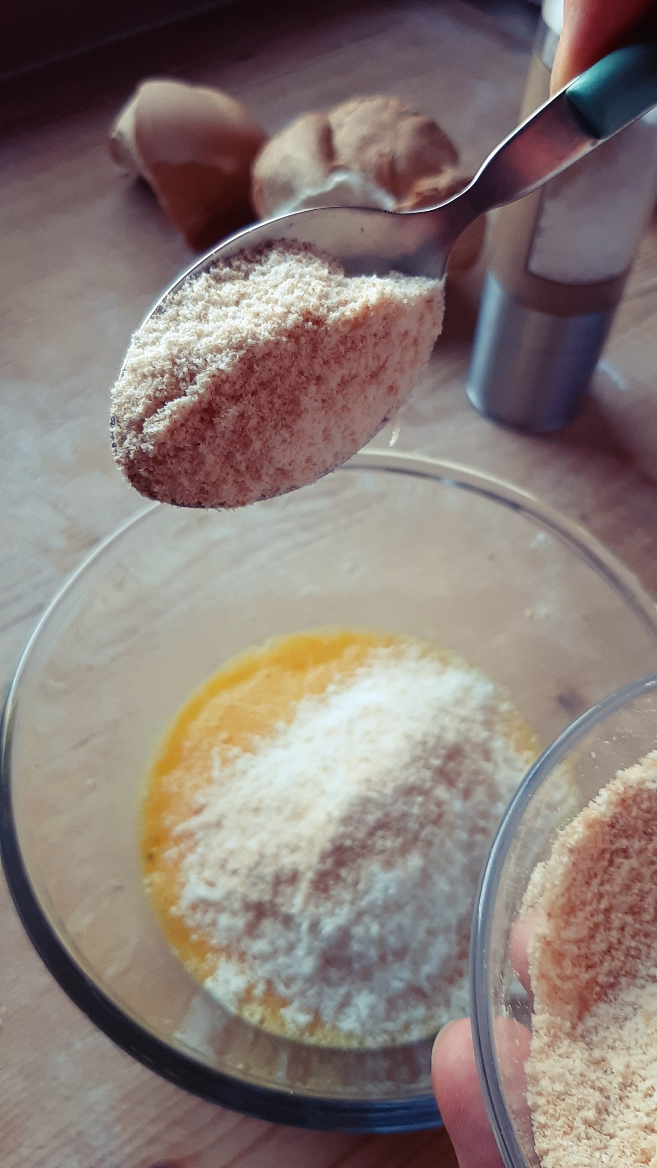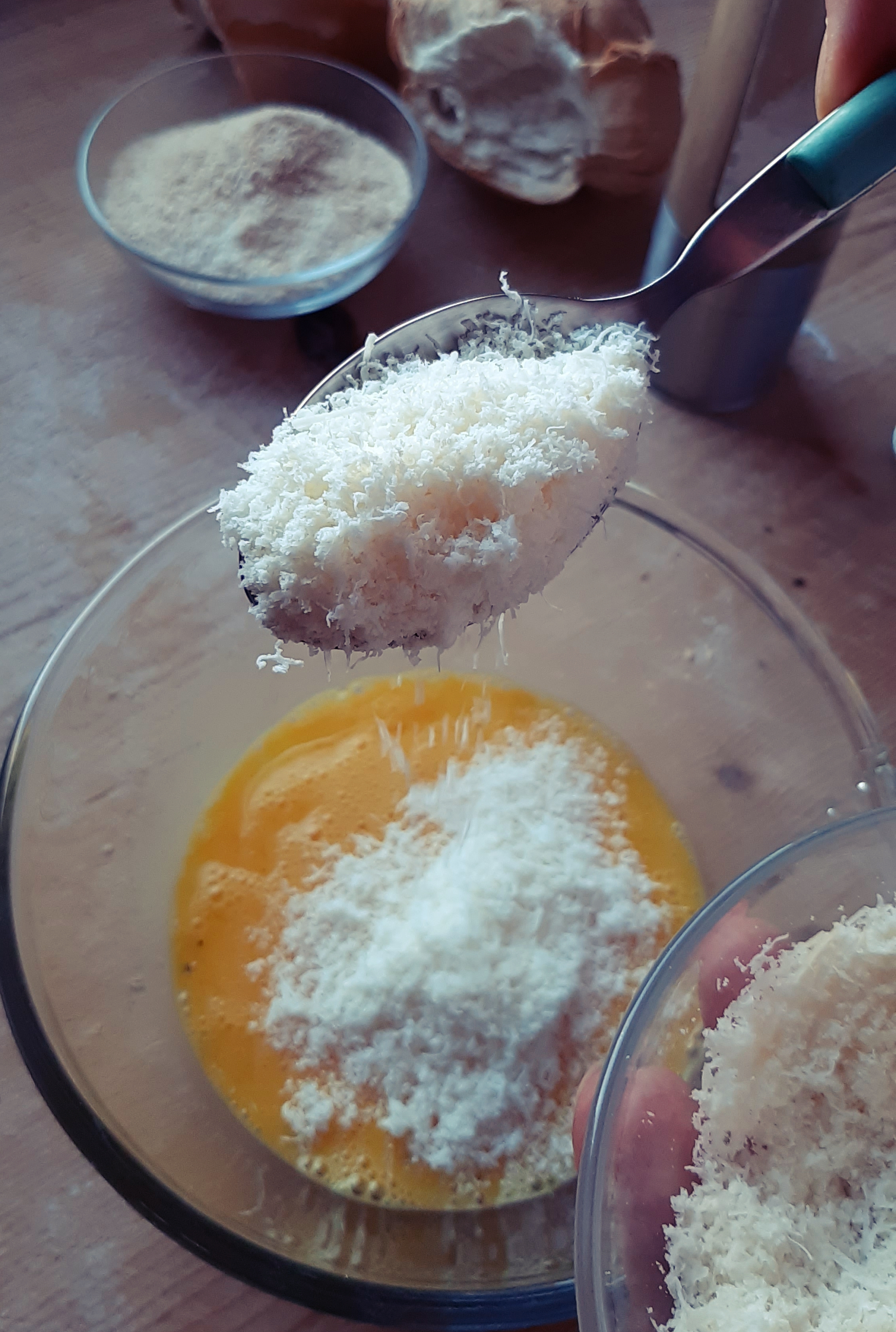 Aggiungiamo il Parmigiano e il pane grattugiati e mescoliamo bene il tutto; la consistenza varierà naturalmente dalla grandezza delle uova. Tenetevi sempre pronto un cucchiaio in più di parmigiano e di pane se dovessero servire, calcolando che la consistenza dovrà essere abbastanza solida, come una crema pasticciera per capirci, non liquida come l’omelette.