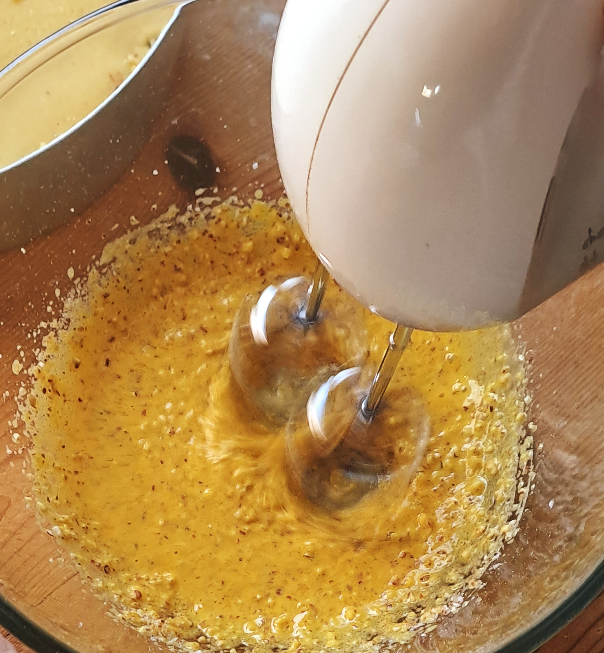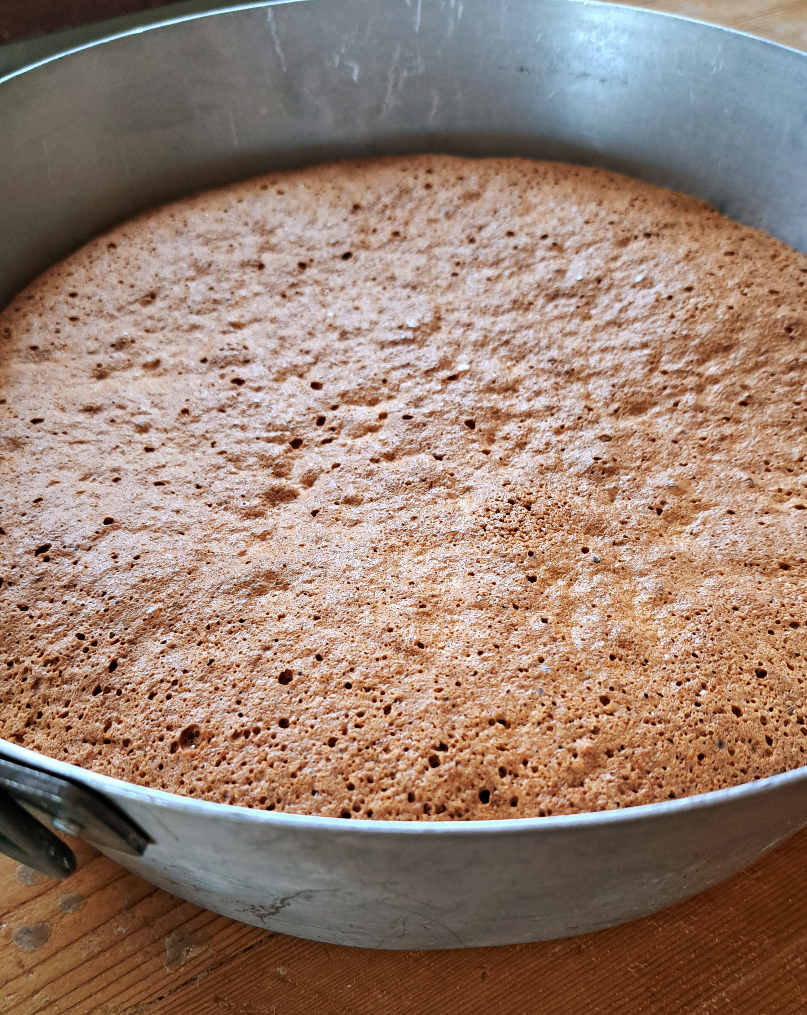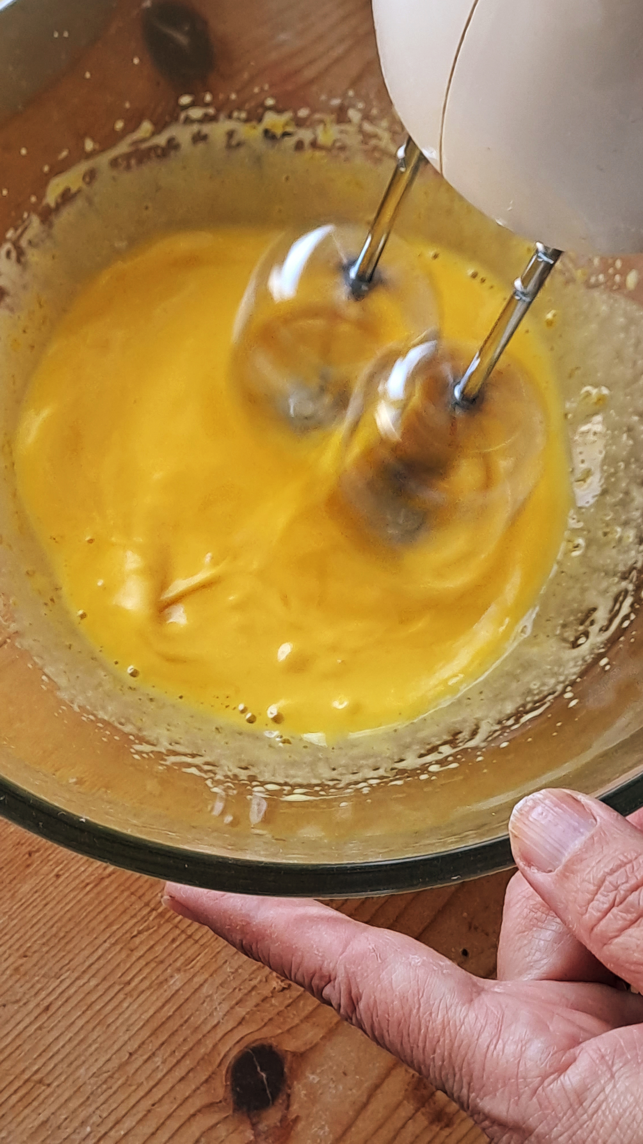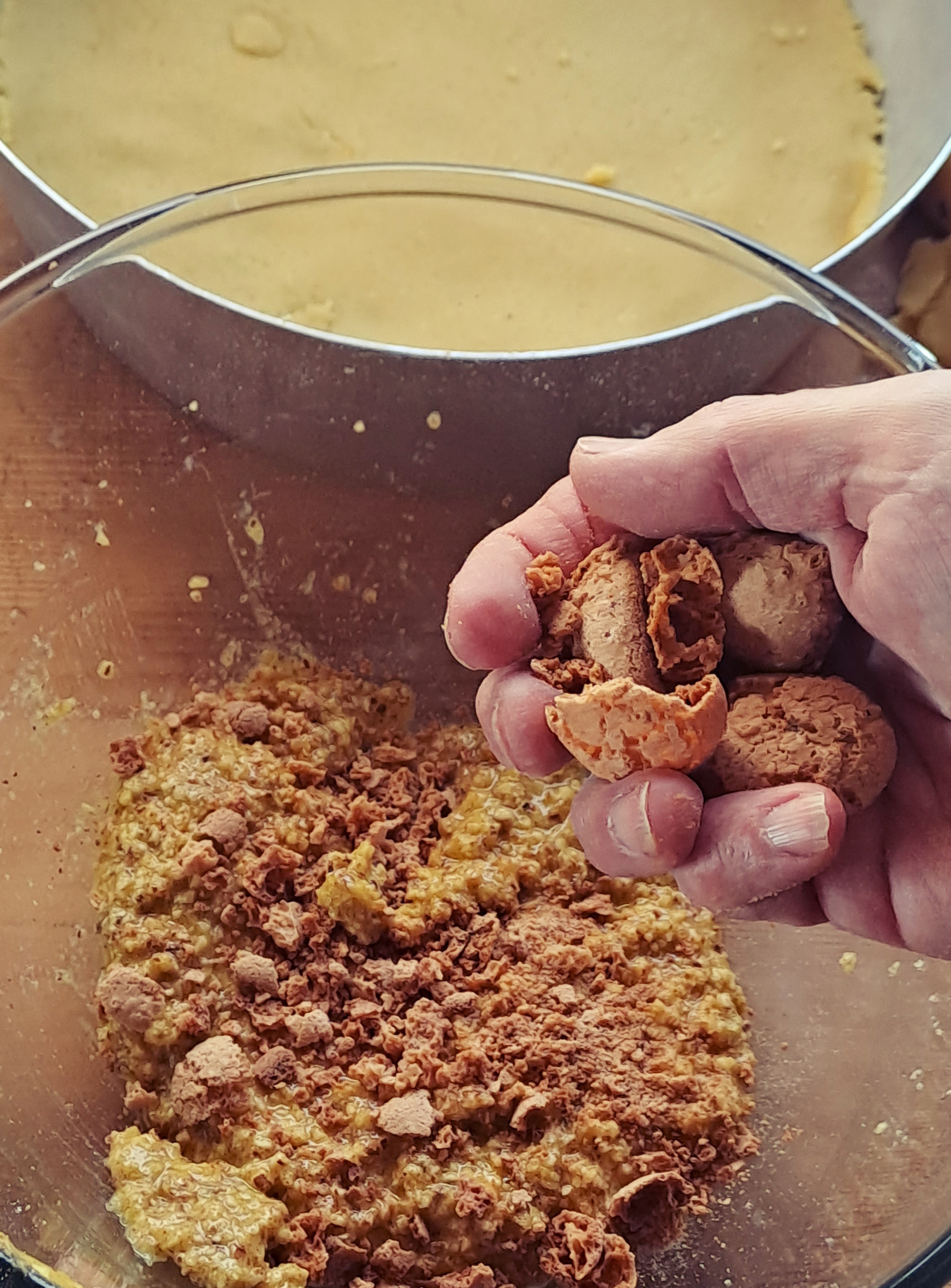 Tritiamo le mandorle finemente, poi separiamo gli albumi dai tuorli e montiamo questi ultimi con lo zucchero finchè non risulta un composto bello spumoso. Uniamo le mandorle e gli amaretti tritati, aggiungiamo un goccio di liquore e amalghiamiamo, poi montiamo gli albumi a neve e li aggiungiamo delicatamente all’impasto, mescolando con una spatola dall’alto verso il basso.