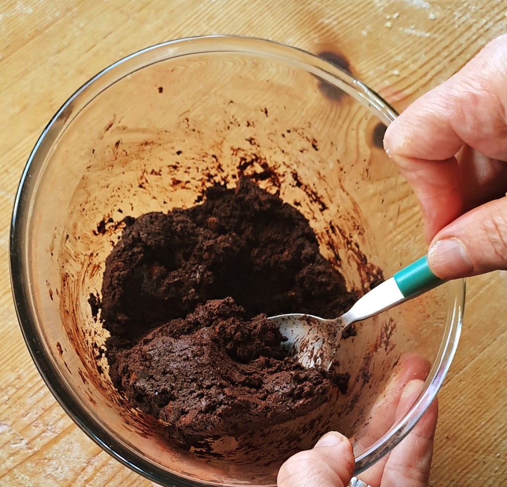 Mentre la pasta frolla riposa in frigorifero, prepariamo il ripieno al cacao; mettiamo insieme tutti gli ingredienti fino ad ottenere un composto ne troppo solido, ne troppo liquido. Noi abbiamo aggiunto solo liquore per arrivare alla consistenza desiderata, e questo dipense sempre molto dal tipo di cacao usato. Vi possiamo assicurare che l’aroma risulterà anche dopo la cottura, perciò se avete bambini o se non vi piace molto l’aroma del liquore potete sostituire metà liquido con un goccio di latte…. anche se negli anni ’70 noi bimbi mangiavamo anche i dolci con il liquore, ma questo è un altro discorso!