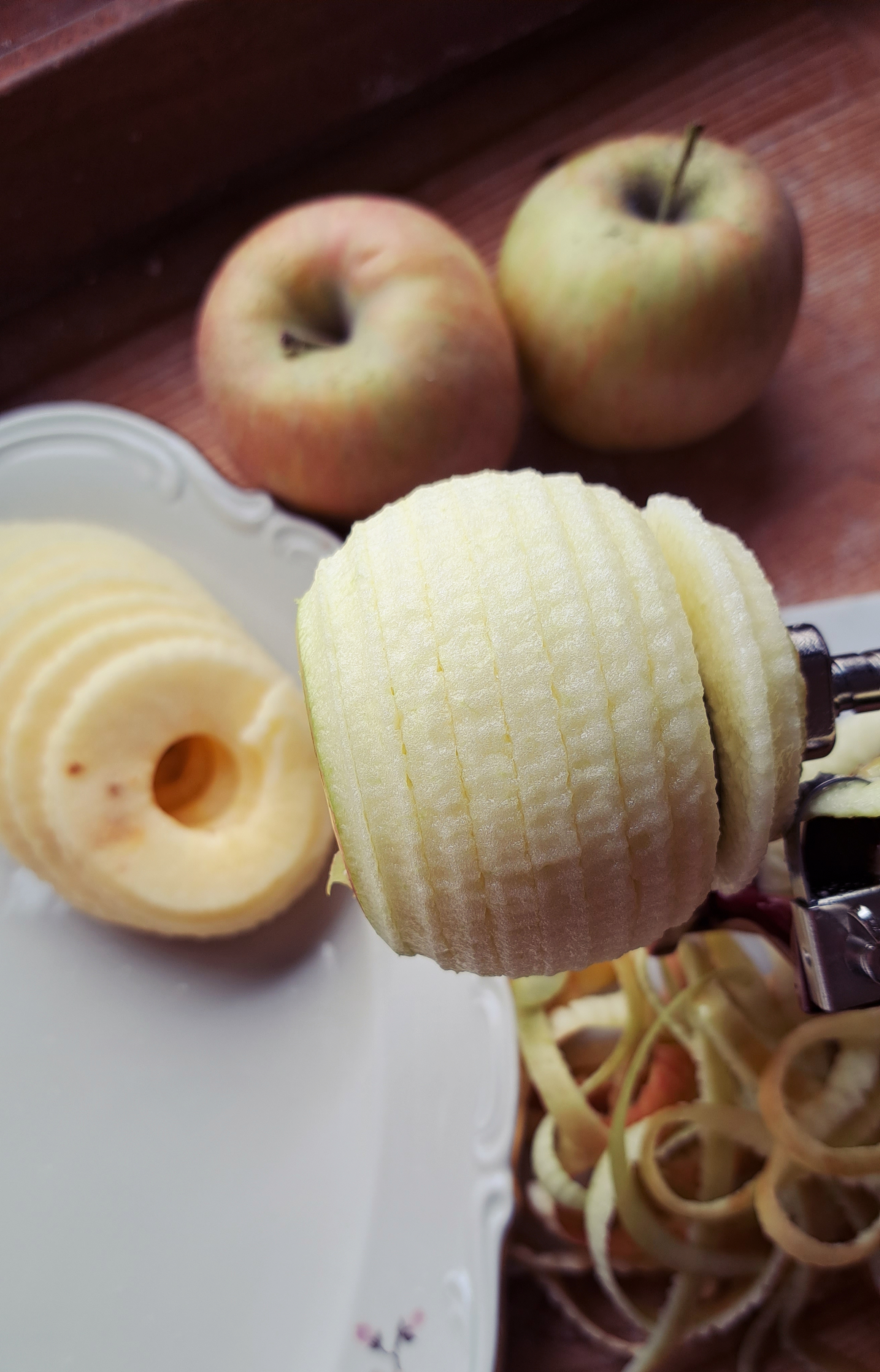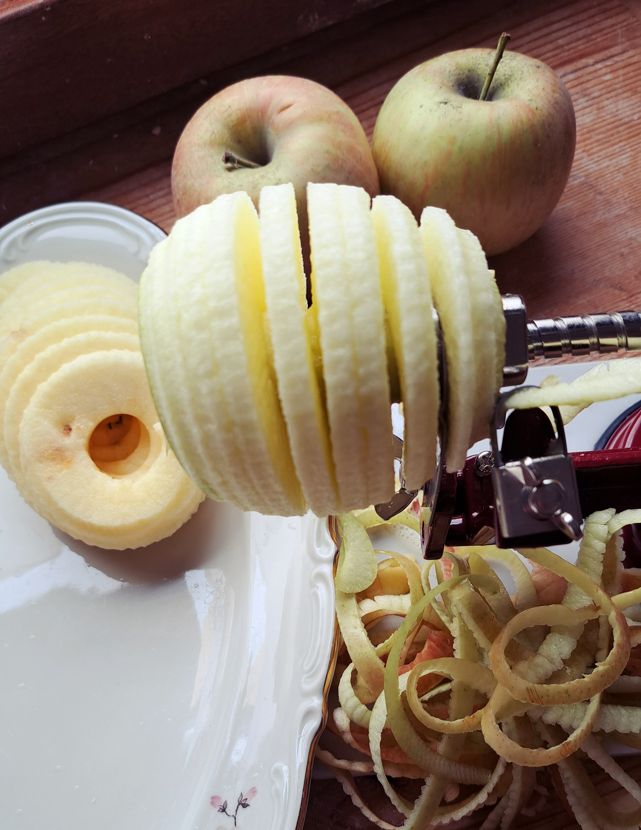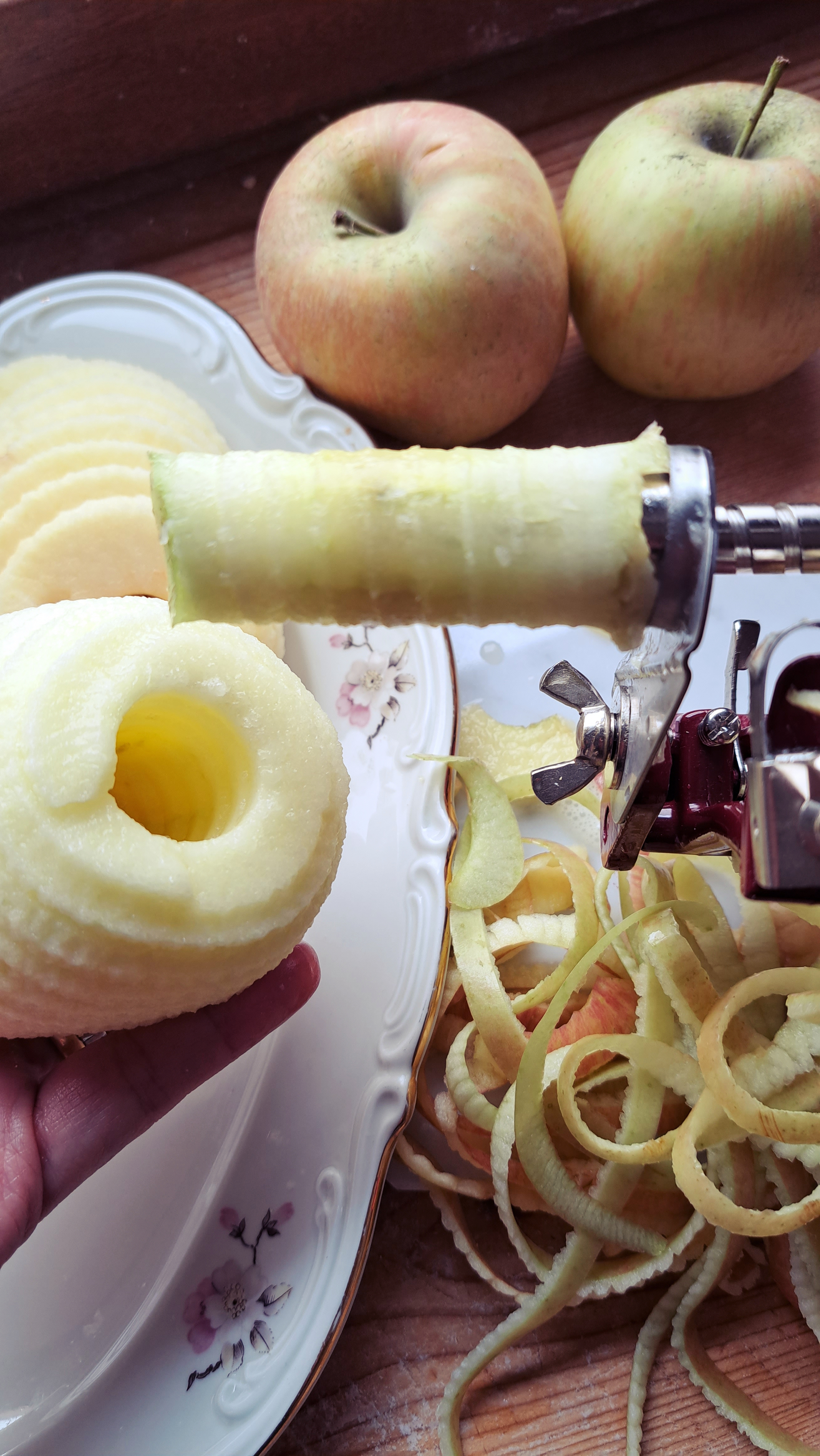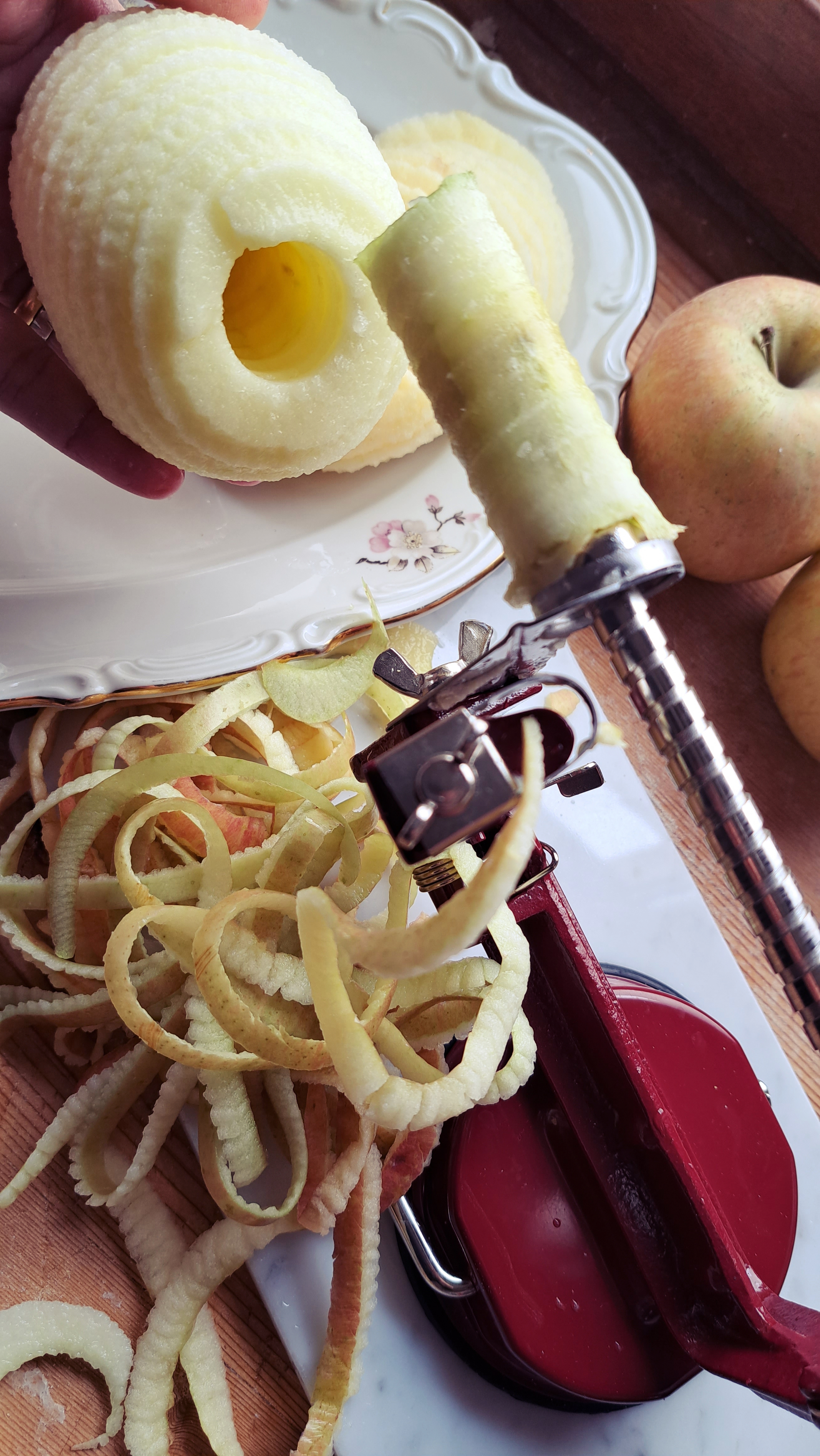 Tagliamo le mele… e qui vi sfoderiamo un popò di attrezzo che sappiamo già ci invidierete! Grazie alla strumentistica fornita dallo zio Primo, abbiamo potuto testare (ed apprezzare tantissimo!!) il magnifico pela mele che nel frattempo ci leva anche il torsolo e ci fatrovare le nostre mele già tagliate a spirale… un lusso!