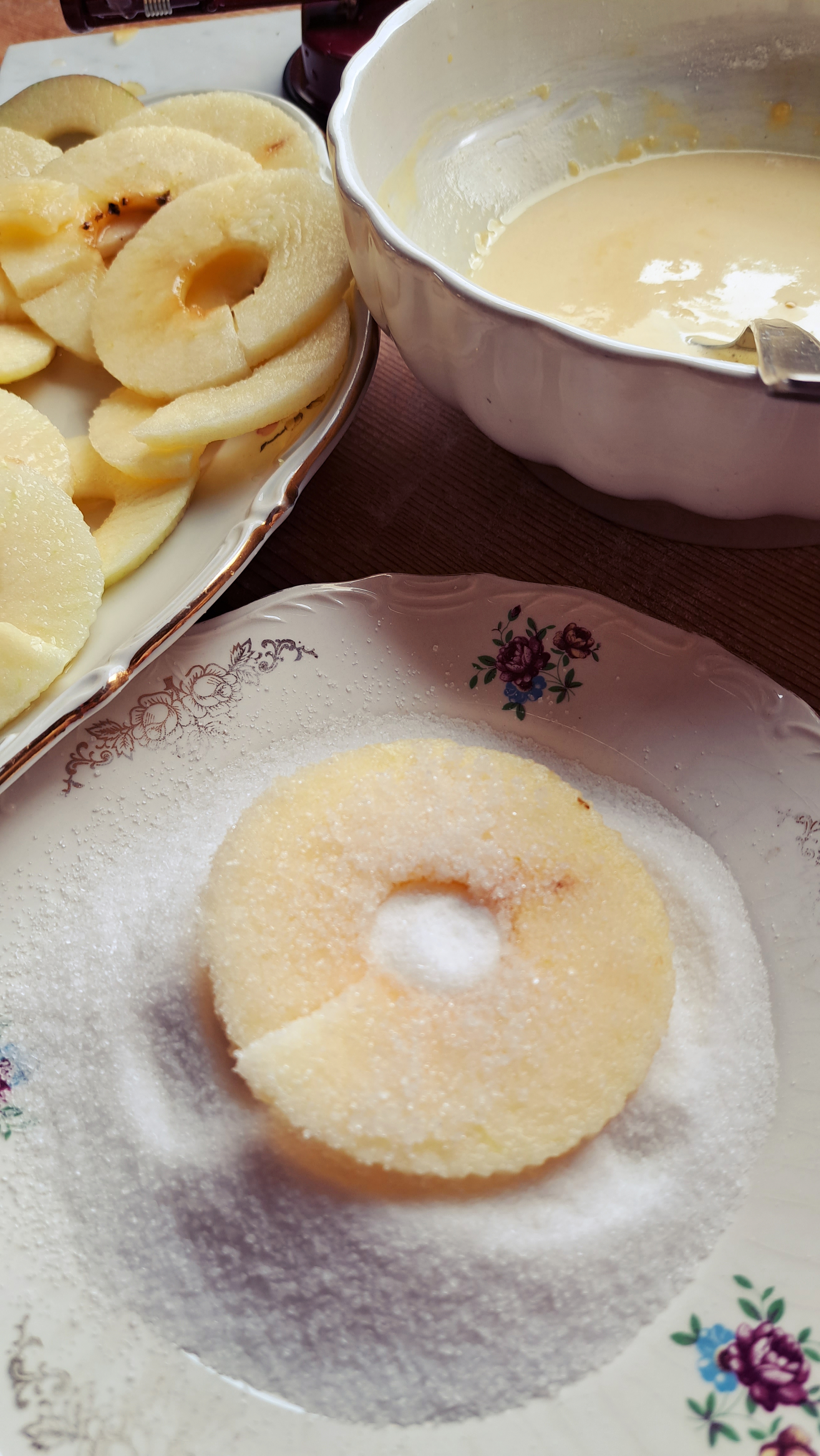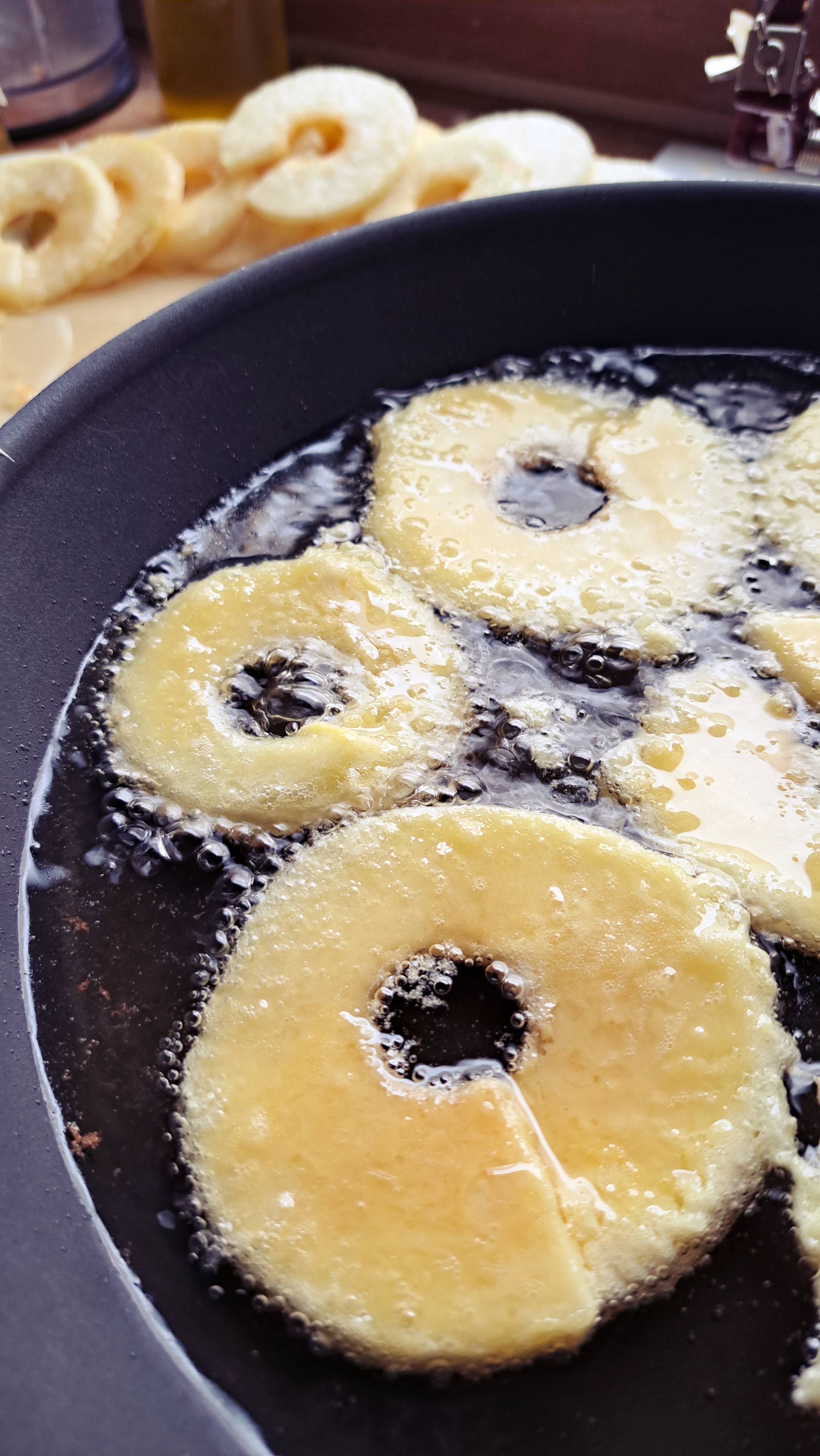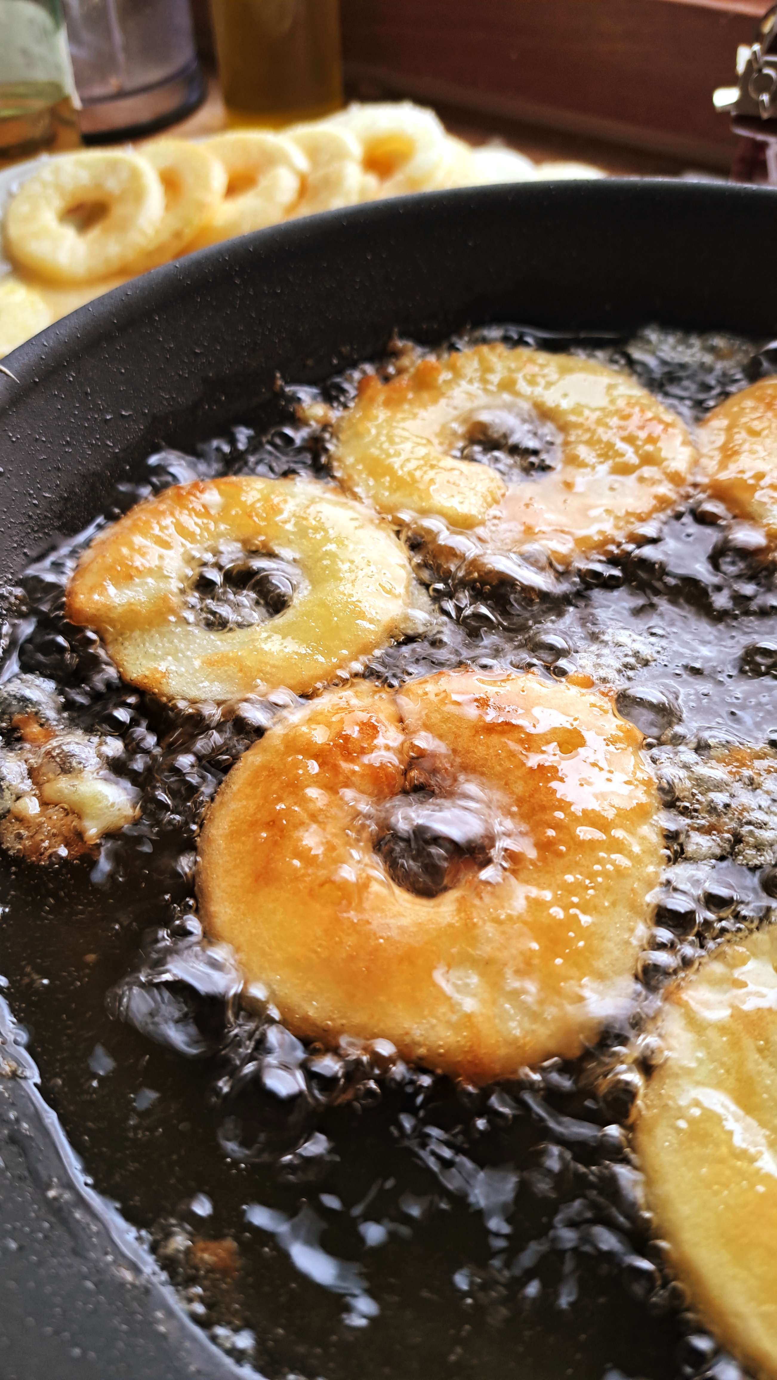 Prendiamo le fettine di mele, le passiamo nello zucchero semolato da ambo i lati e poi dentro alla pastella; scoliamo l’eccesso di pastella e le tuffiamo nell’olio bollente.