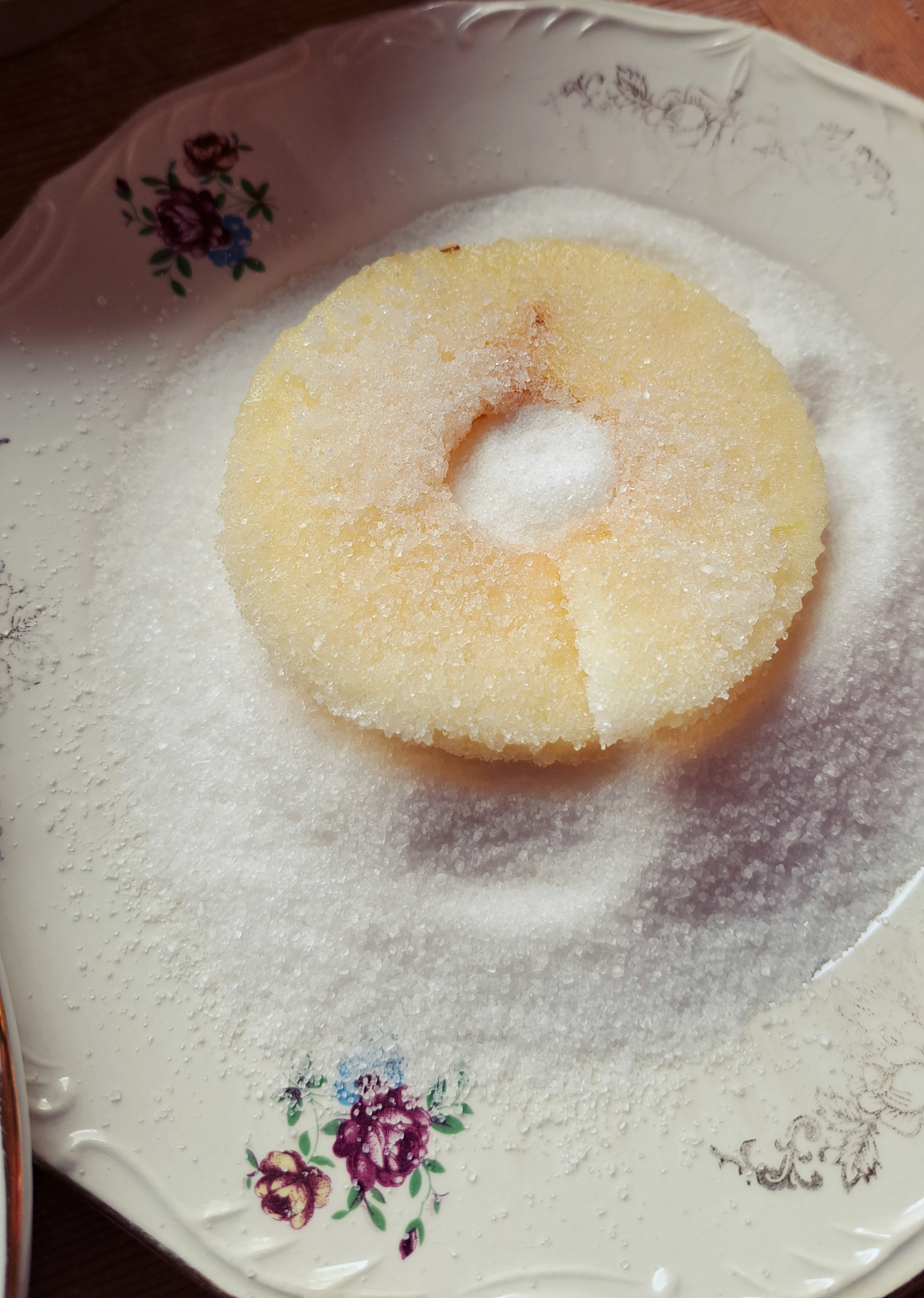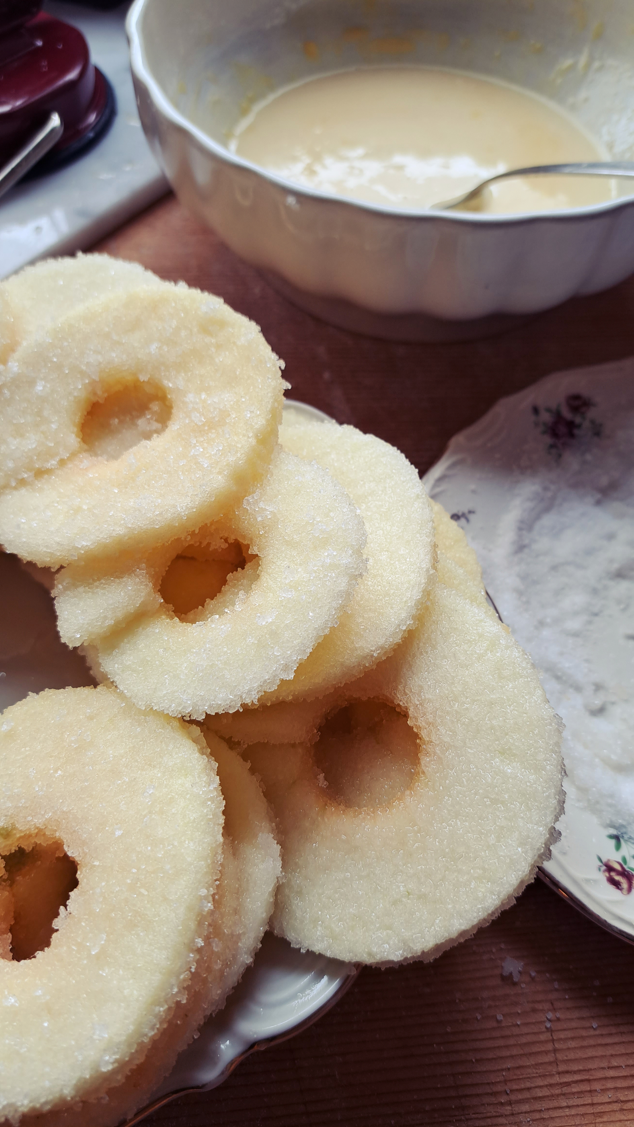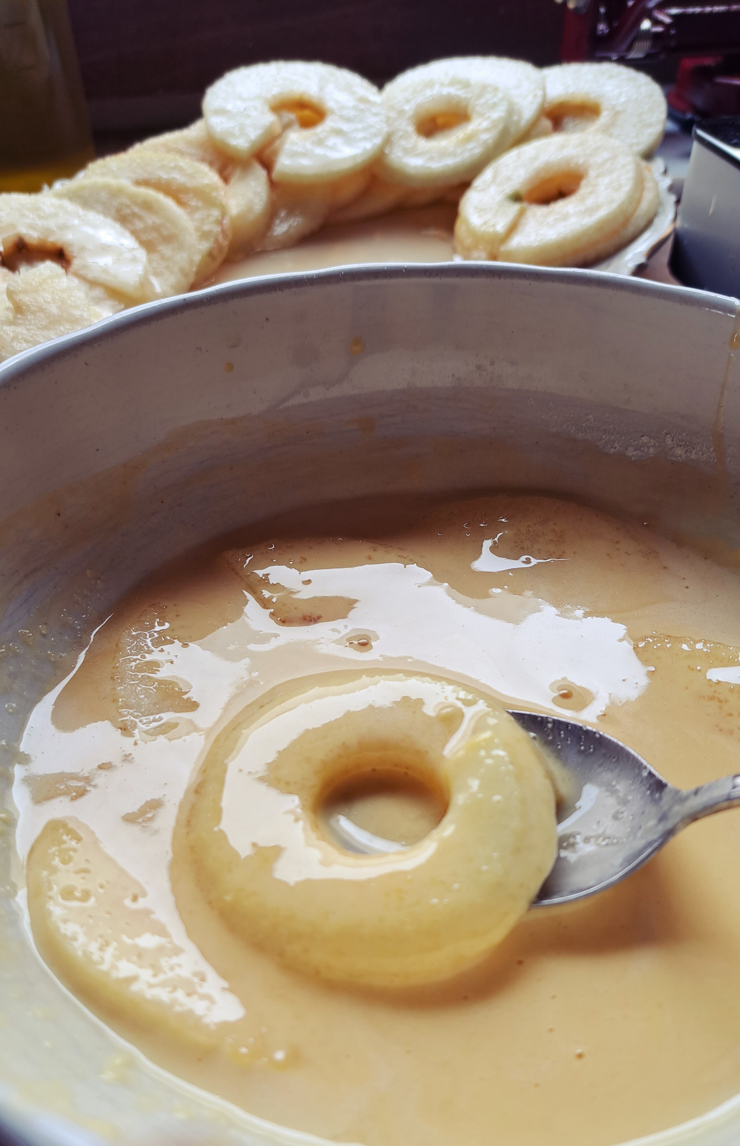 Prendiamo le fettine di mele, le passiamo nello zucchero semolato da ambo i lati e poi dentro alla pastella; scoliamo l’eccesso di pastella e le tuffiamo nell’olio bollente.