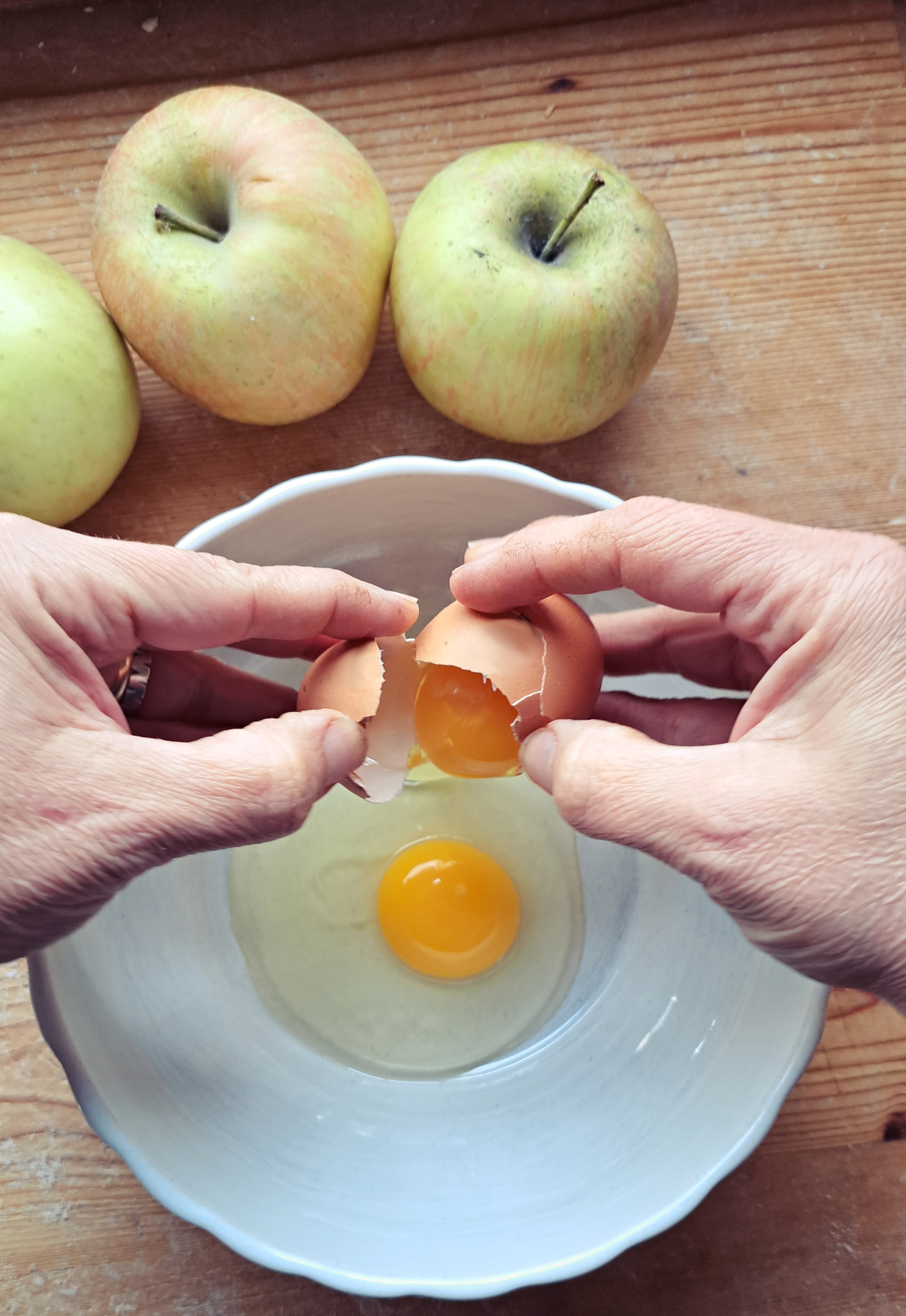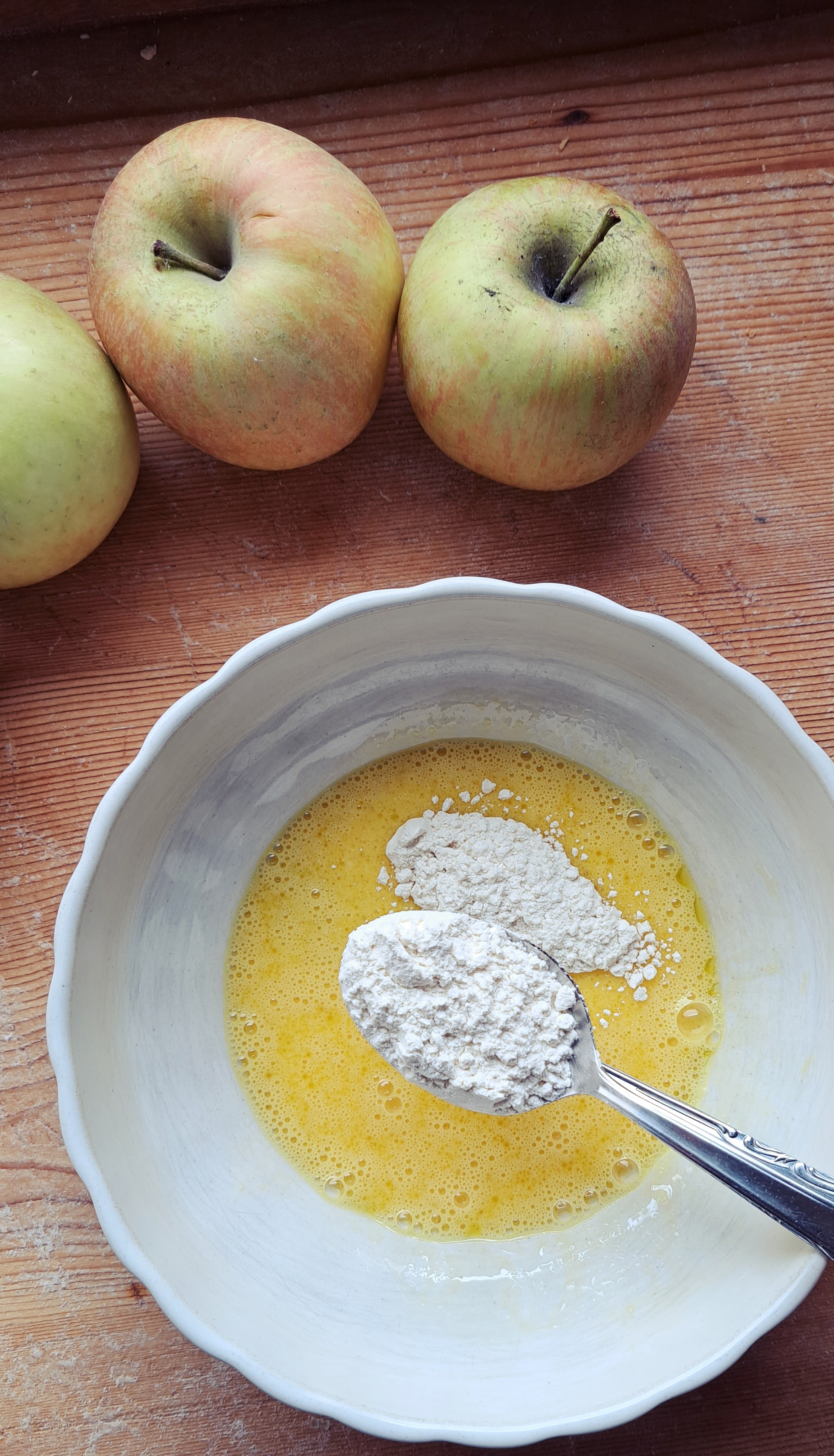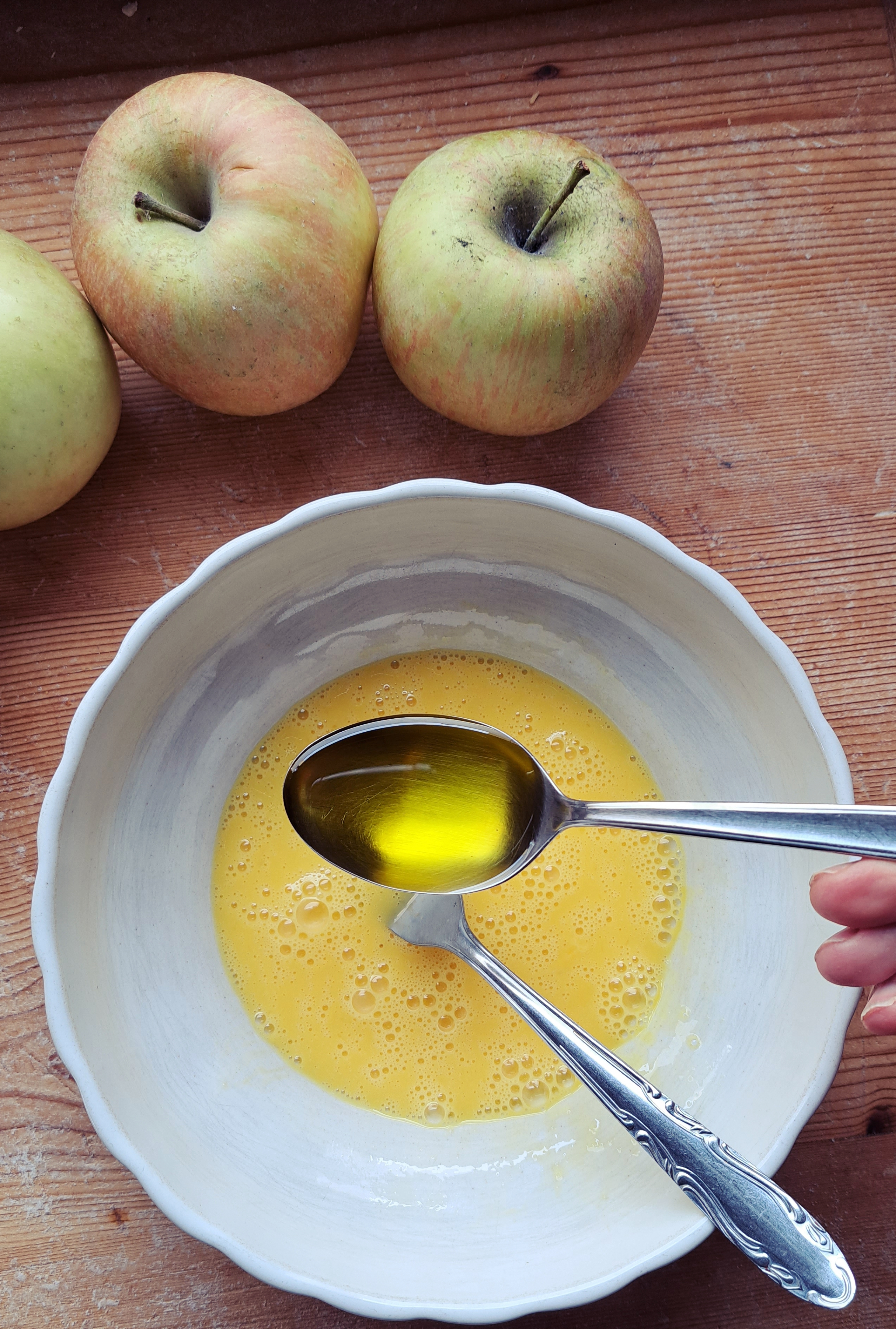 Partiamo preparando la pastella: in un recipiente sbattere bene le uova, unire la farina a cucchiaiate, l’olio il sale e infine la’cqua. Teniamo per ultima l’acqua perché ci servirà per regolare la densità della pastella. Se vi piacciono le frittelle belle gonfie, allora tenete la pastella piuttosto densa (meno acqua), se invece come a noi, piacciono le frittelle dove comunque si senta bene il gusto della mele, tenete la pastella un po’ più liquida (meno acqua). La facciamo riposare a temperatura ambiente; la ricetta dice un’oretta ma non è necessario.
