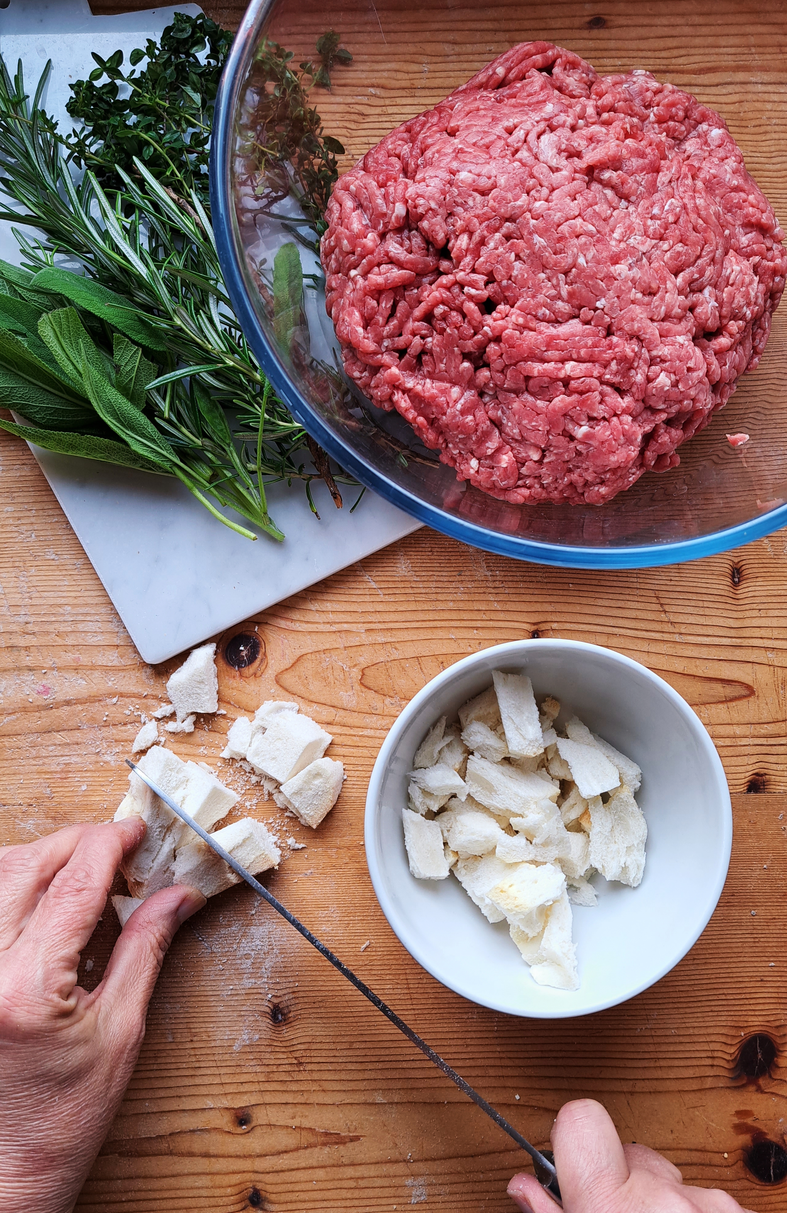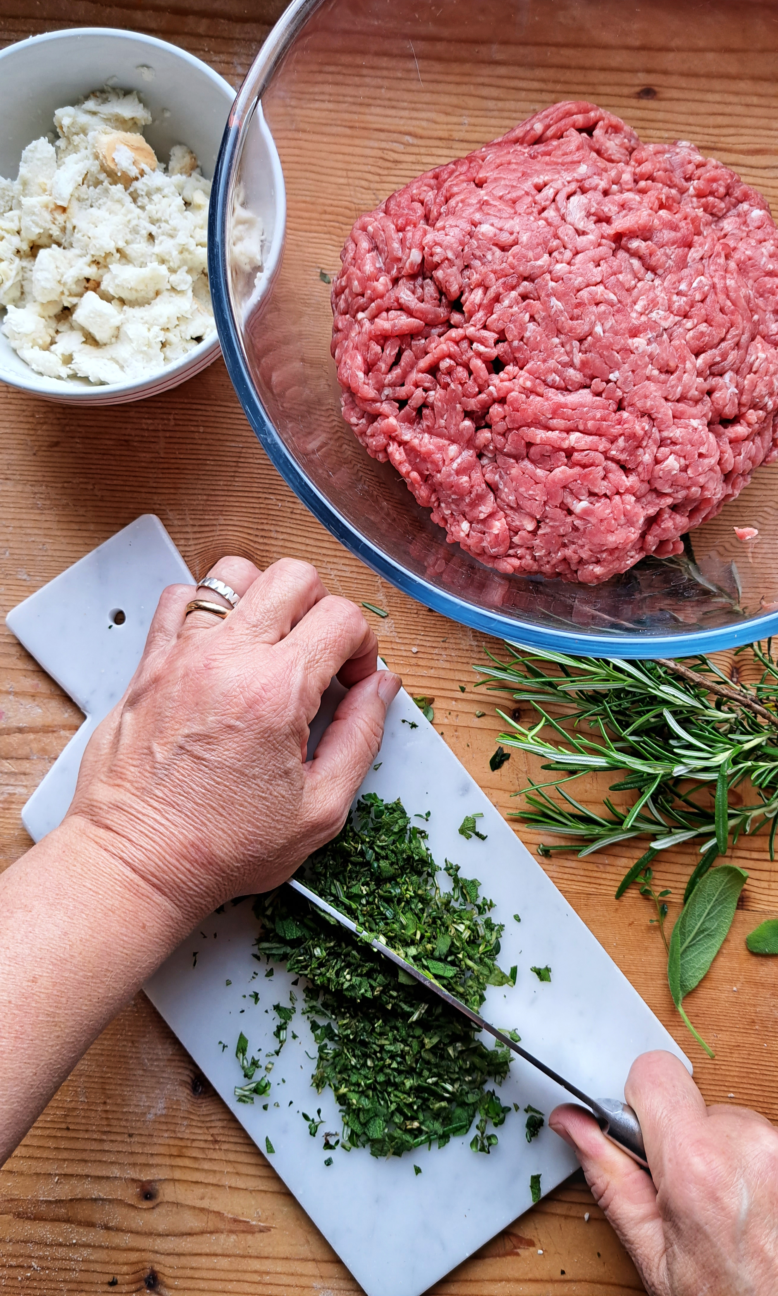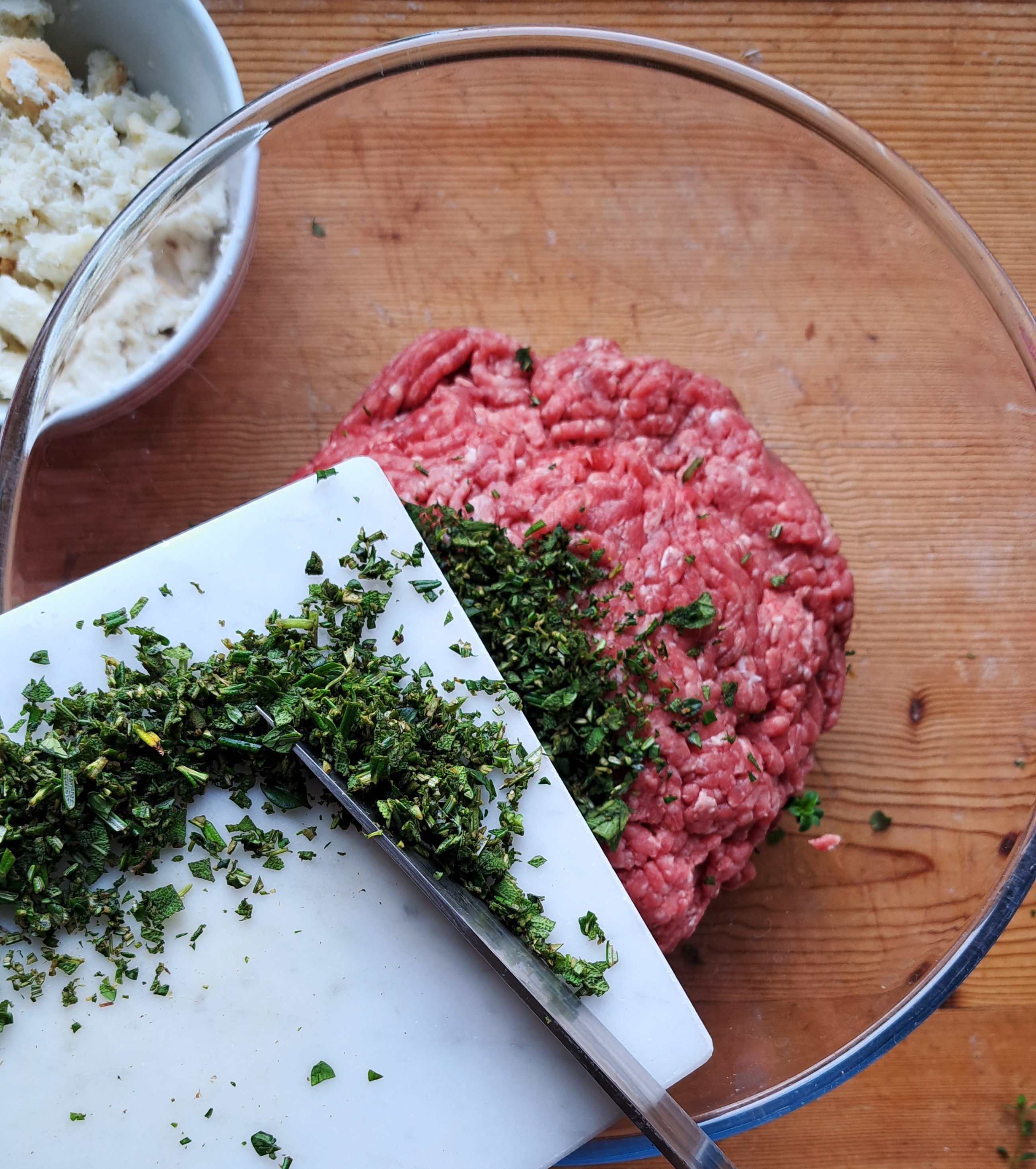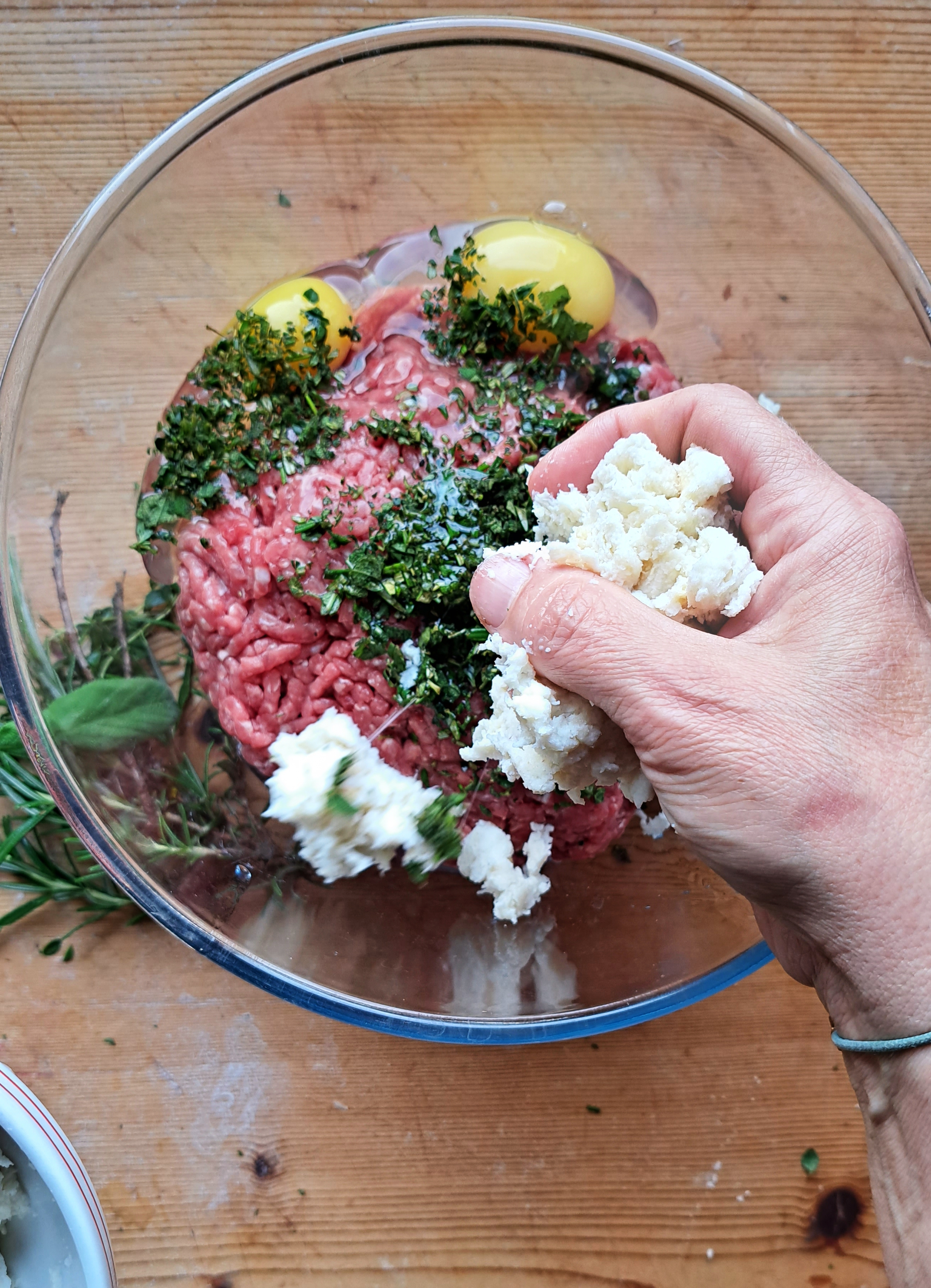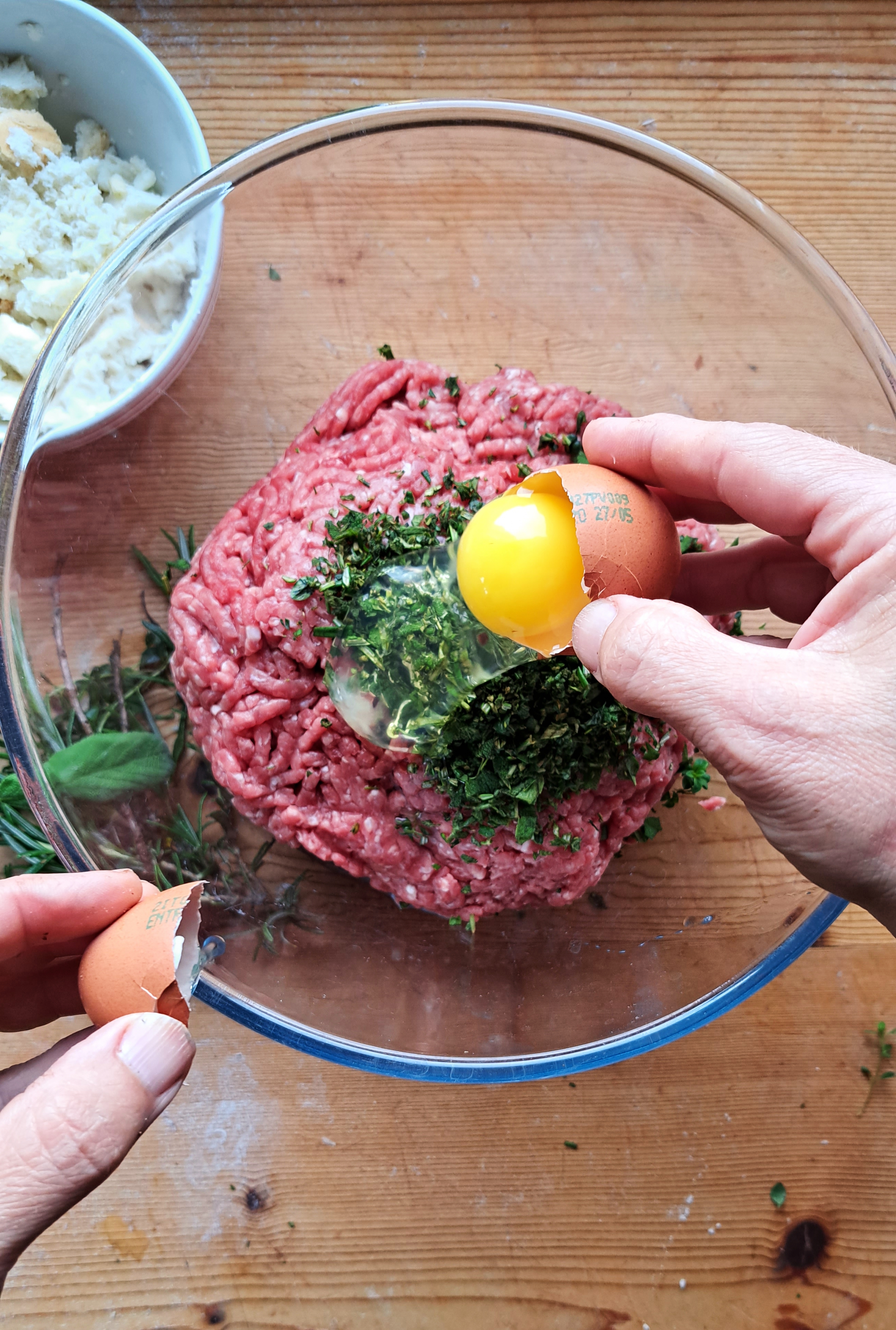Nel frattempo tagliuzziamo tutte le erbe molto finemente e uniamo tutti gli ingredienti in una ciotola capiente; strizziamo appena la mollica di pane imbevuta nel latte e la sbricioliamo nella ciotola, amalgamando tutti gli ingredienti con le mani.