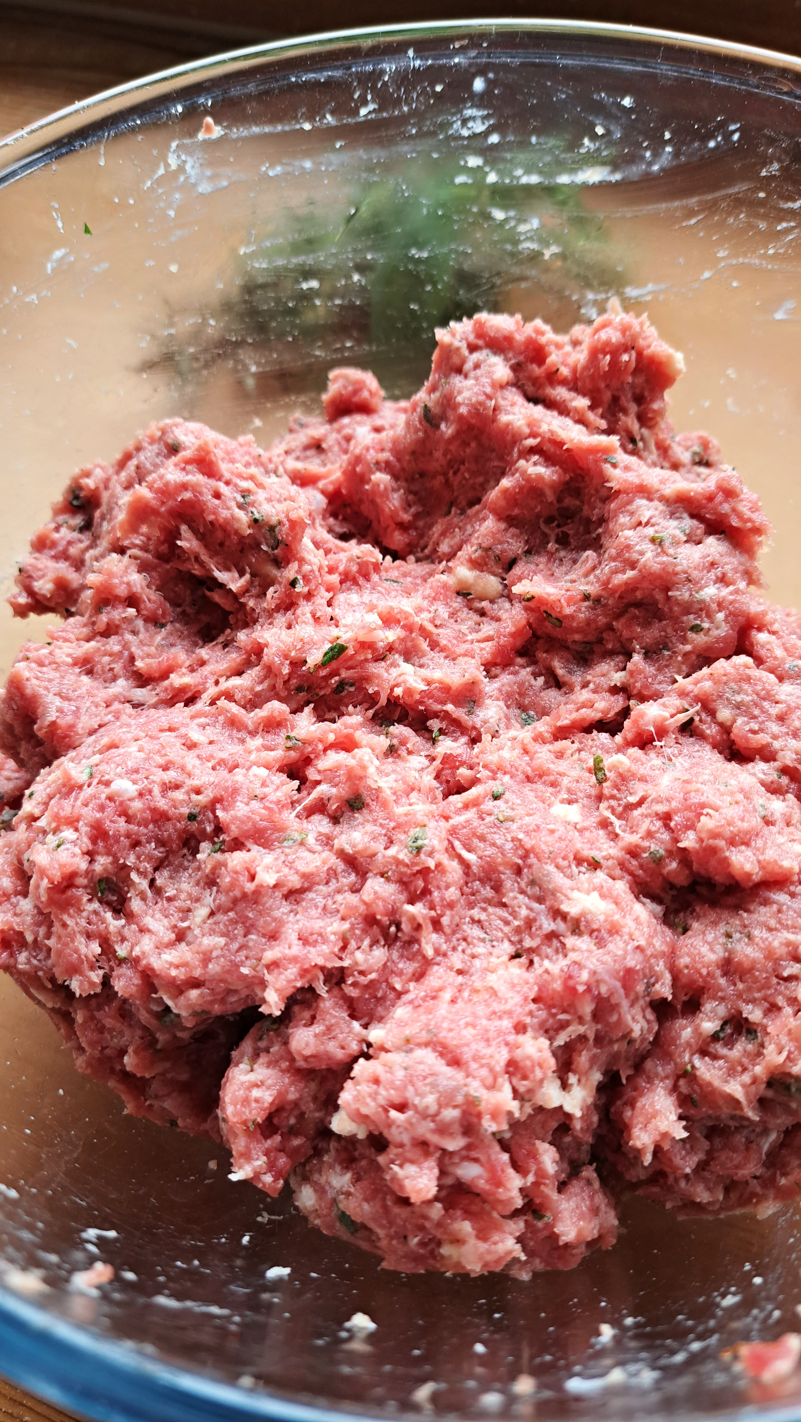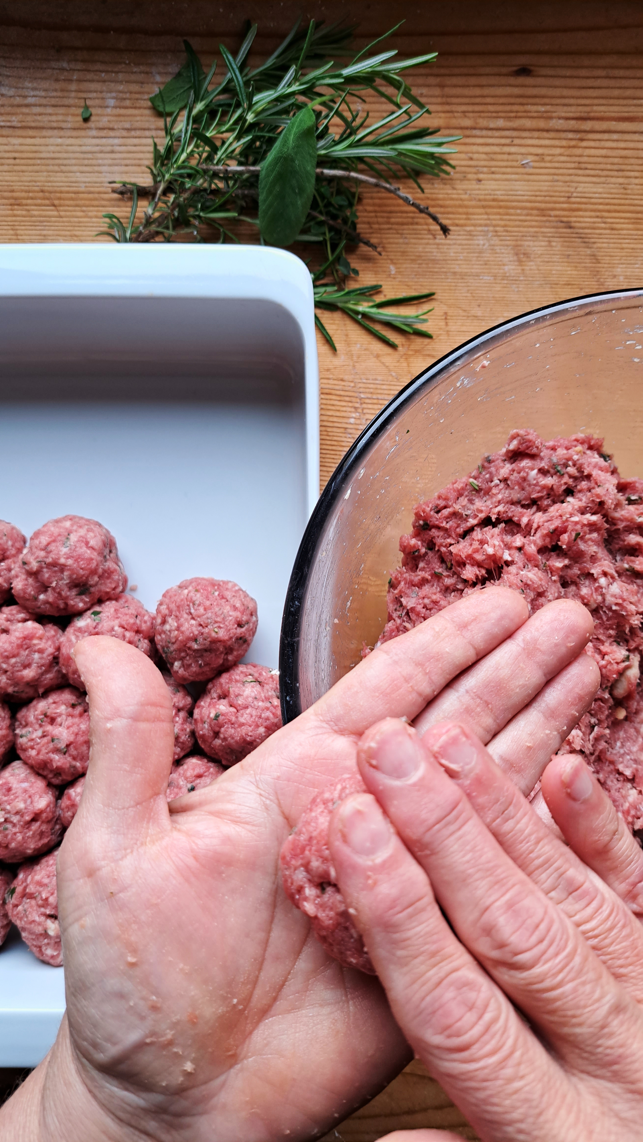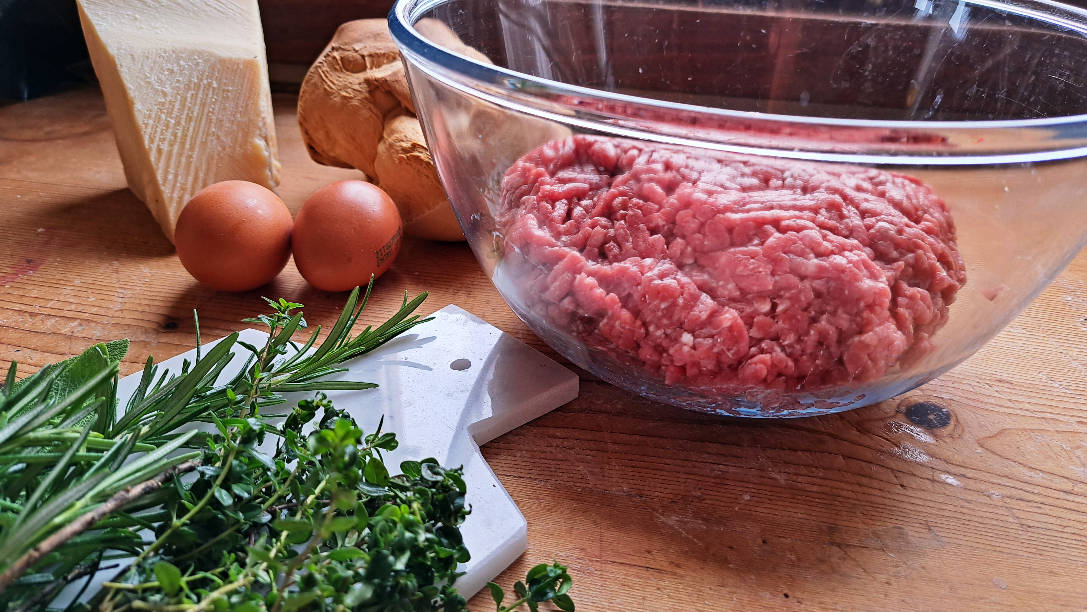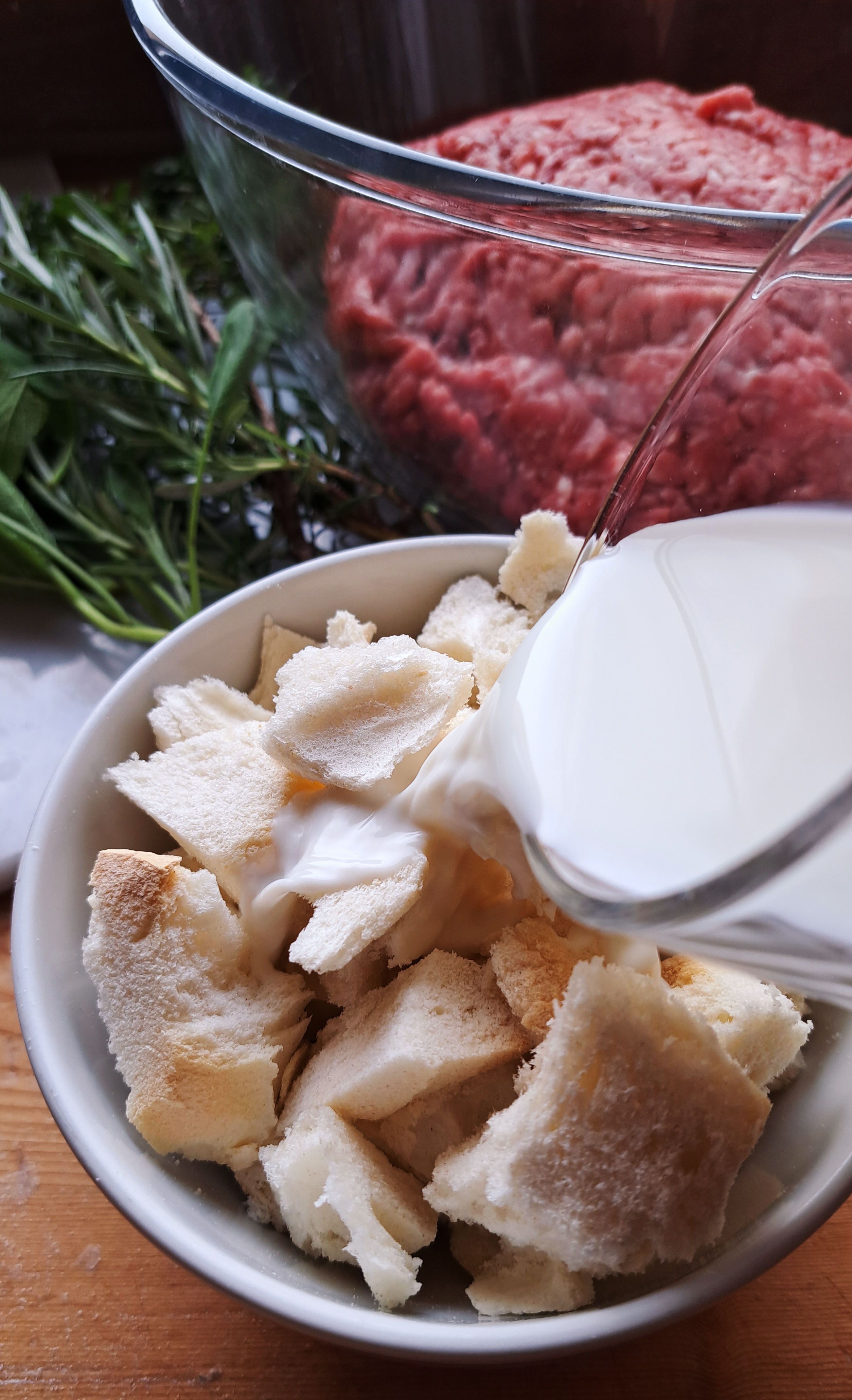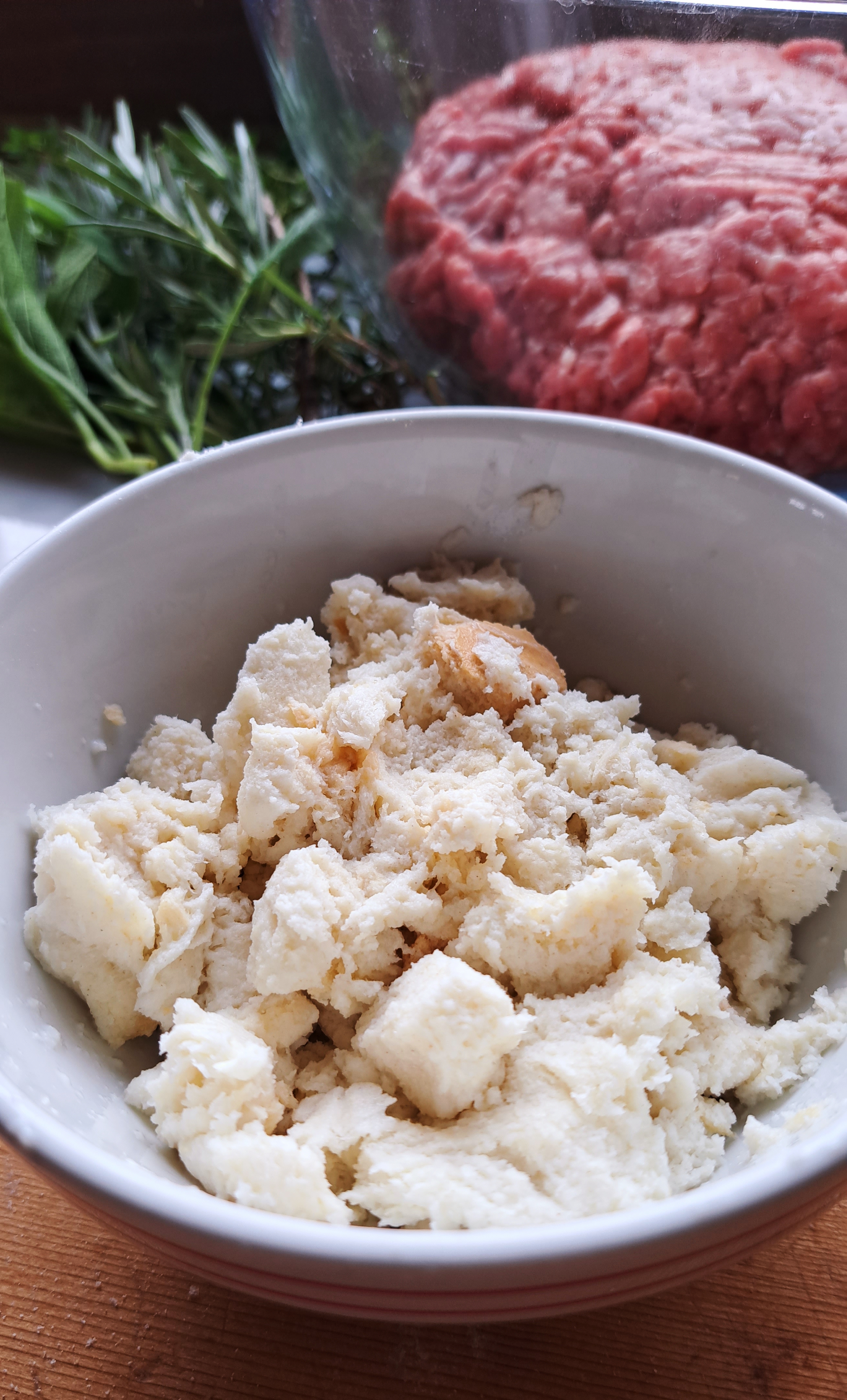 Nel frattempo tagliuzziamo tutte le erbe molto finemente e uniamo tutti gli ingredienti in una ciotola capiente; strizziamo appena la mollica di pane imbevuta nel latte e la sbricioliamo nella ciotola, amalgamando tutti gli ingredienti con le mani.