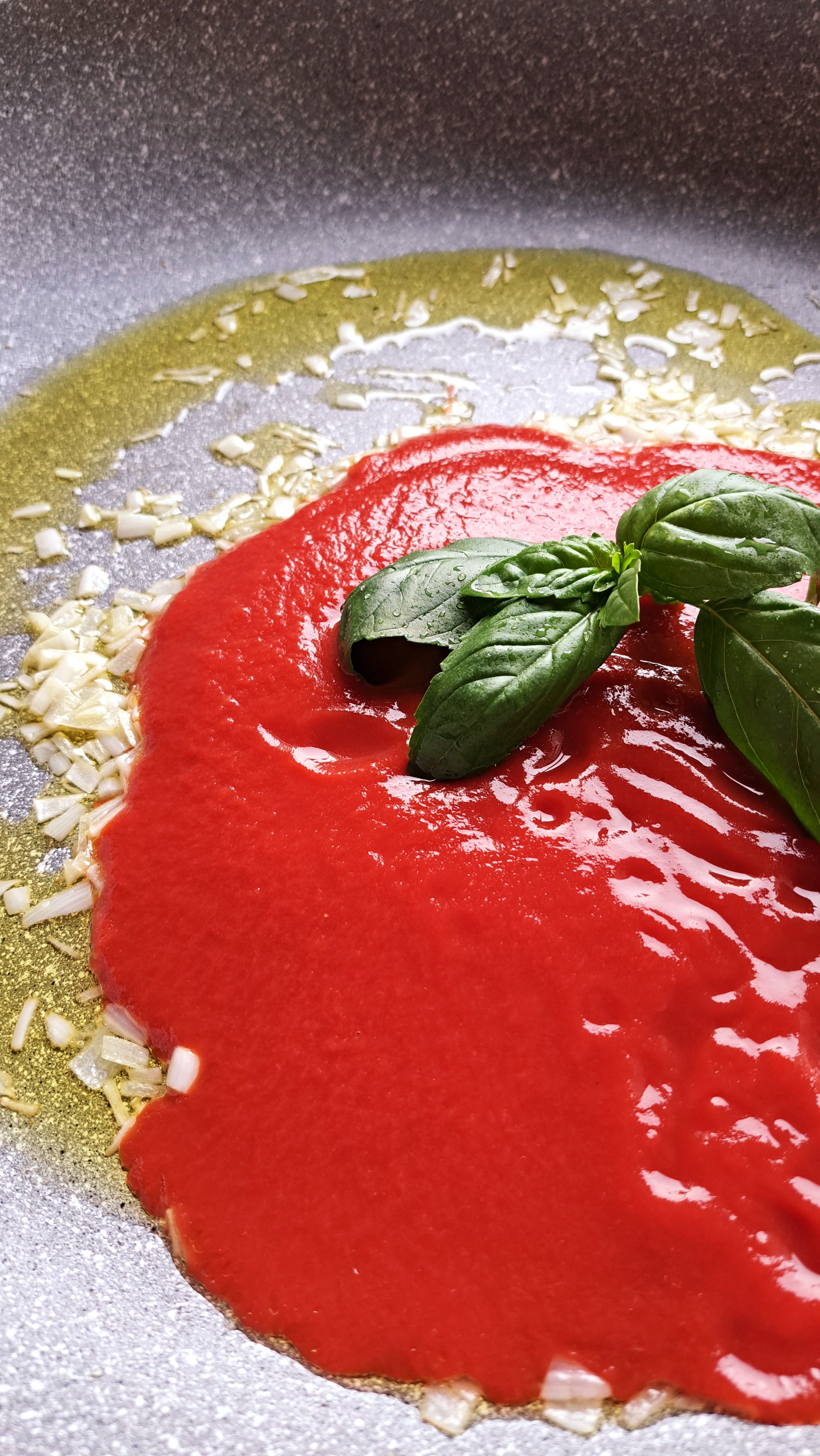 Per il sugo: olio extra vergine d’oliva, scalogno, passata di pomodoro, basilico, piselli freschi o surgelati.