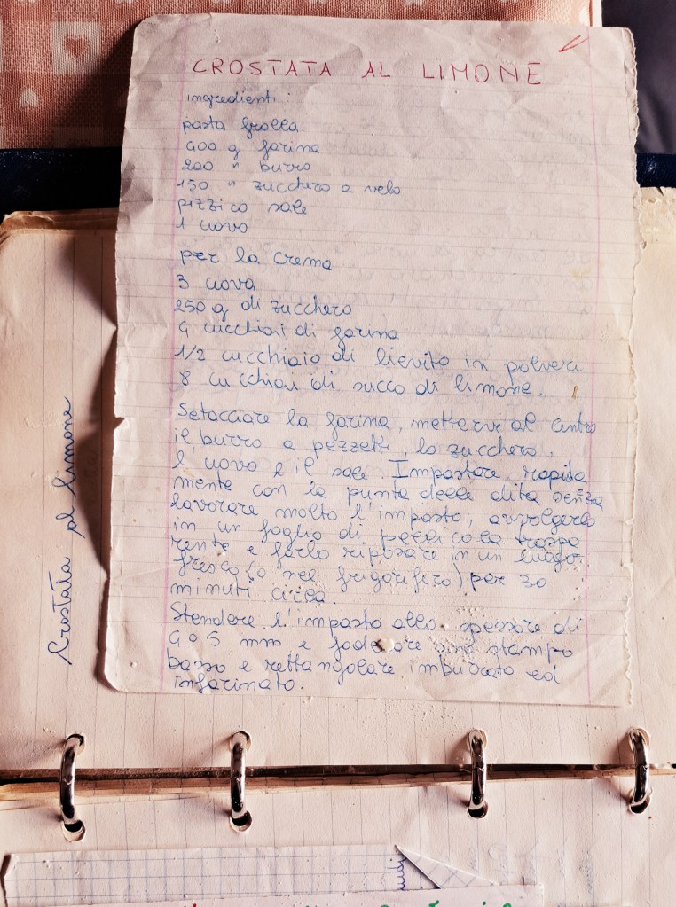 Era lì da anni, come tutte le altre sul ricettario della Rosy ma c’era qualcosa di diverso nell’impaginazione; il titolo sempre scritto in bella grafia da mia mamma, ma il testo della ricetta invece scritto con tratto un po’ incerto e poco ordinato, su un foglio a righe staccato e ripiegato a libro perpendicolarmente