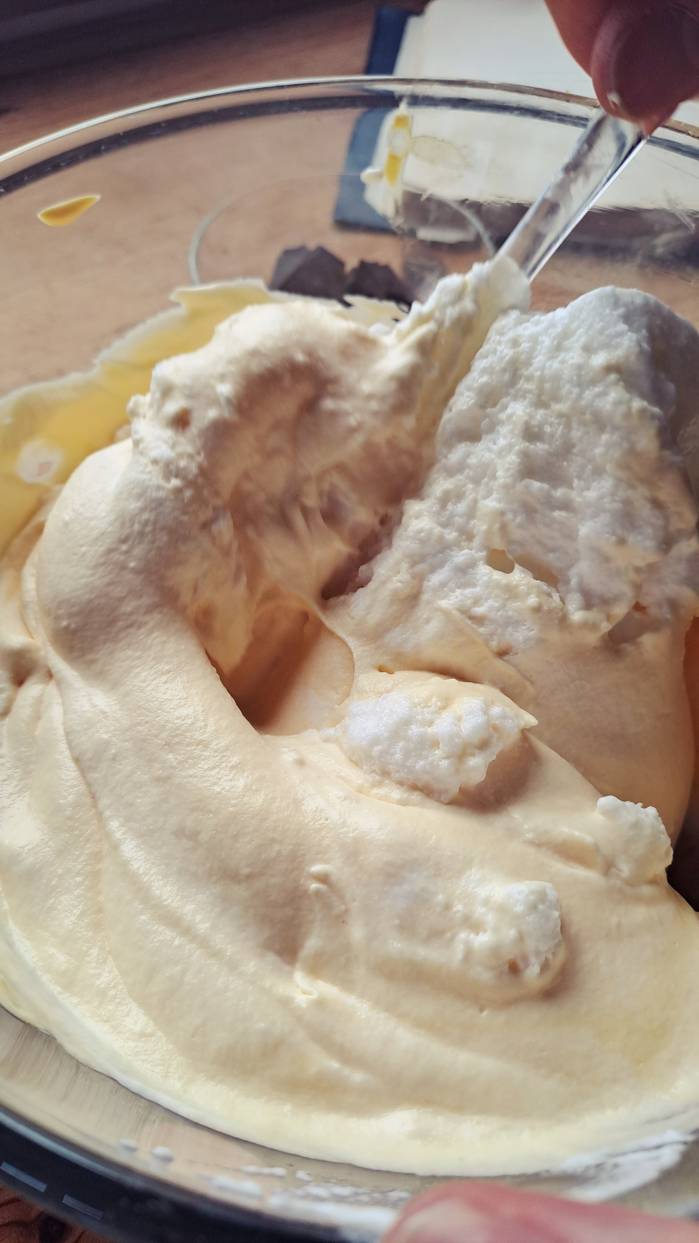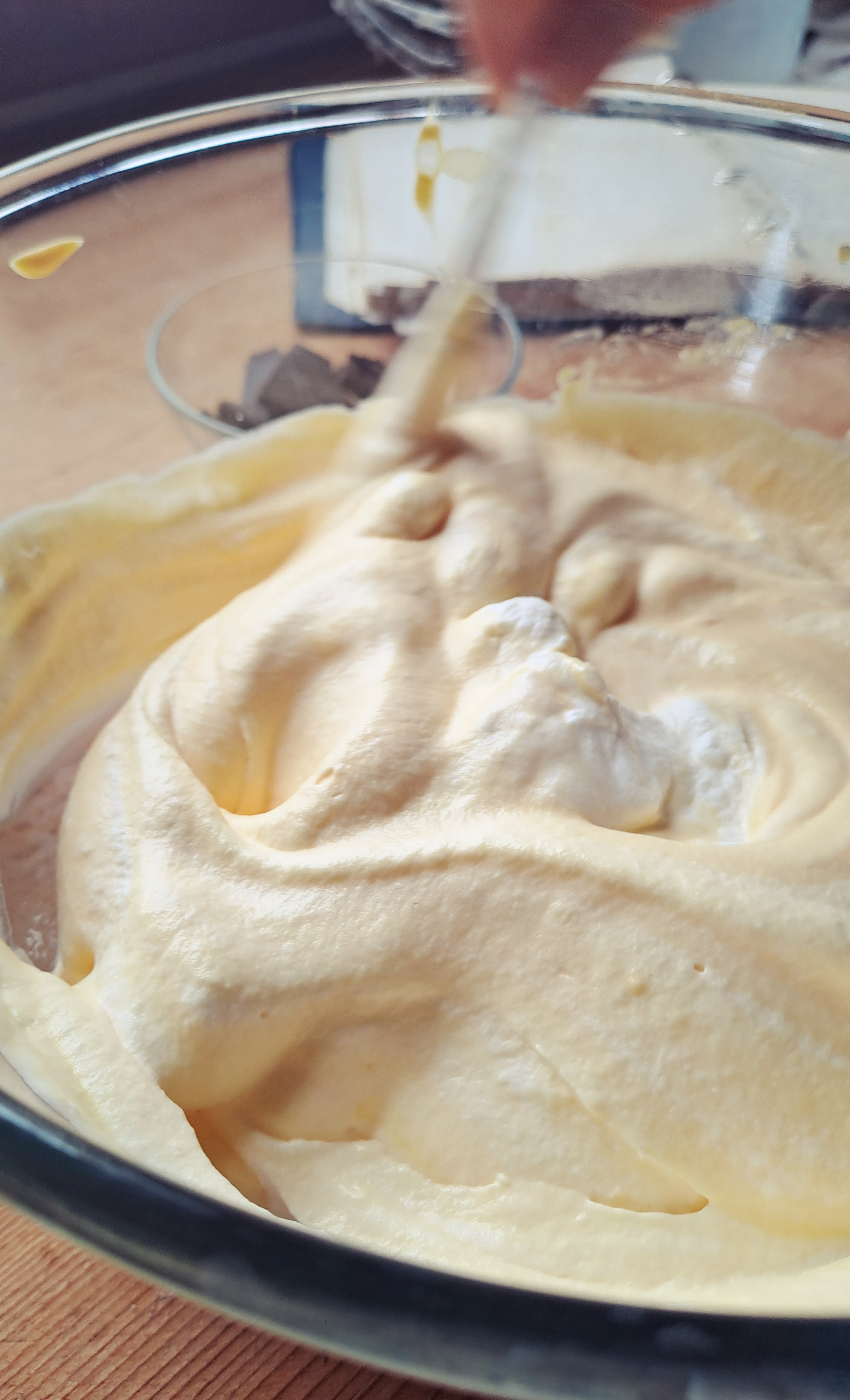A questo punto cominciamo ad unire prima gli albumi ontati e poi la panna al composto di tuorli e zucchero che nel frattempo sarà intiepidito, con movimenti delicati dall’alto verso il basso, senza mescolare troppo.