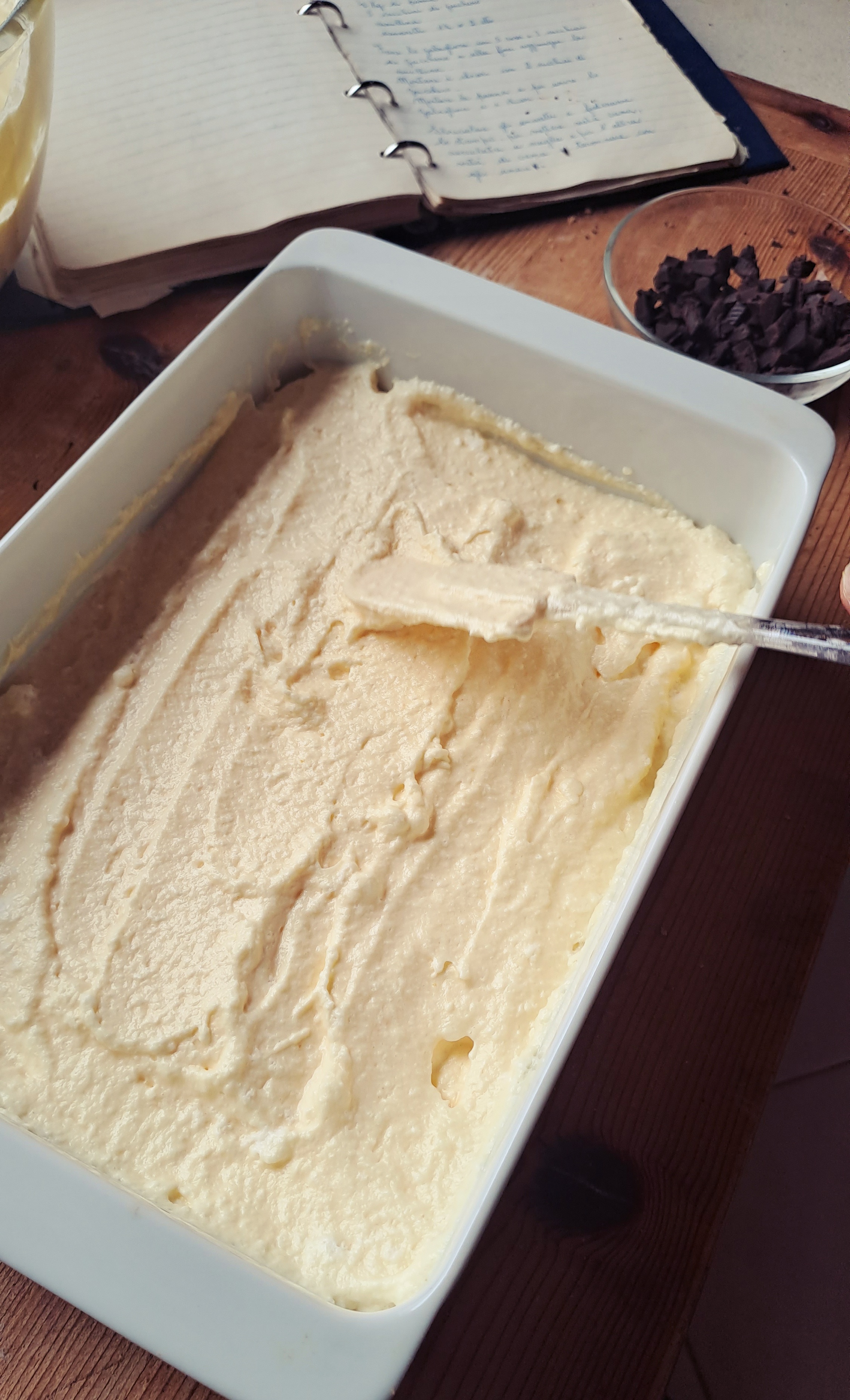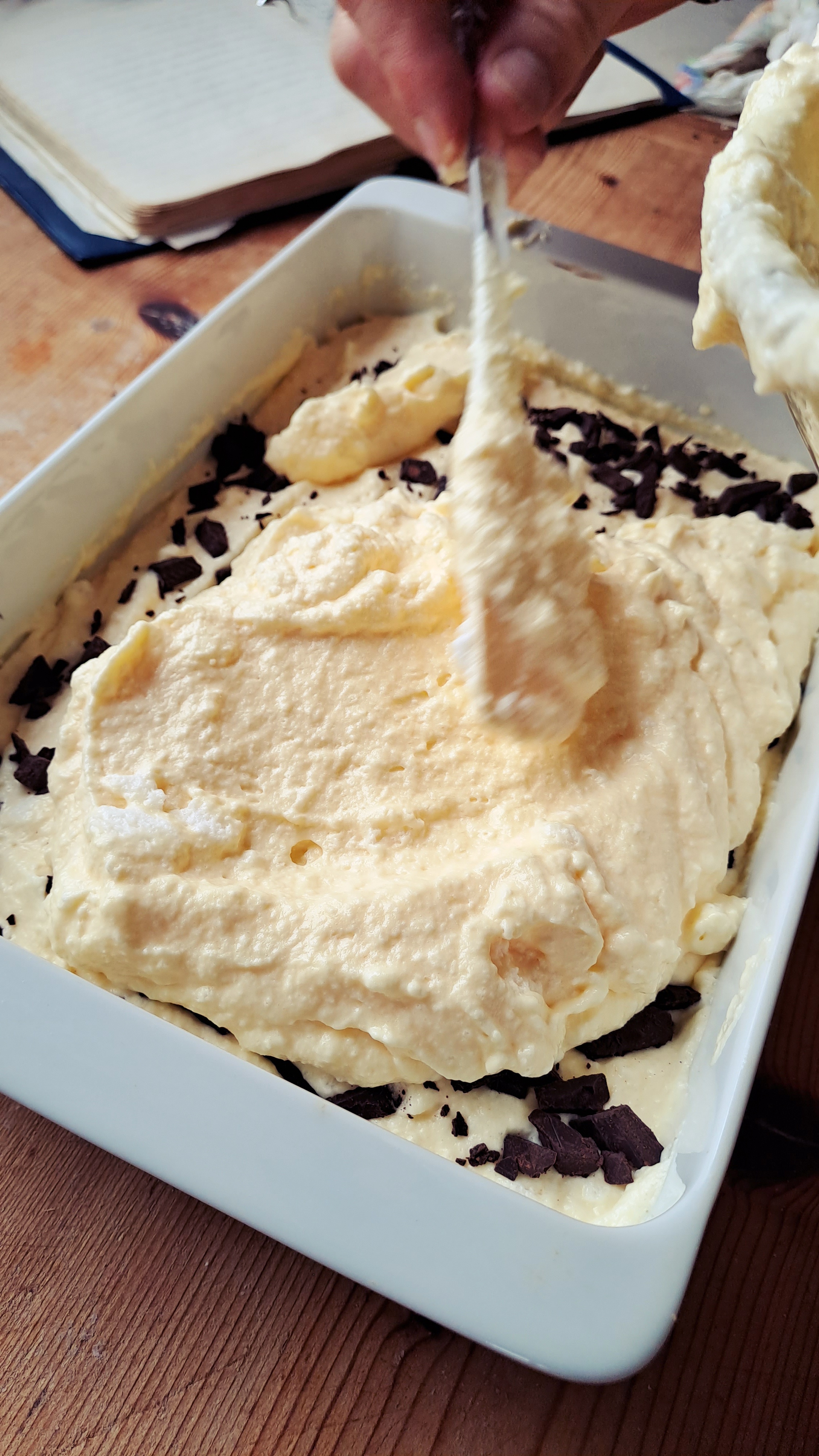 Versiamo nella pirofila sopra gli amaretti la prima parte del composto, distribuiamo le scagliette di cioccolato fondente e ricopriamo con il restante composto.