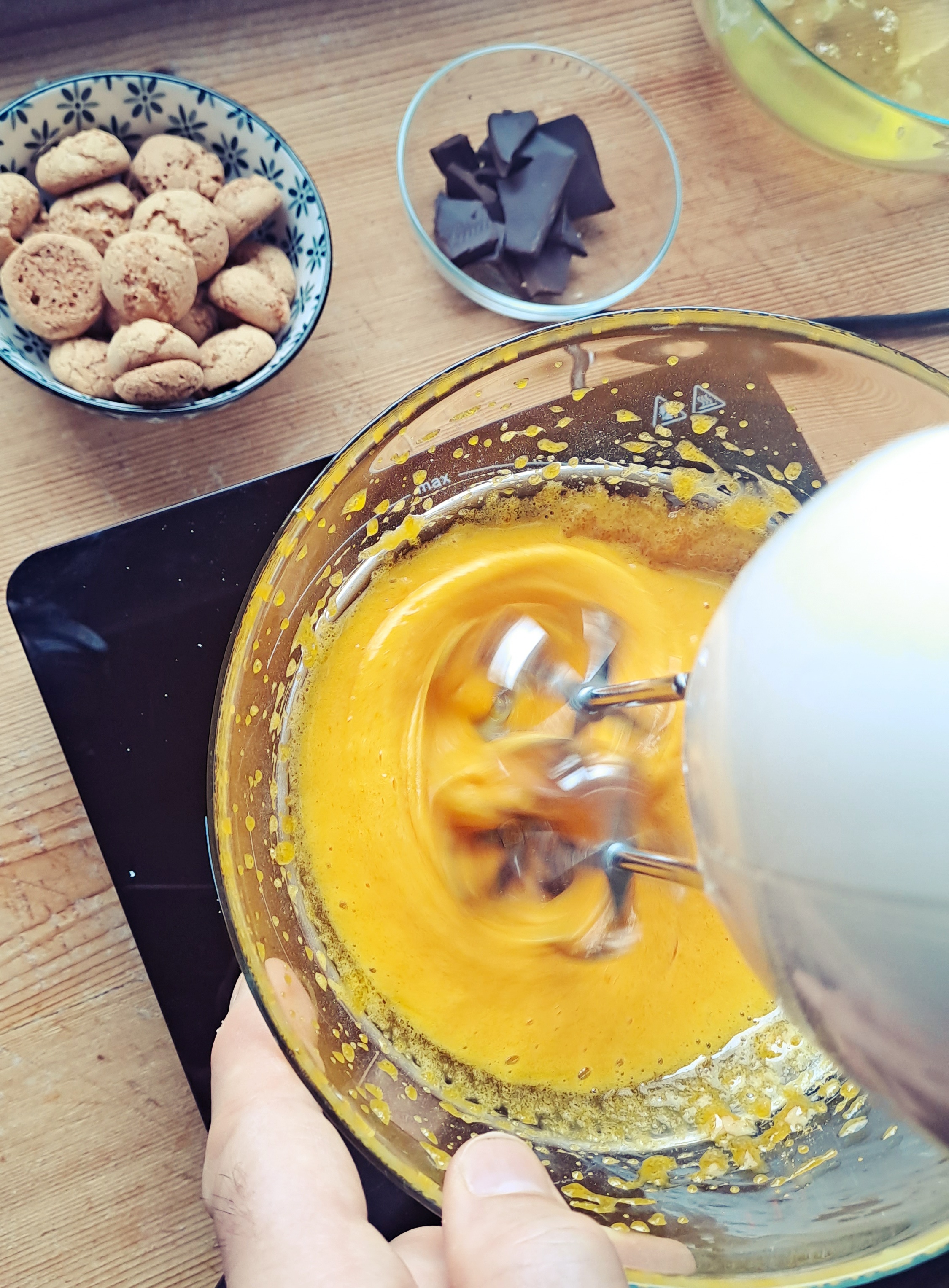 Montare i 5 tuorli con la vanillina e 3 cucchiai belli pieni di zucchero; li pastorizziamo cuocendoli a bagnomaria finché non avremo raggiunto 65°/70°C, sempre montando con le fruste.