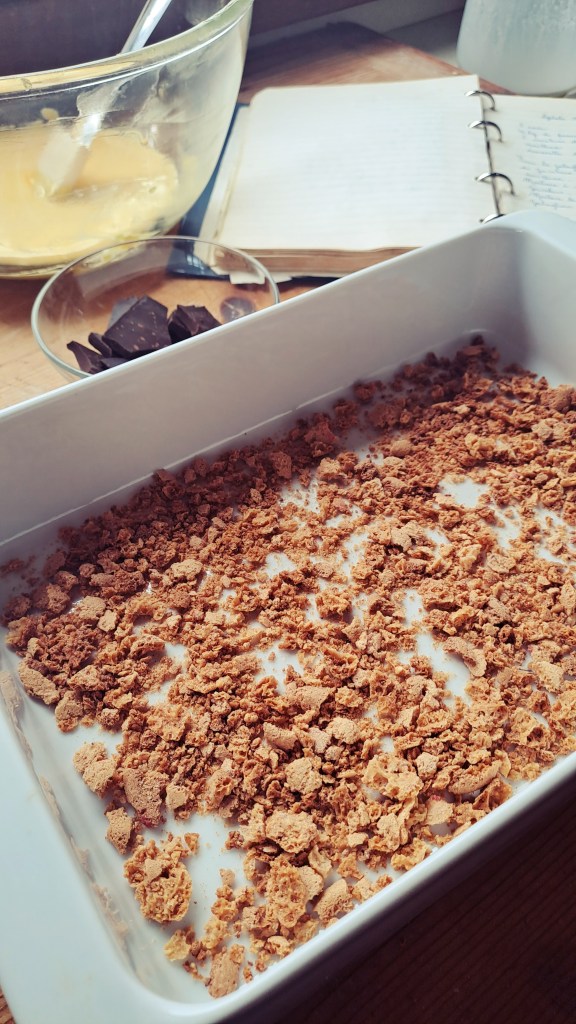 Nel frattempo prepariamo la pirofila, sbriciolando gli amaretti alla base.