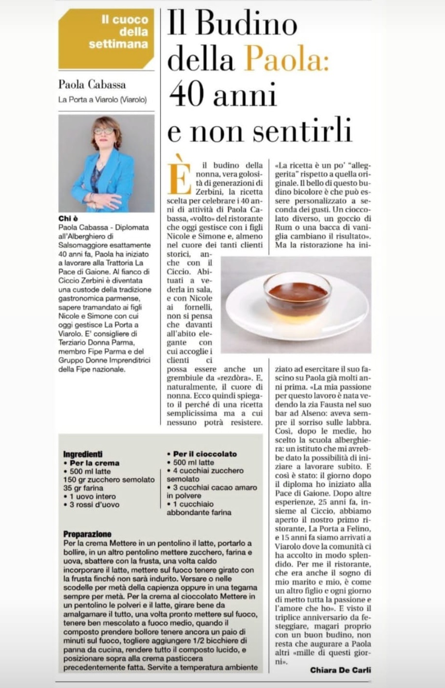 Qualche tempo dopo, leggendo distrattamente la Gazzetta, arrivo sulla pagina dedicata alla cucina e, inserito dentro un bell’articolo sulla storia del ristorante e della famiglia che lo gestisce da sempre, trovo lui… o meglio lei! La ricetta originale del famoso “Budino della Nonna con Crema e Cioccolato” del ristorante “La Porta a Viarolo” della Famiglia Zerbini