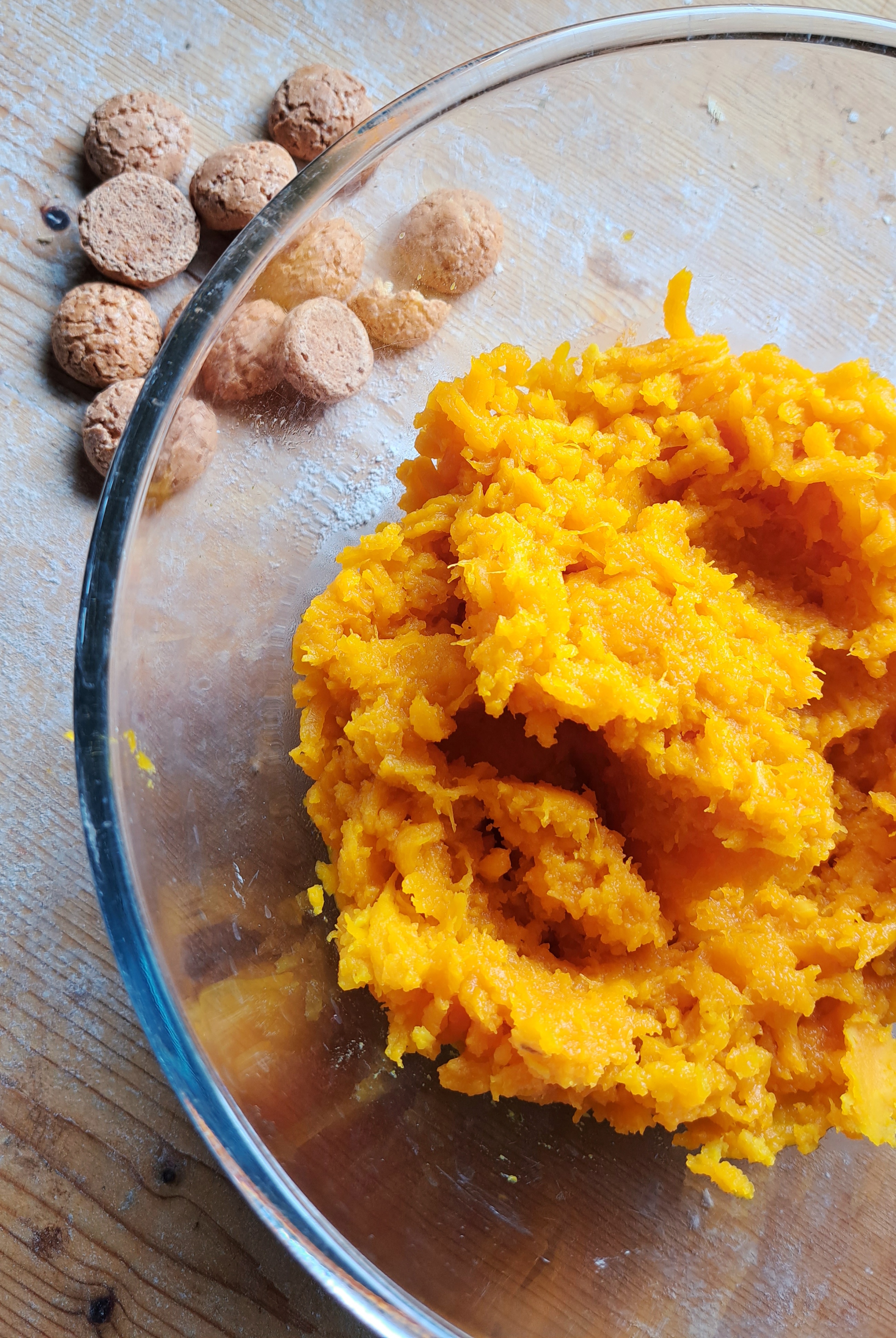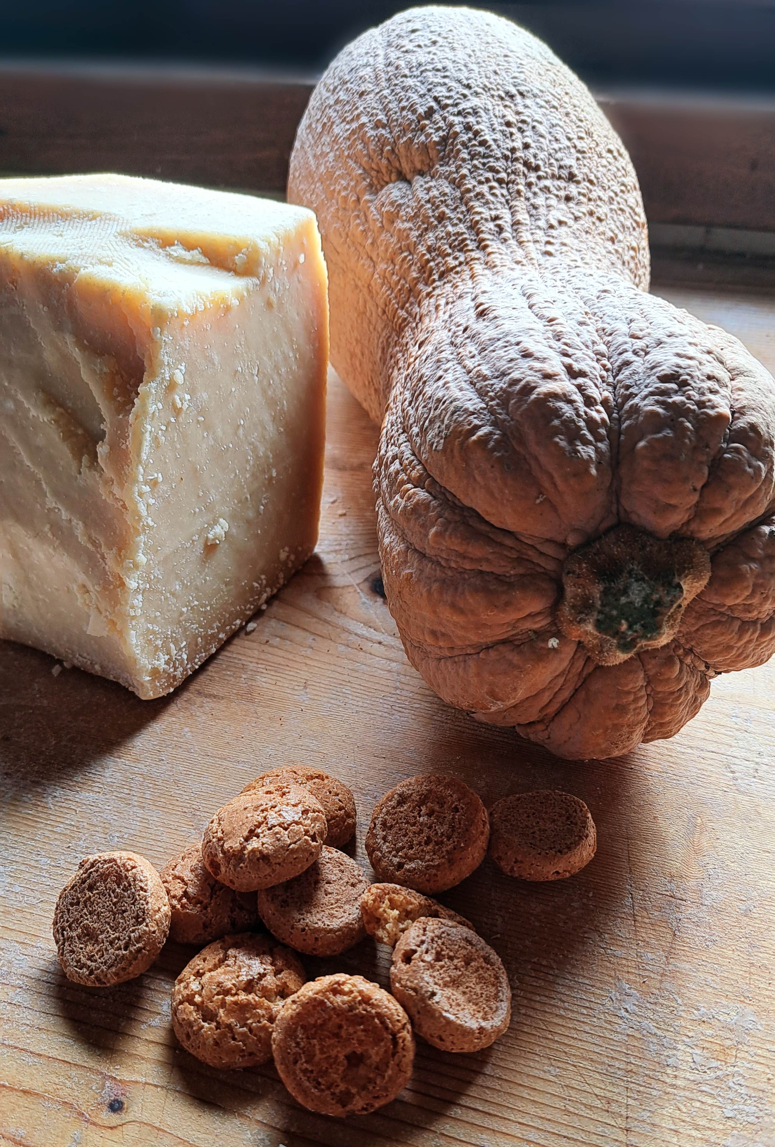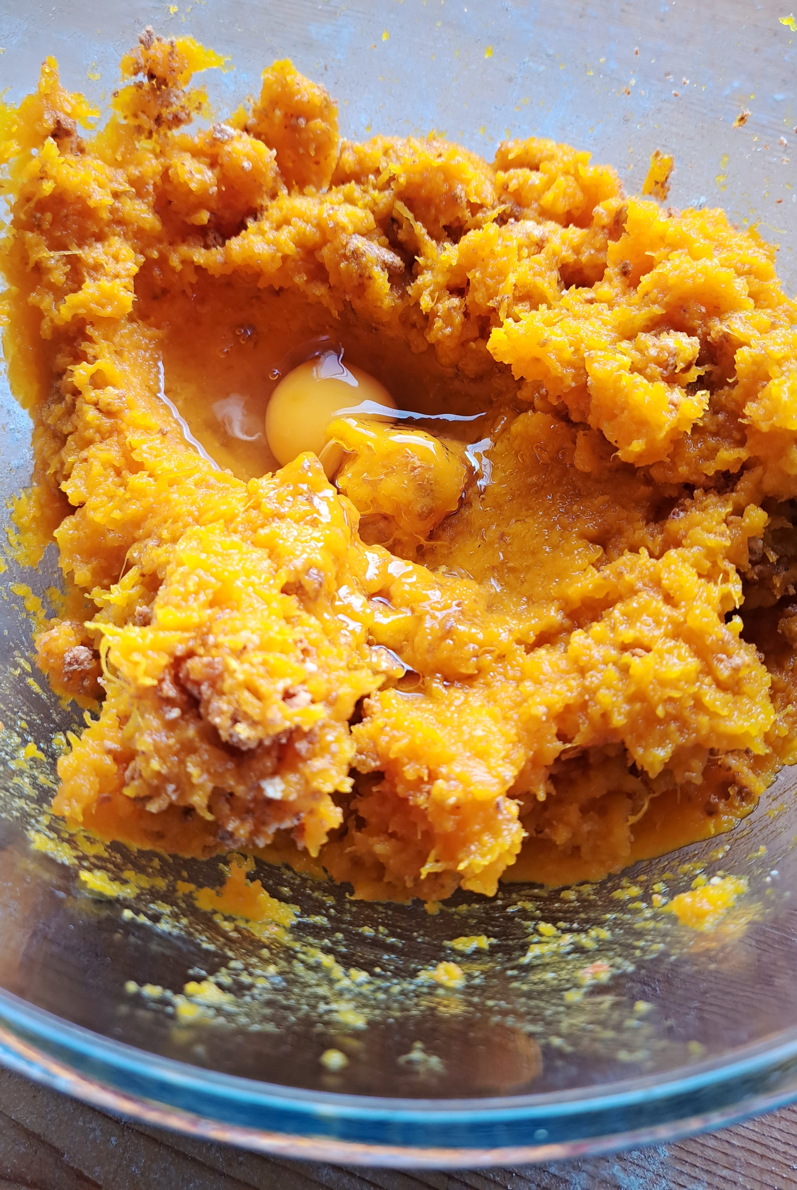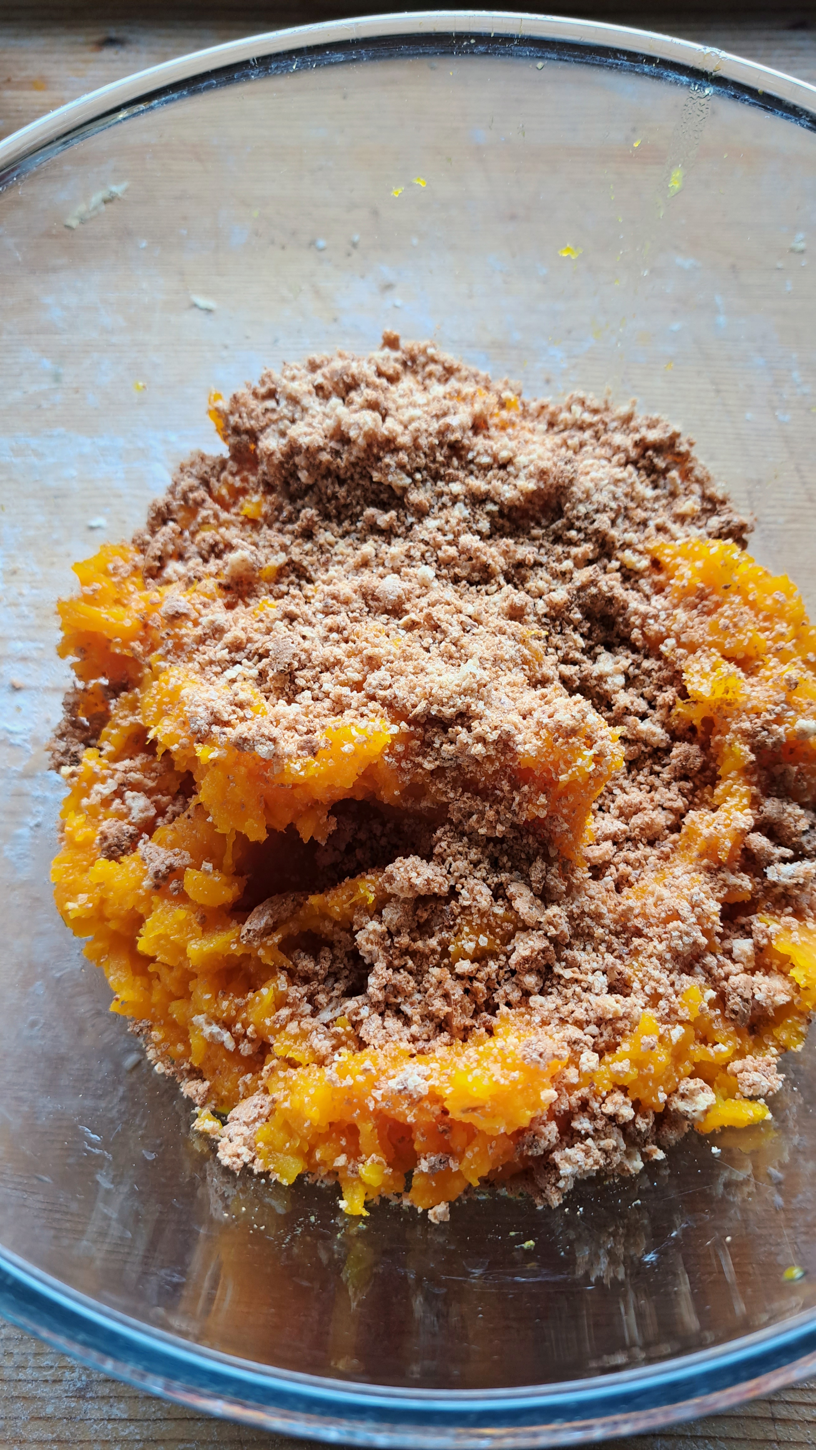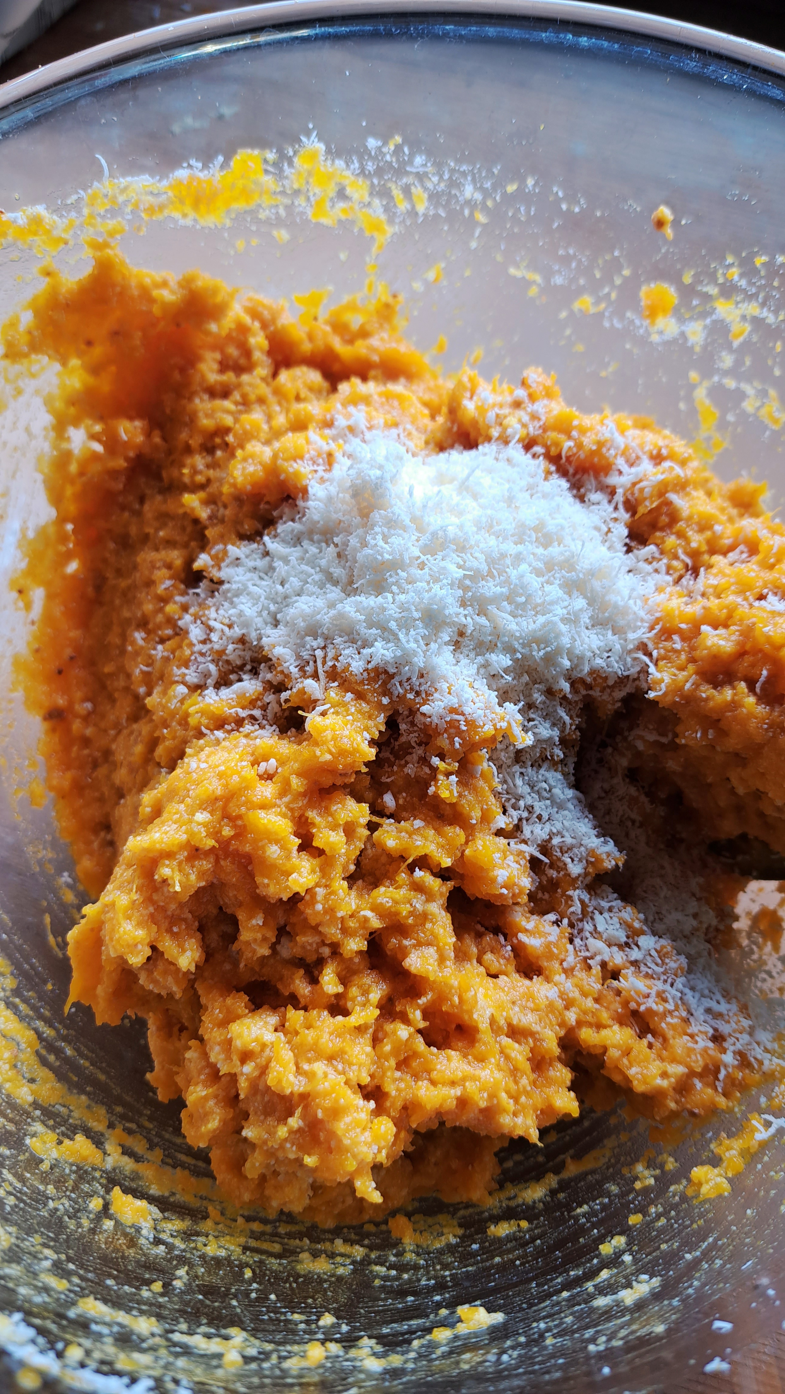 A questo punto aggiungiamo gli amaretti sbiciolati, un uovo, sale e noce moscata e il Parmigiano reggiano; anche qui a seconda della qualità di zucca potremmo avere un impasto più o meno umido e quindi ci regoleremo aumentando o diminuendo il Parmigiano Reggiano.