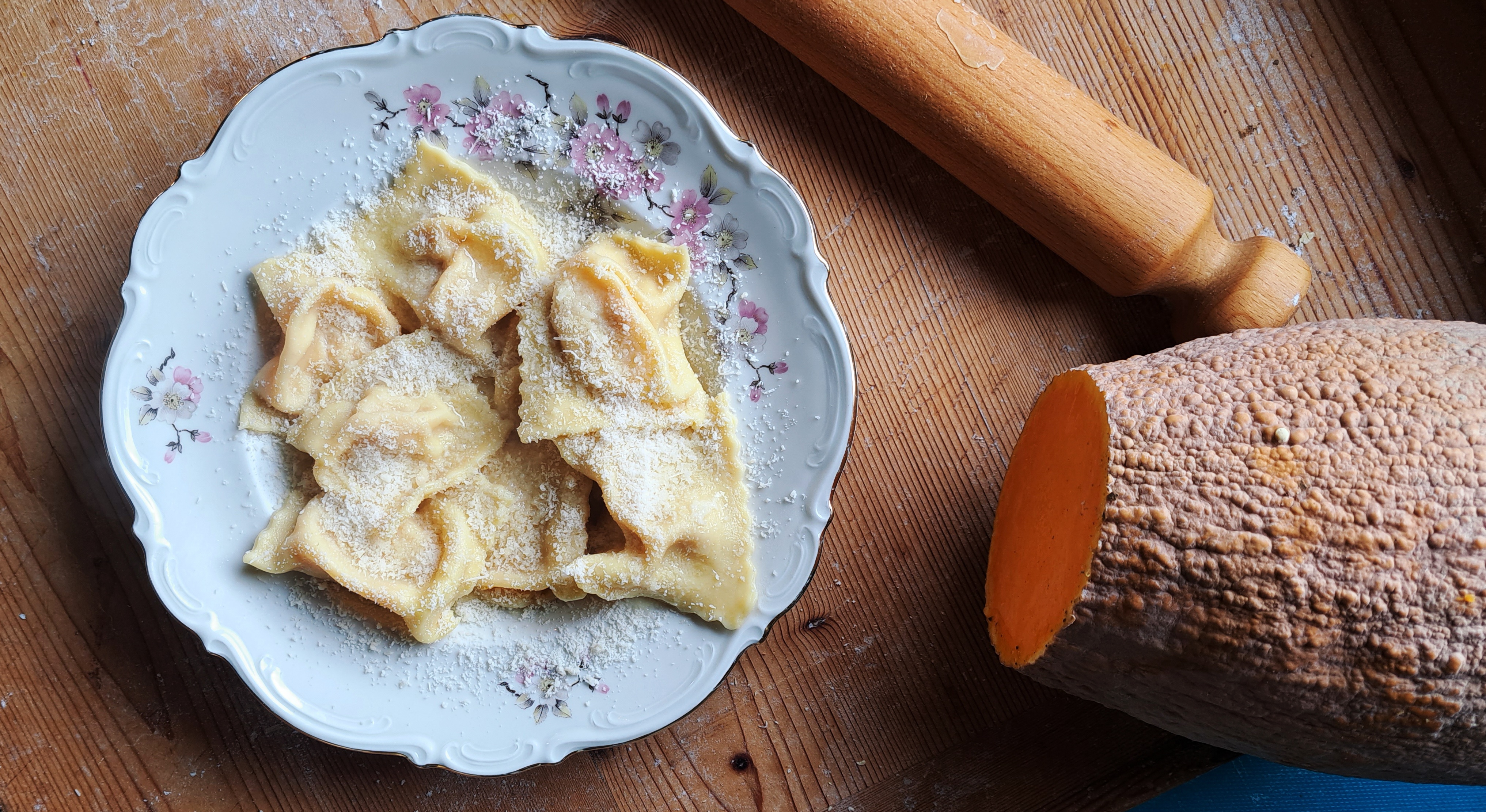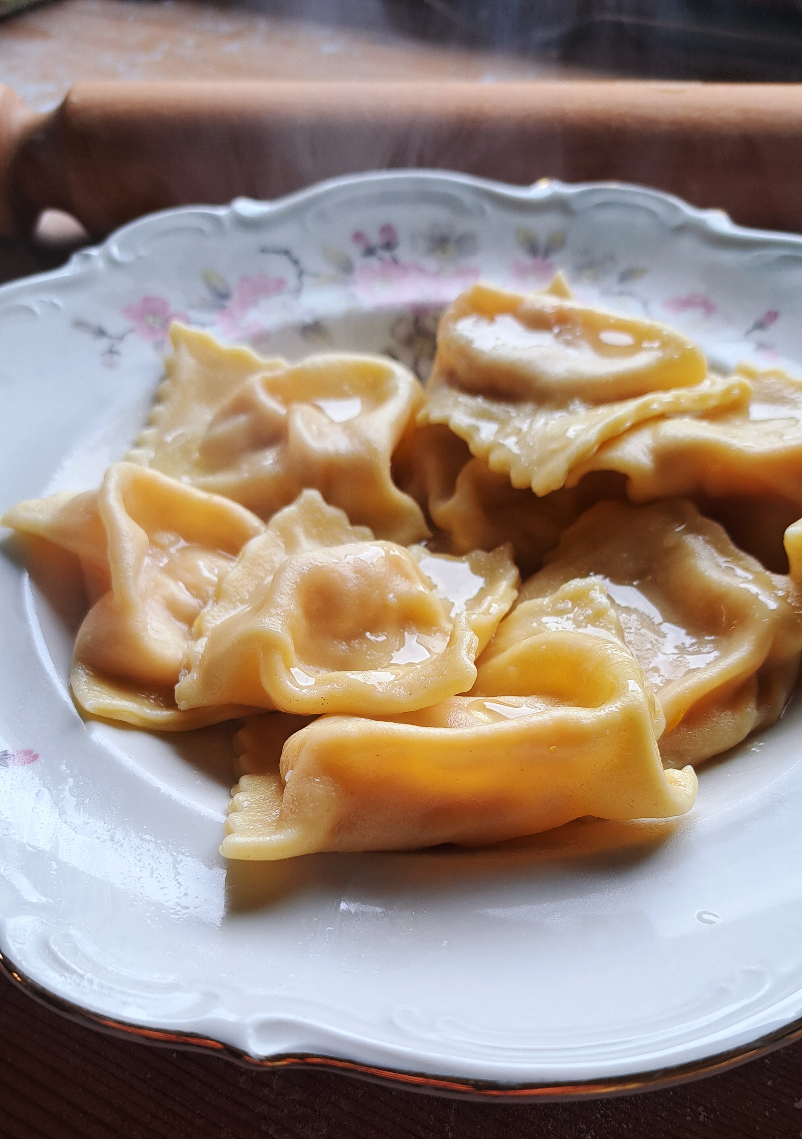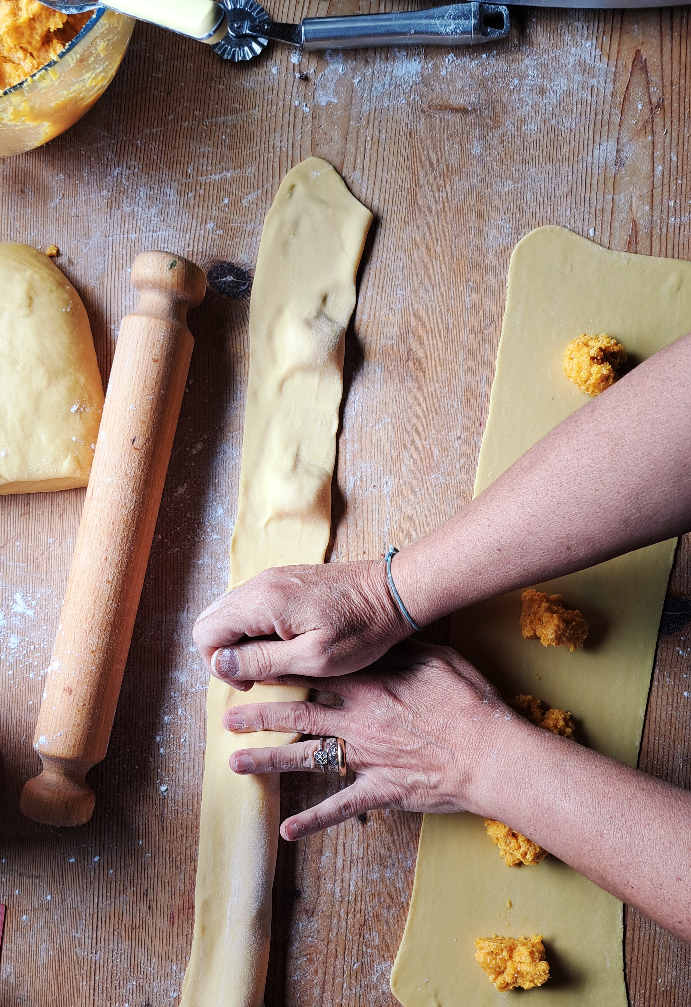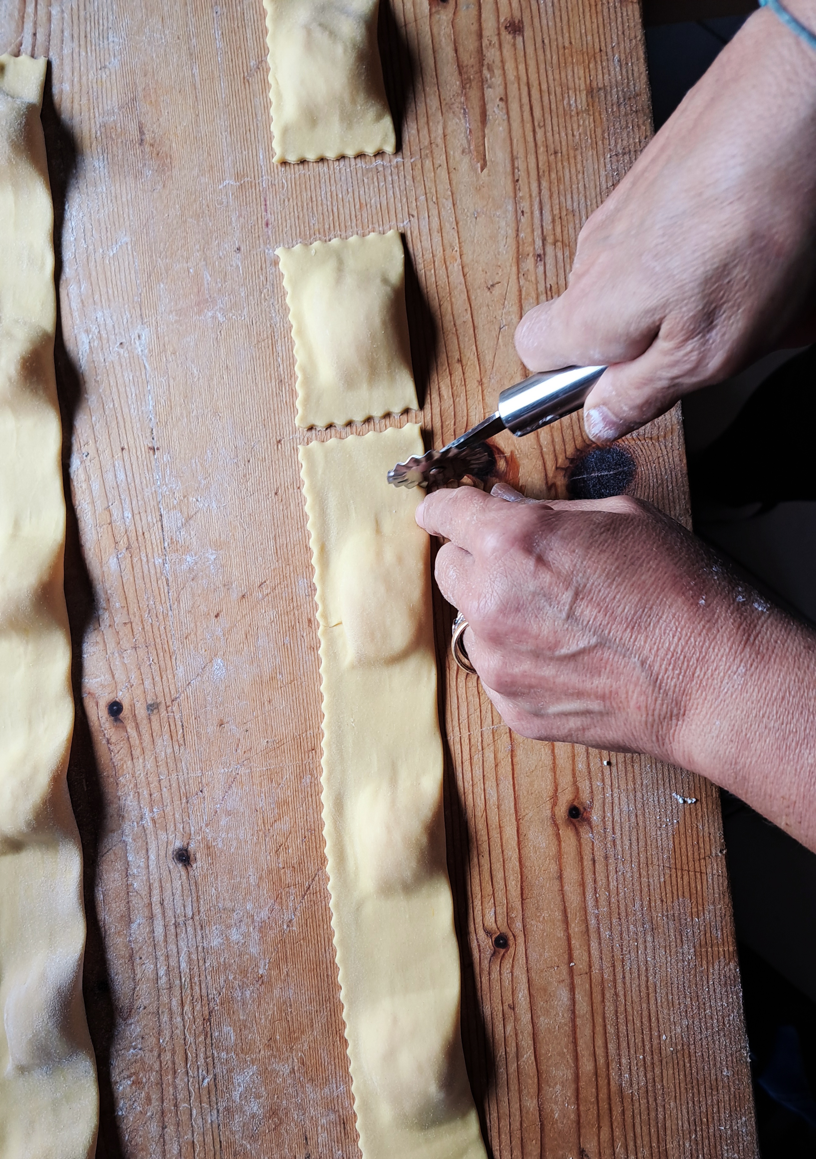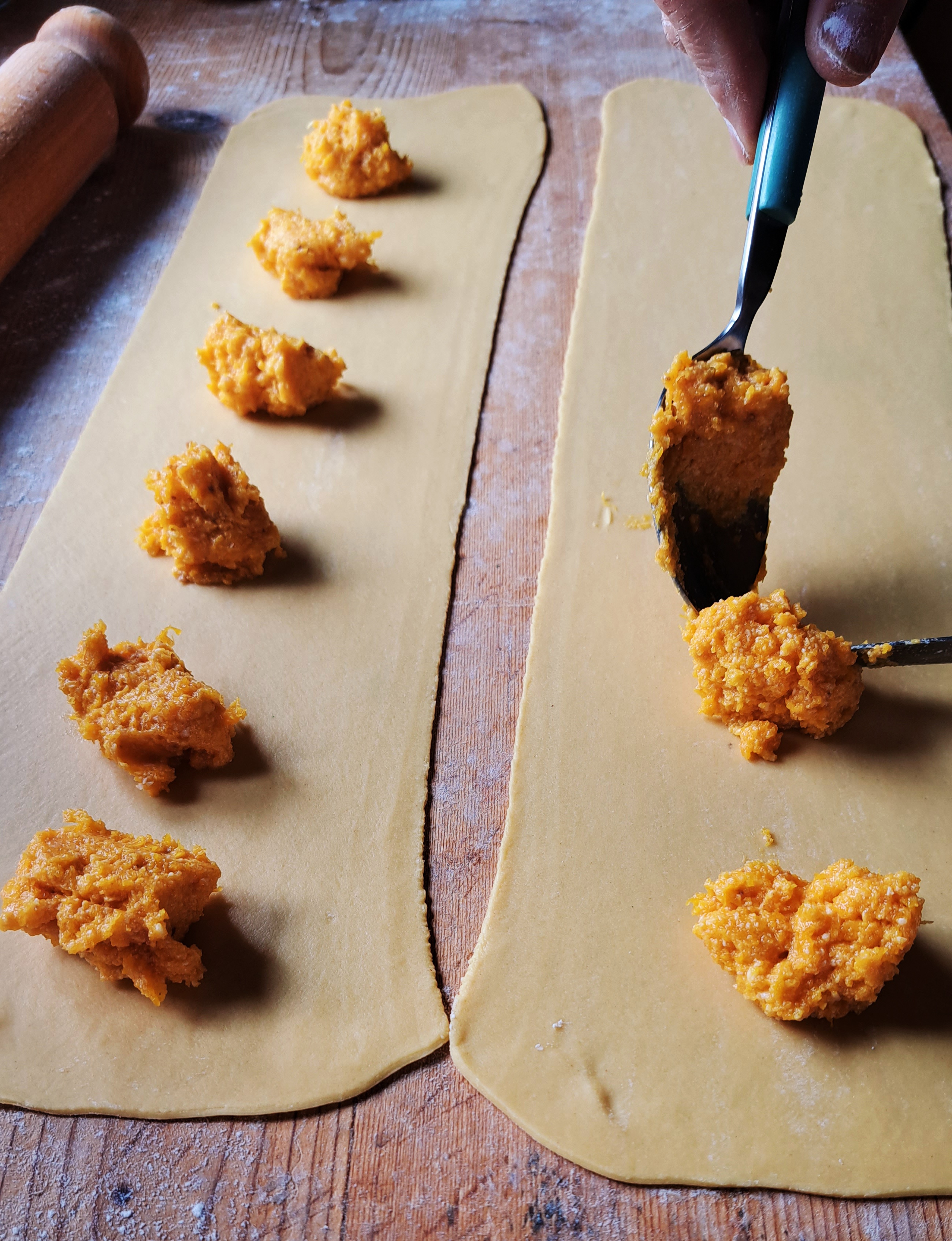 Poi partiremo con di confezionamento dei tortelli come da tradizione; tiriamo la sfoglia con la macchina, facciamo tanti piccoli mucchietti di ripieno e ricopriamo con la sfoglia, schiacciano con le mani in modo da eliminare l’aria che darebbe problemi durante la cottura, tagliamo la pasta in eccesso con la rotella e i tortelli sono pronti per essere cotti.