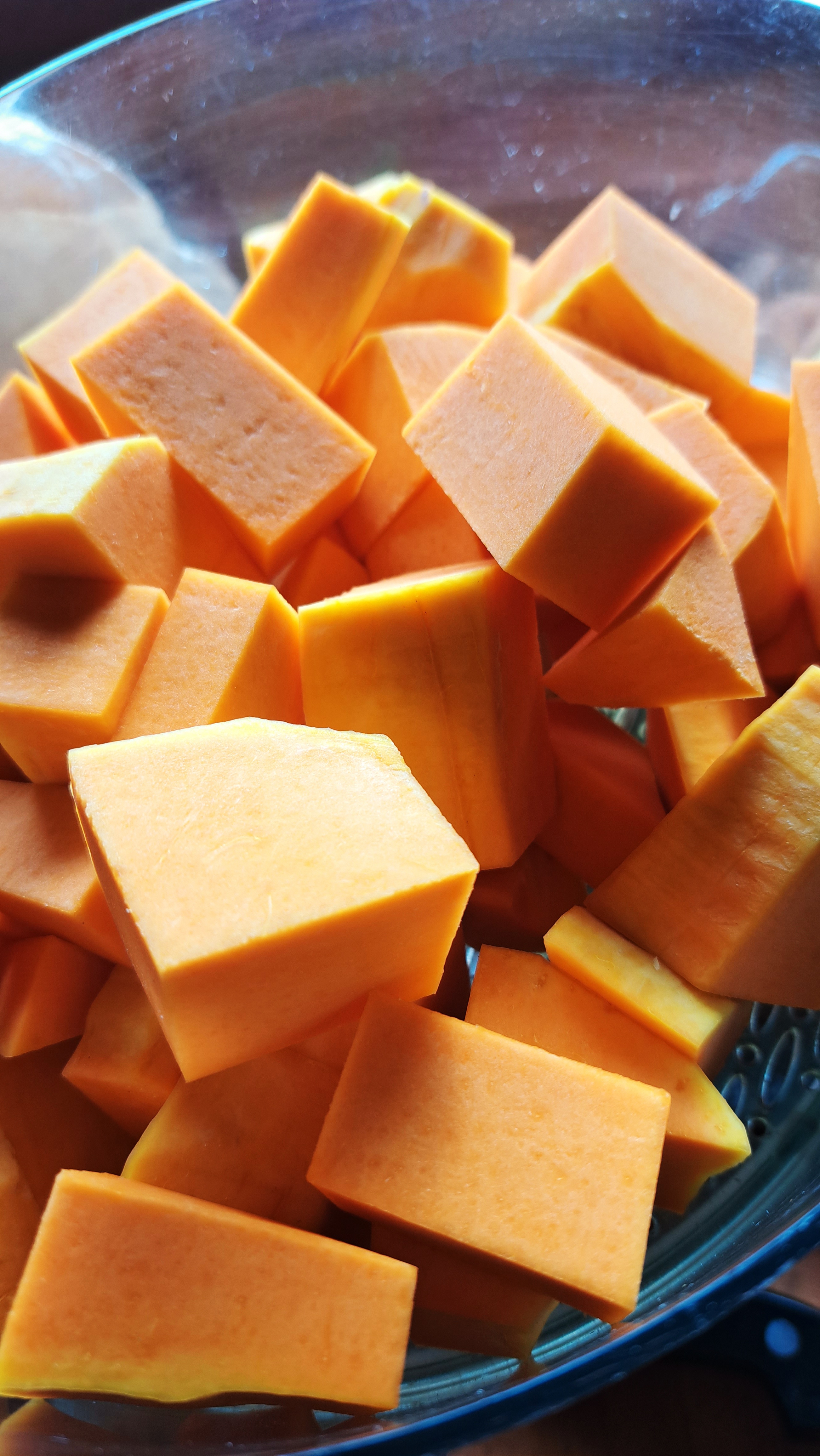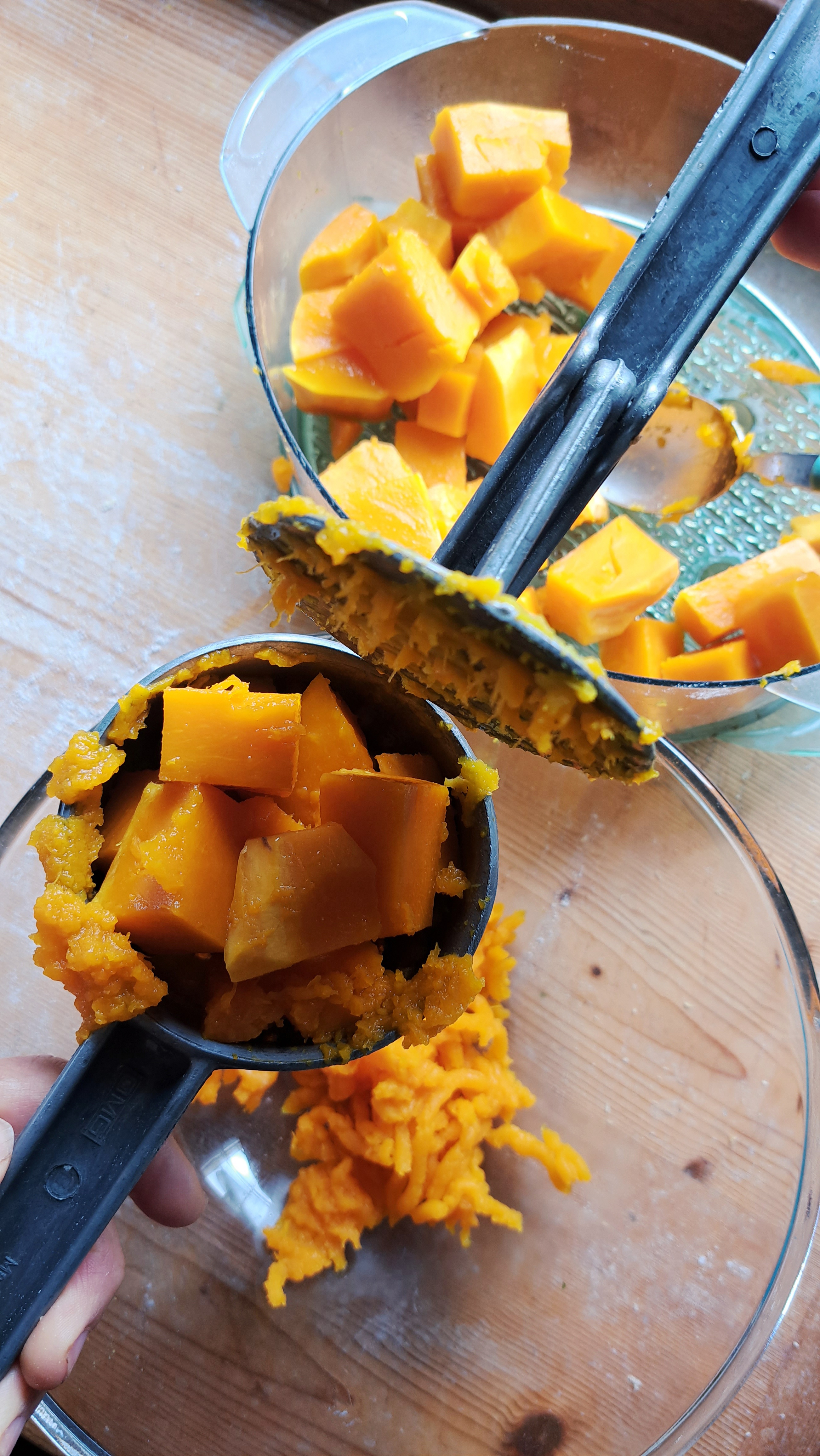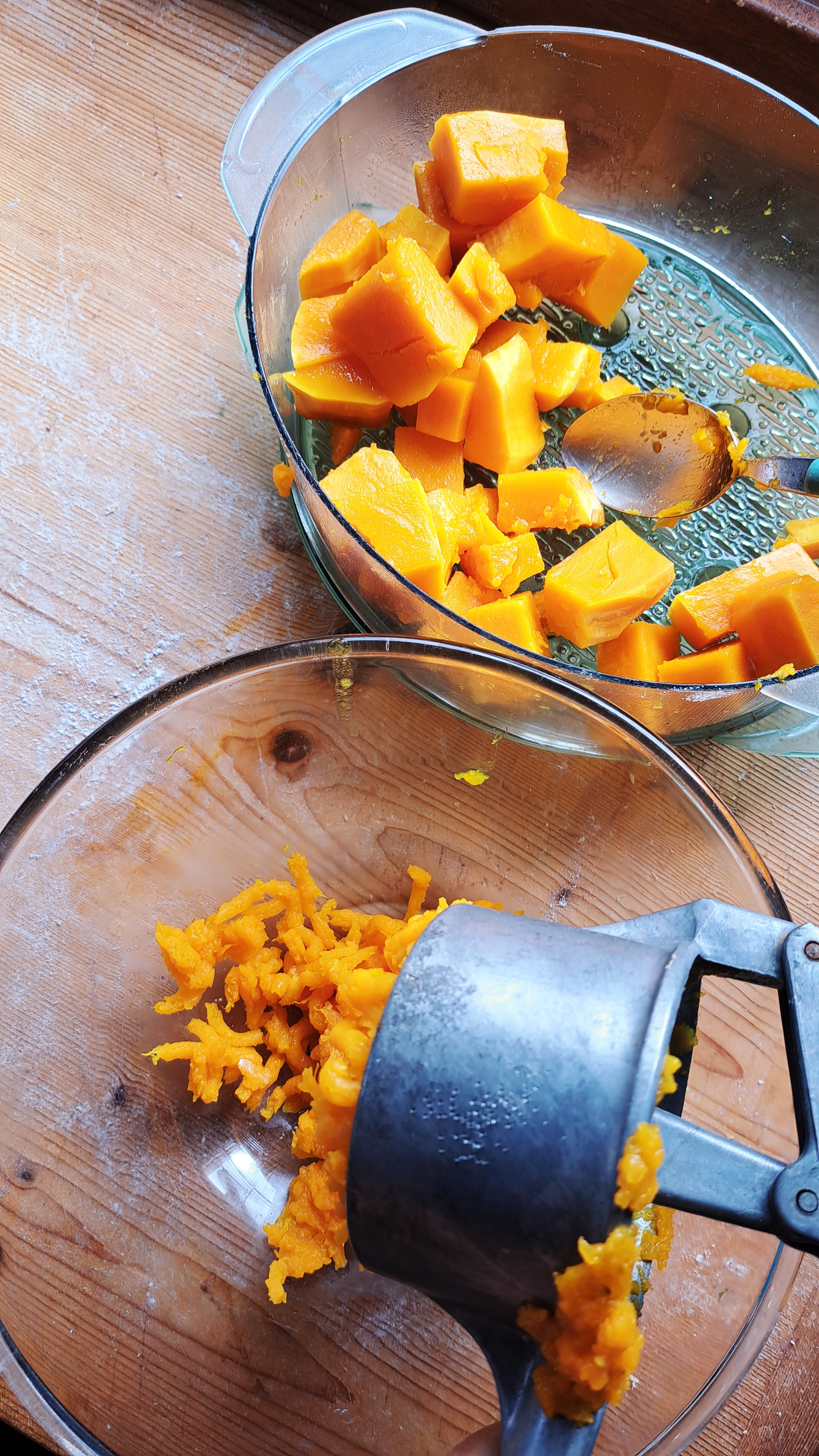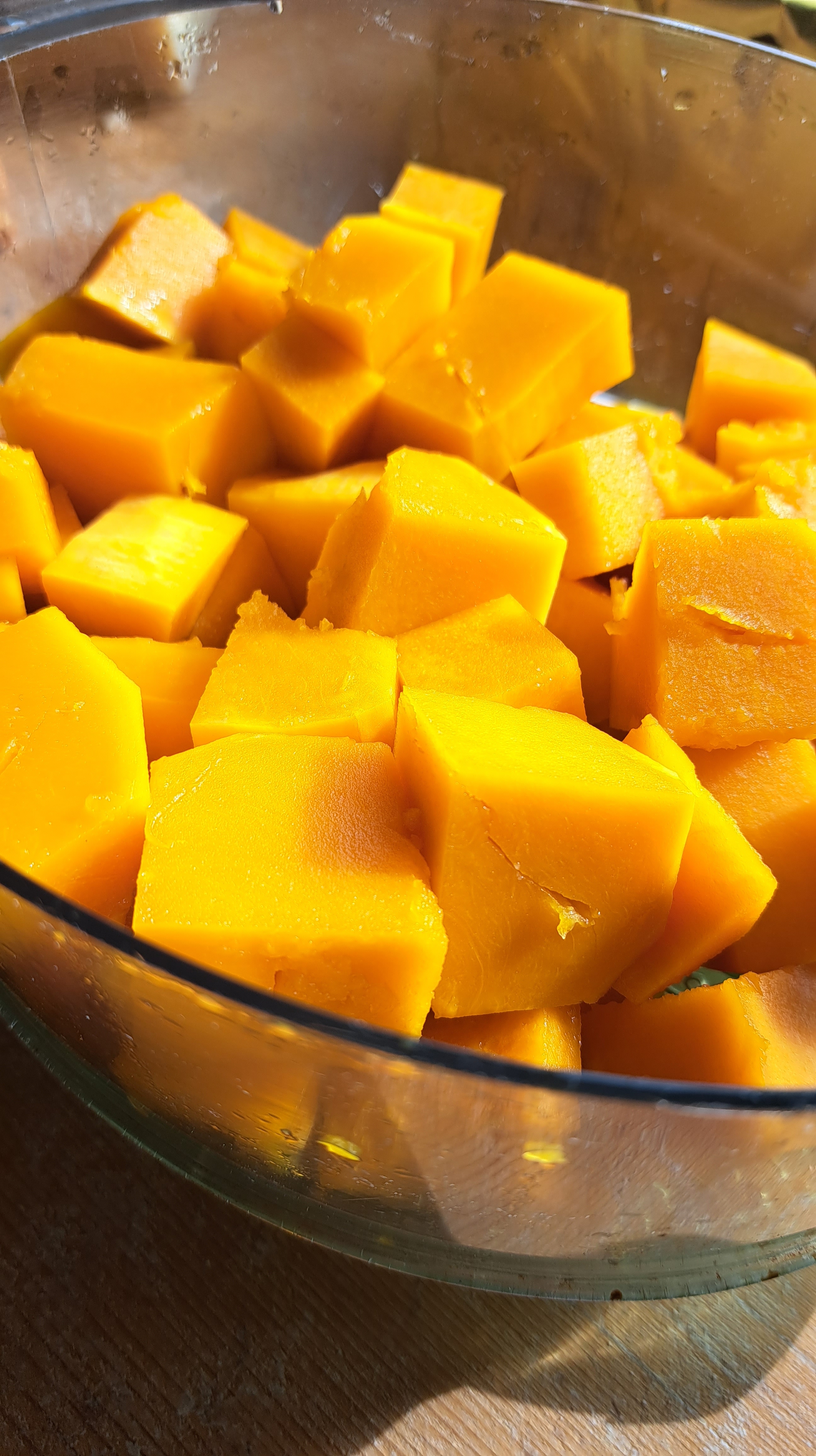 Per prima cosa puliamo la zucca; per la cottura possiamo scegliere se cuocerla al forno coperta con la stagnola, e allora la taglieremo a spicchi grandi, oppure come abbiamo fatto noi, al vapore nella vaporiera e, in questo caso l’abbiamo tagliata a cubetti per velocizzare i tempi.