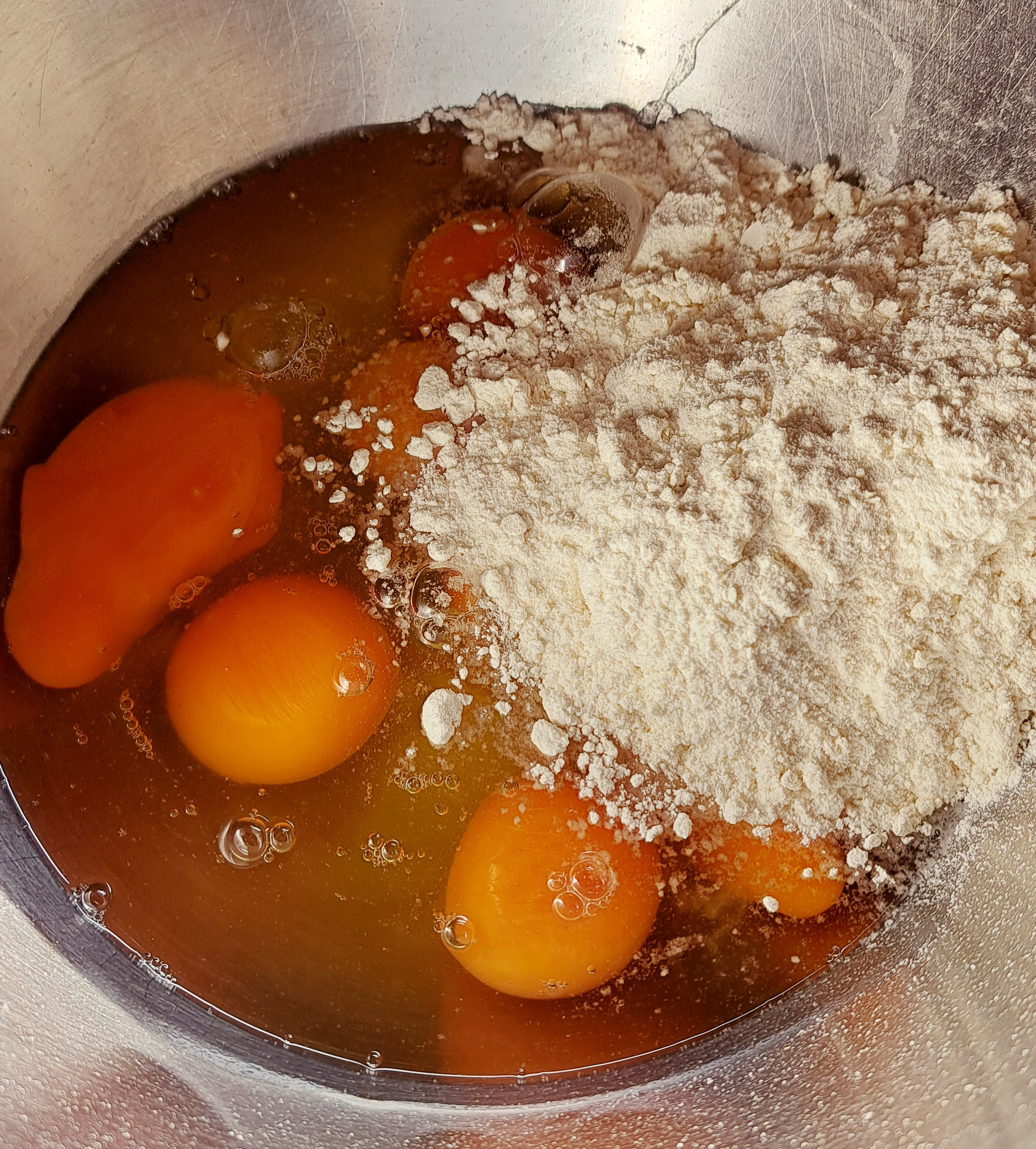 Come abbiamo già visto in altre ricette, per la preparazione della sfoglia, che possiamo fare a mano o in planetaria, mettiamo insieme farina uova e un pizzico di sale e lavoraimo fino a raggiungere un impasto bello liscio che lasceremo riposare in un sacchetto di plastica.