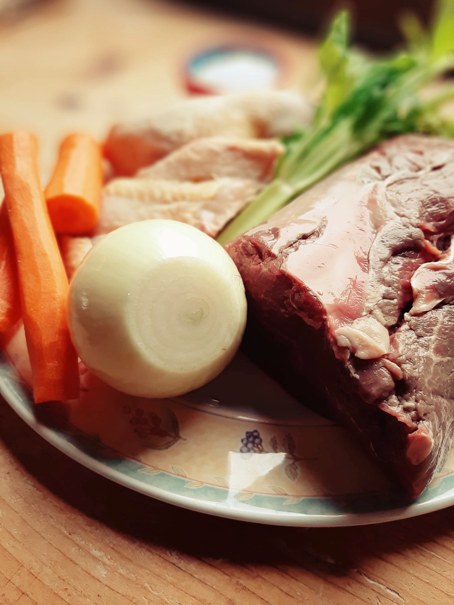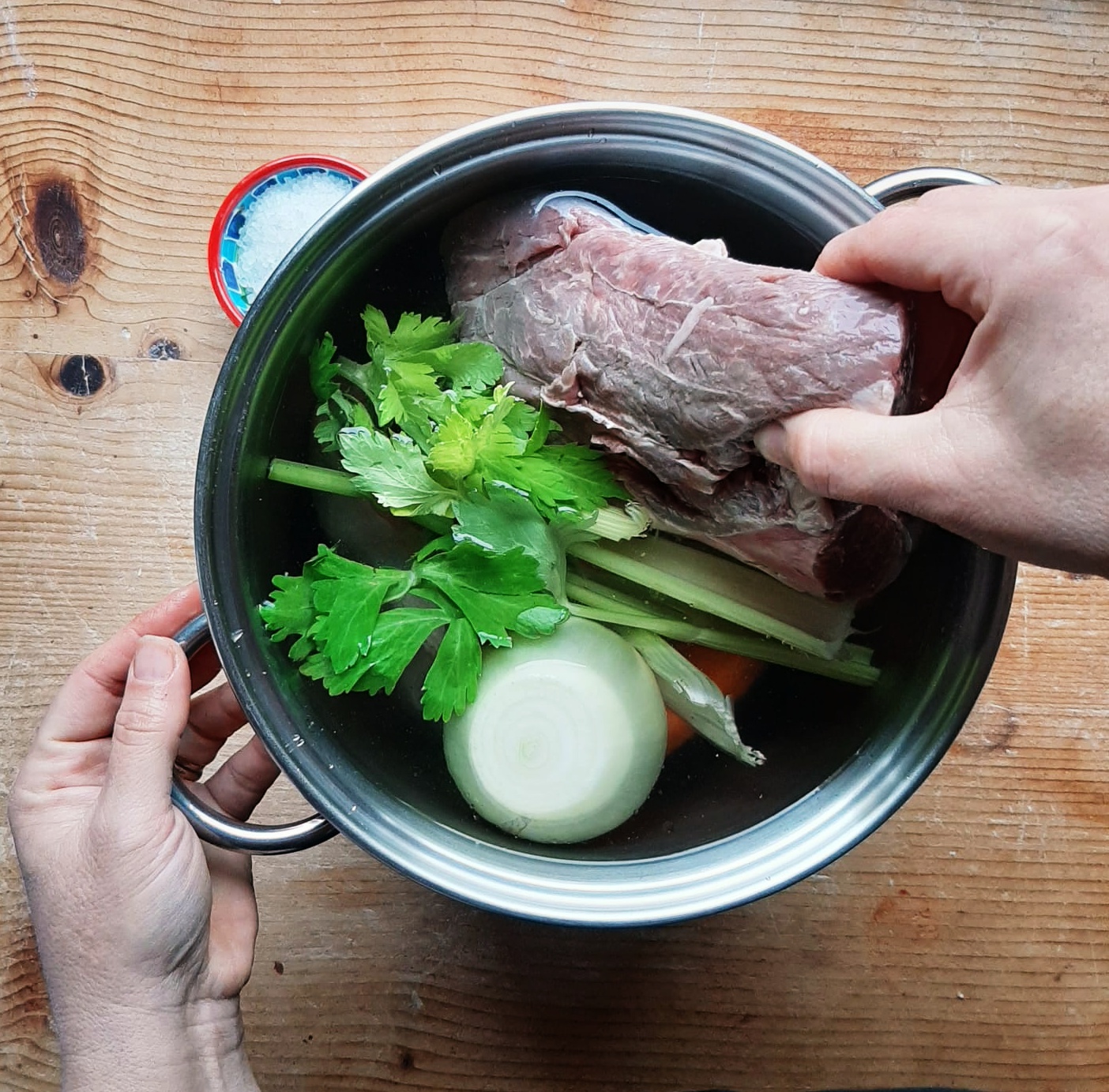 - Fill a large pot with plenty of cold water and add the meat, vegetables, and coarse salt. Place the pot over heat and bring it to a boil.