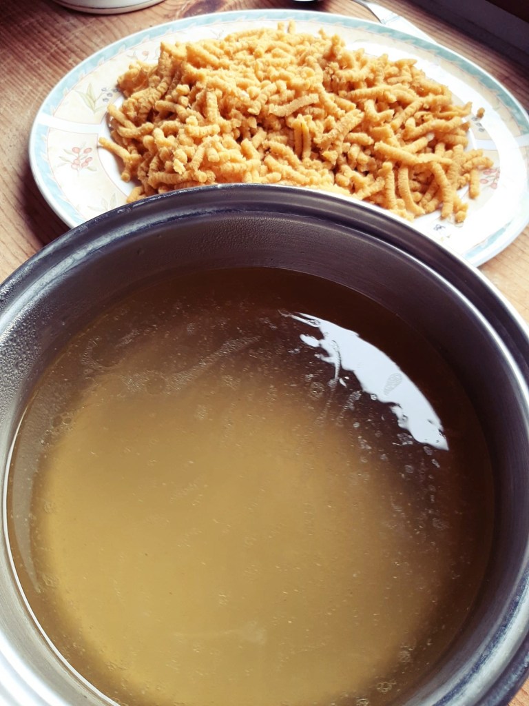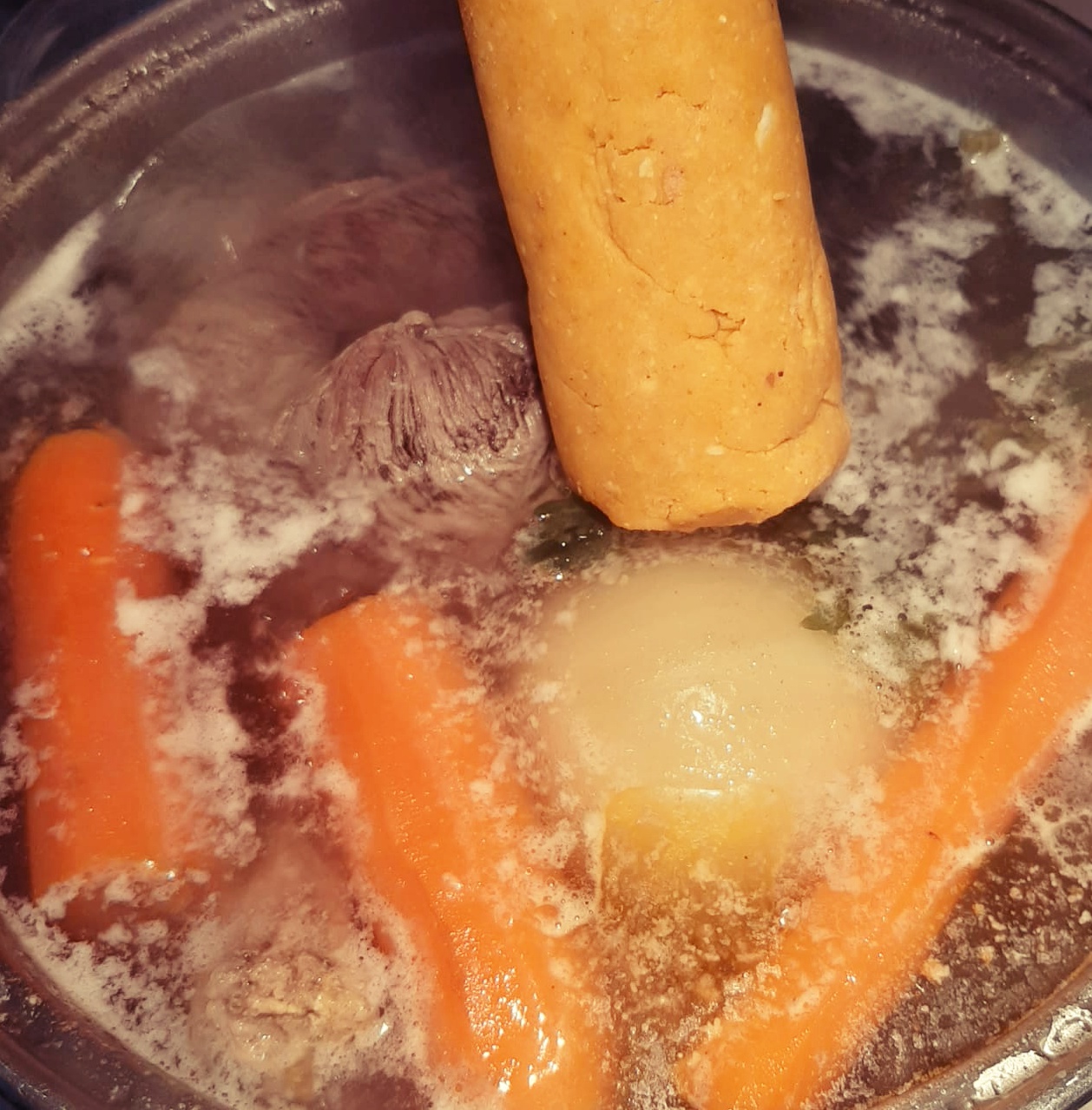 - Mix all the ingredients together until they form a compact cylinder, which is then added to the broth during cooking. It needs to cook for at least 1.5 hours.
