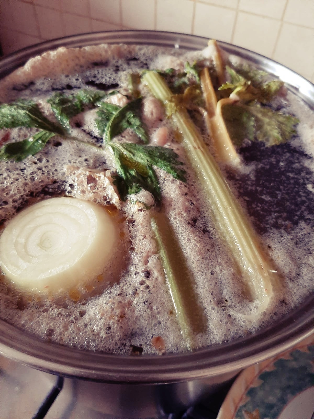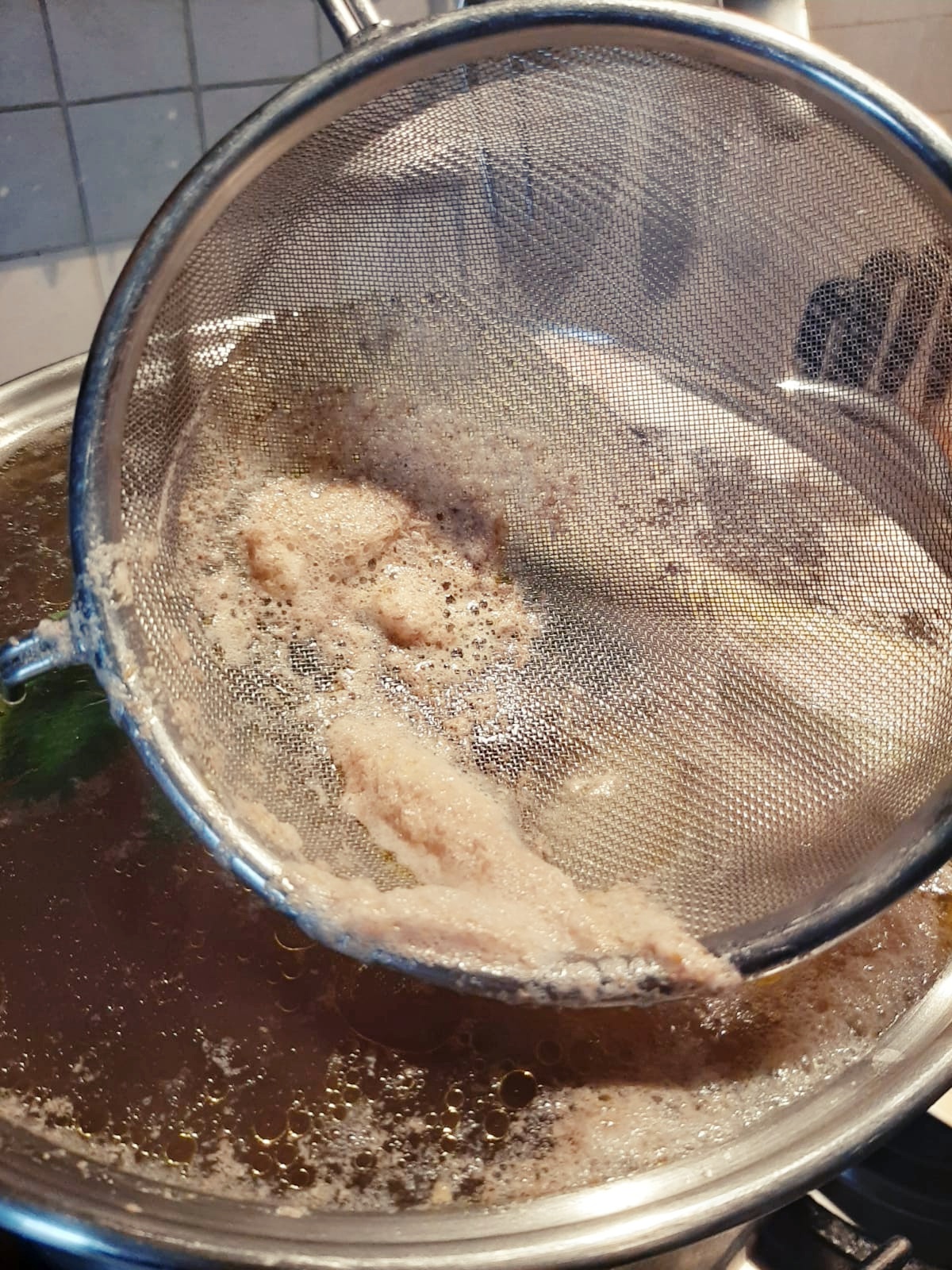 - At some point, you’ll notice a “foam” forming on the surface. Use a skimmer or fine mesh strainer to remove it, as it would compromise both the flavor and the clarity of the broth. This skimming process should be repeated until no more residue is visible on the surface. Once the broth is clear, partially cover the pot with a lid, lower the heat, and let it gently simmer for at least 3 hours.