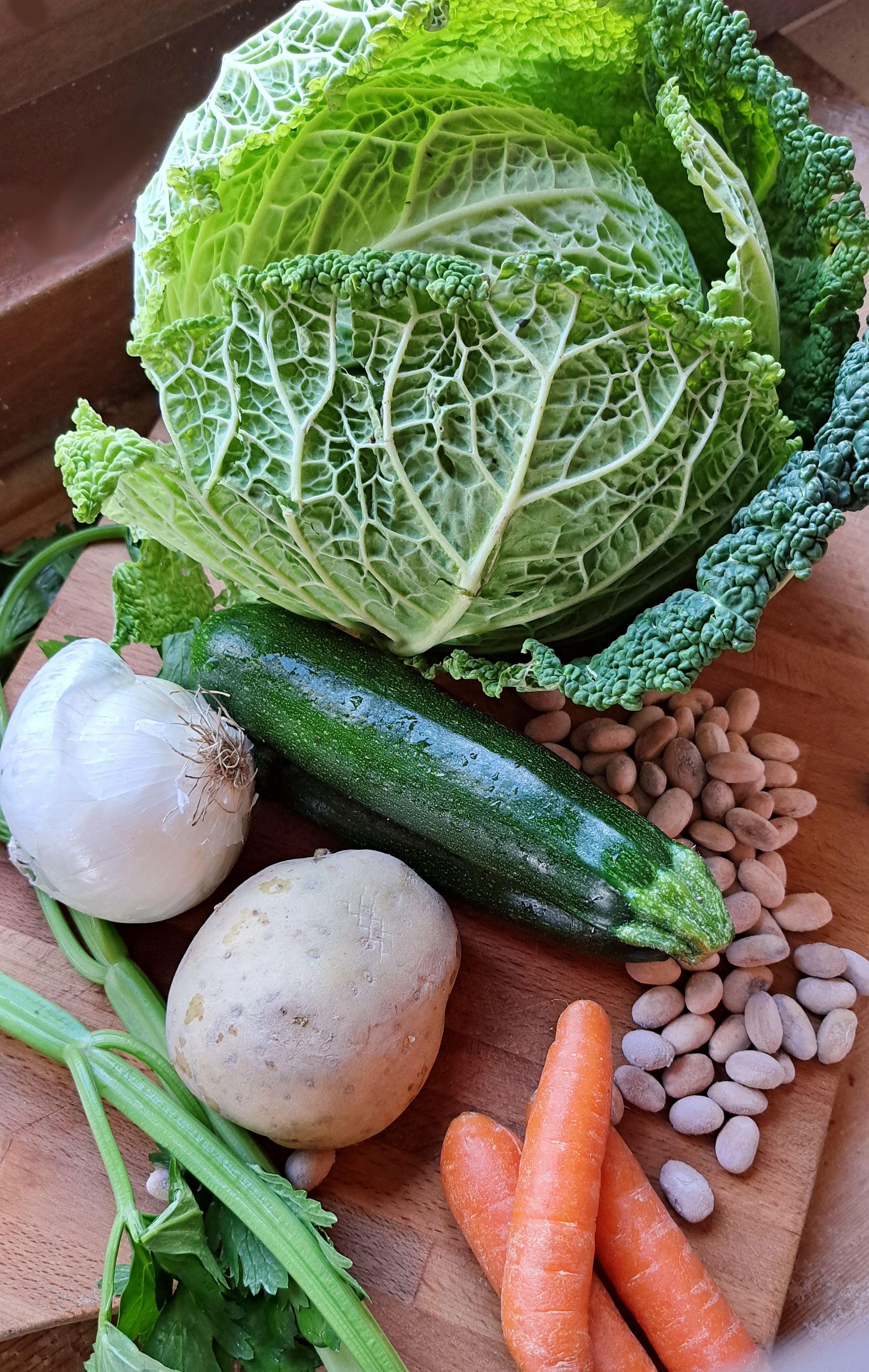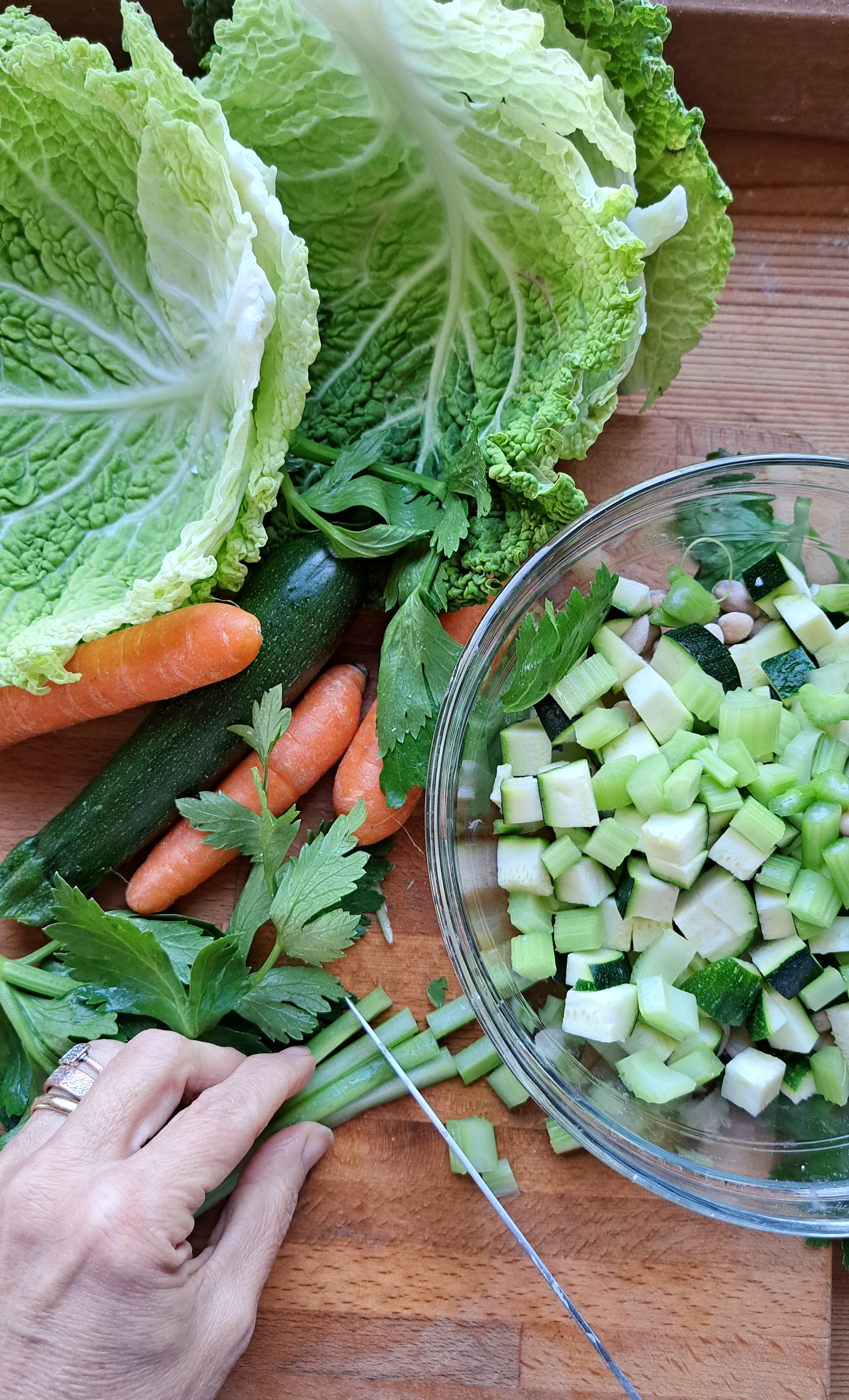 Laviamo bene le verdure e tagliamole a pezzettini; noi abbiamo usato sedano, carote, zucchine, verza, fagioli, porro e patate.