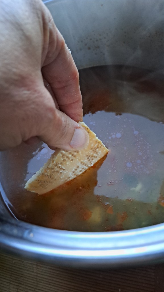Nel frattempo prepariamo la crosta di Parmigiano Reggiano, raschiandola leggermente con il coltello per togliere le impurità; quello della crosta dentro le minestre non è solo un vezzo per mangiarsele dopo, ma è un valore aggiunto al gusto finale dato dal sapore trasmesso durante la cottura, per questo abbiamo scritto “facoltativo ma consigliatissimo”.