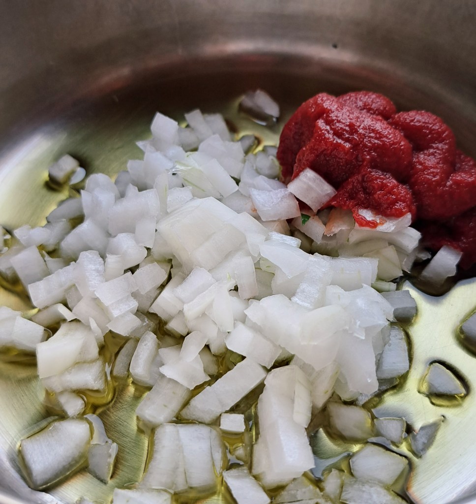 Possiamo preparare in anticipo anche il soffritto che così avrà tempo di insaporirsi bene; tagliamo la cipolla a pezzettini, la mettiamo in un pentolino con olio, la facciamo appassire pian piano e aggiungiamo un bel cucchiaione di concentrato di pomodoro con un goccio di acqua. Facciamo andare il soffritto per una ventina di minuti e aggiungiamolo al minestrone una decina di minuti prima di finire la cottura.