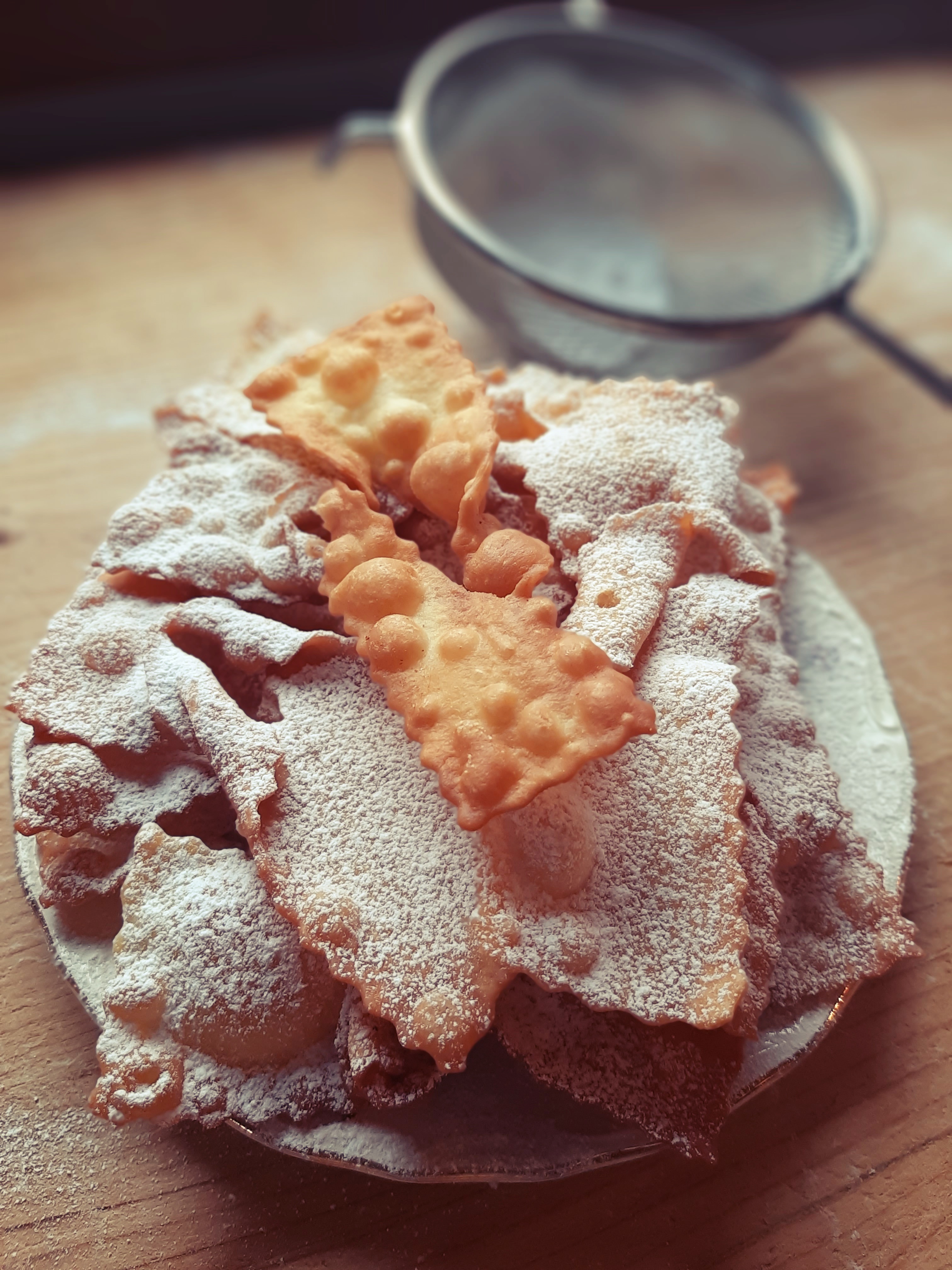 - Fry each chiacchiera for about 20 seconds on one side and slightly less on the other, then drain, transfer to a tray, and dust generously with powdered sugar.