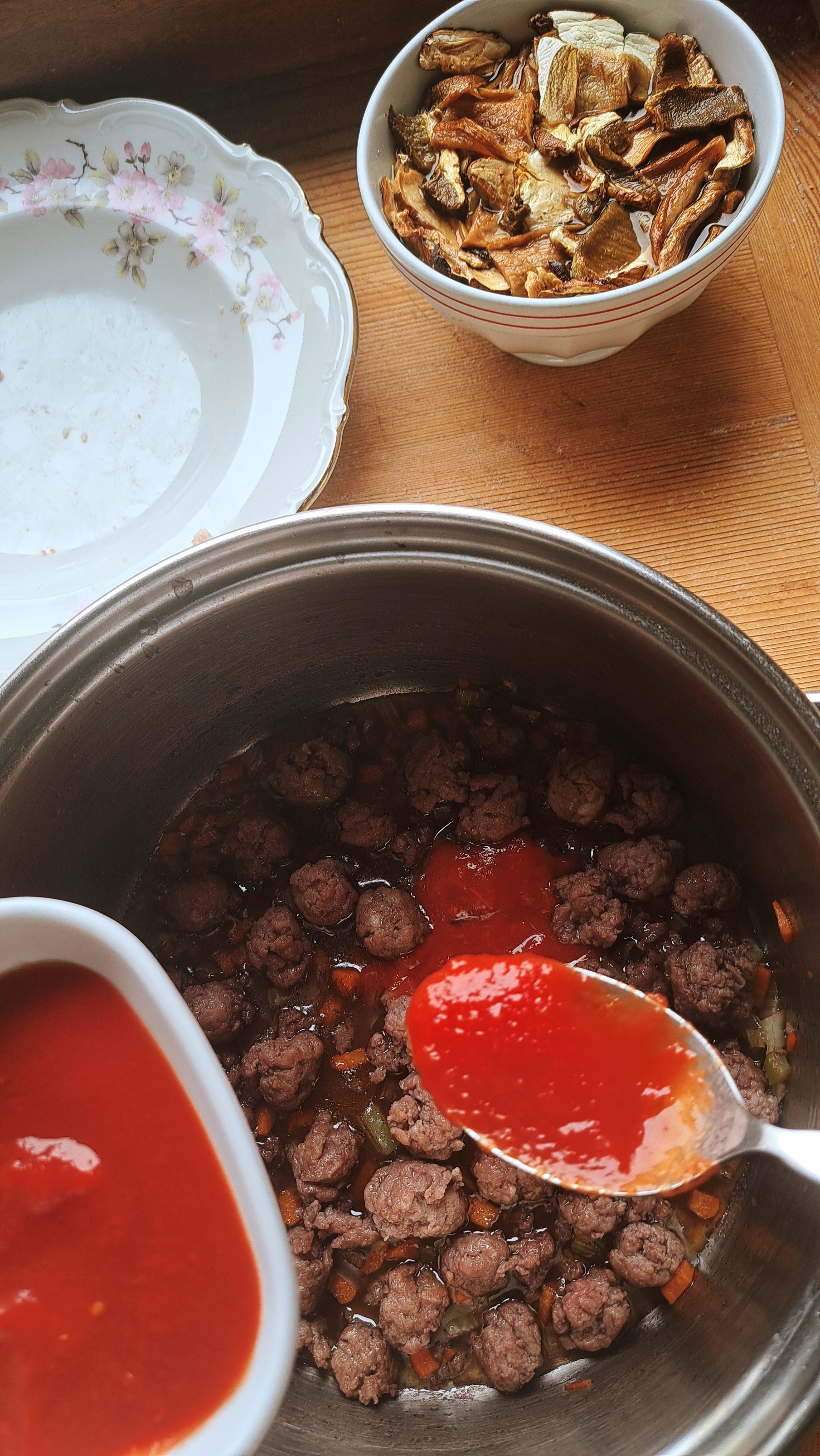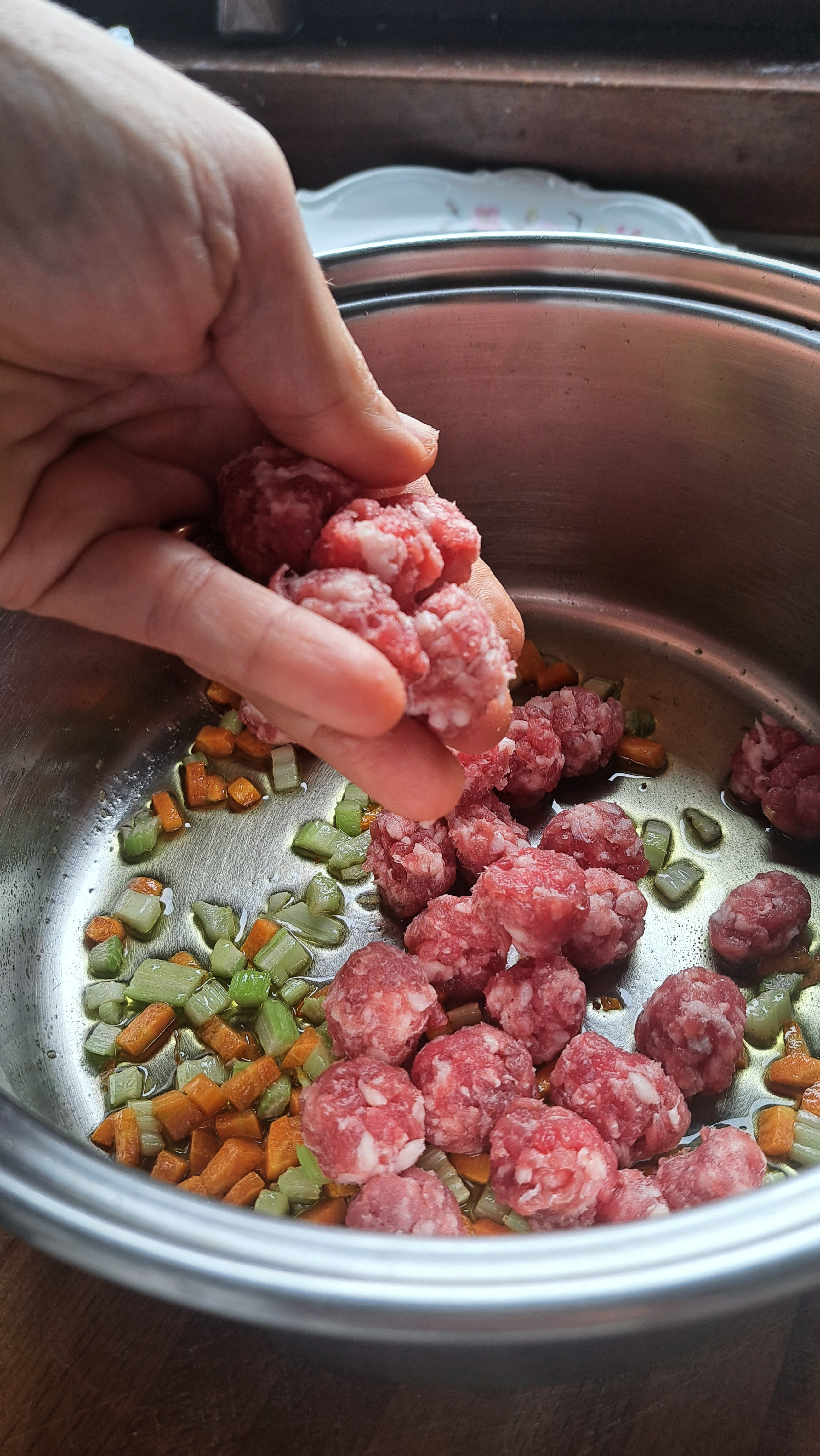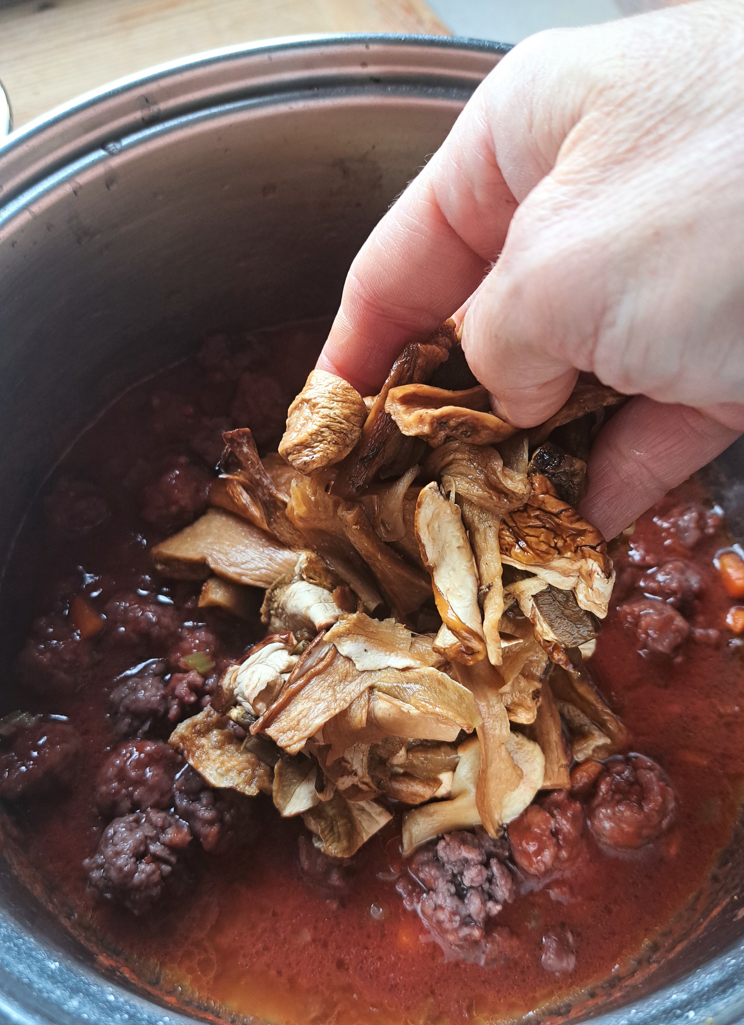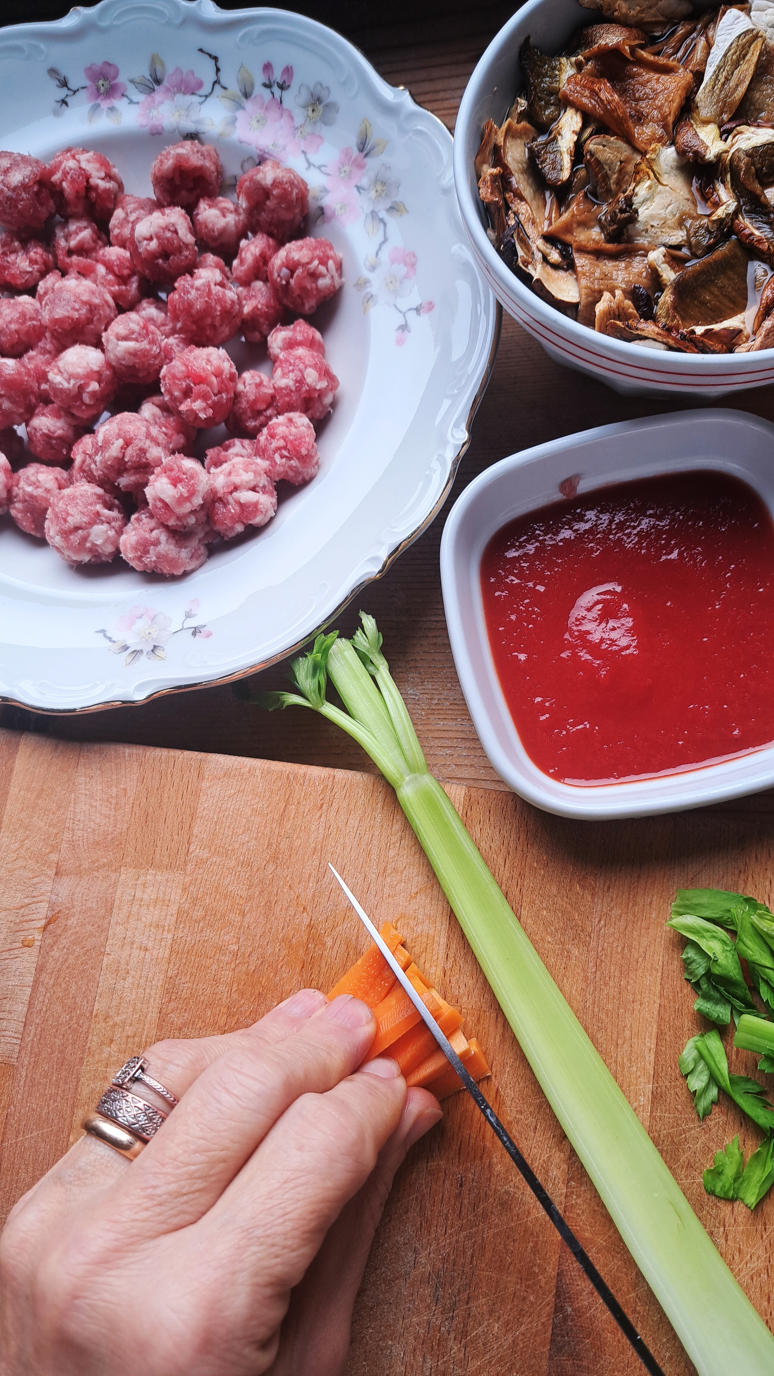 Prepariamo un sofrittino con sedano, carota e cipolla, poco olio in una casseruola; facciamo andare le verdure qualche minuto e poi aggiungiamo la polpettine di salamino. Facciamo rosolare leggermente, sfumiamo con un mezzo bicchierino di vino e aggiungiamo il passato di pomodoro. Facciamo cuocere per 15 minuti e poi aggiungiamo i funghi; facciamo cuocere a fuoco basso per altri 20 minuti, aggiungendo se necessario un po’ di acqua di ammollo dei funghi.