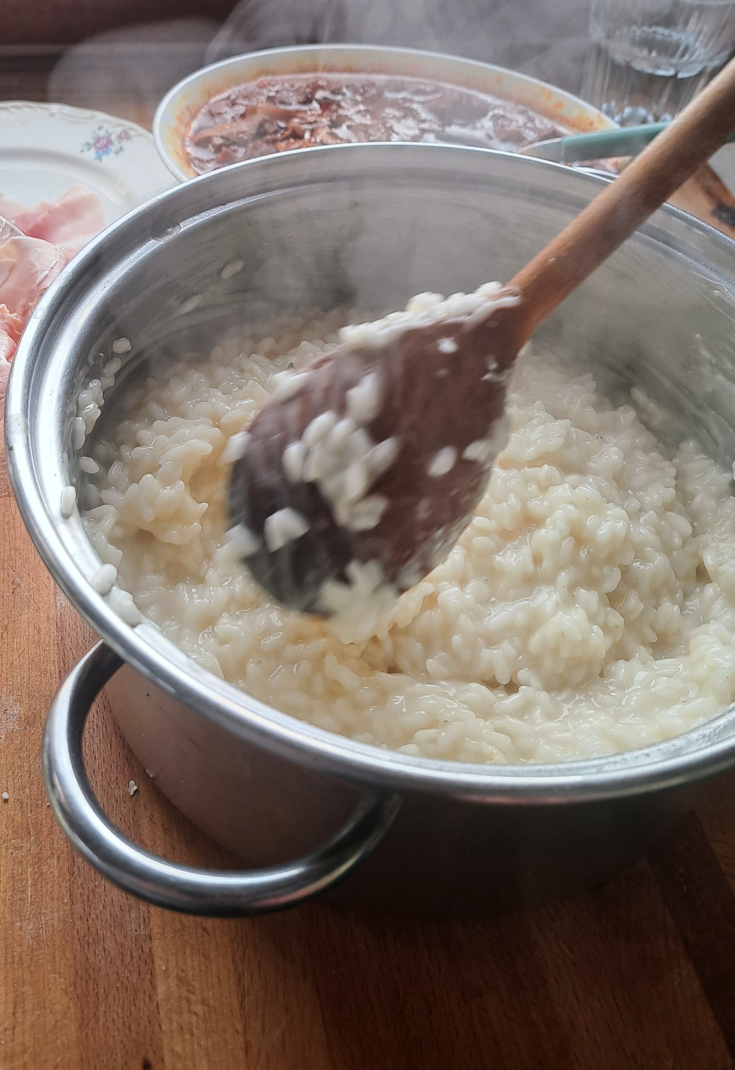 Dopo qualche minuto aggiungiamo il riso e lo facciamo tostare, aggiungiamo mezzo bicchiere di vino bianco e una volta sfumato, saliamo e procediamo la cottura con un mestolo di brodo caldo alla volta.