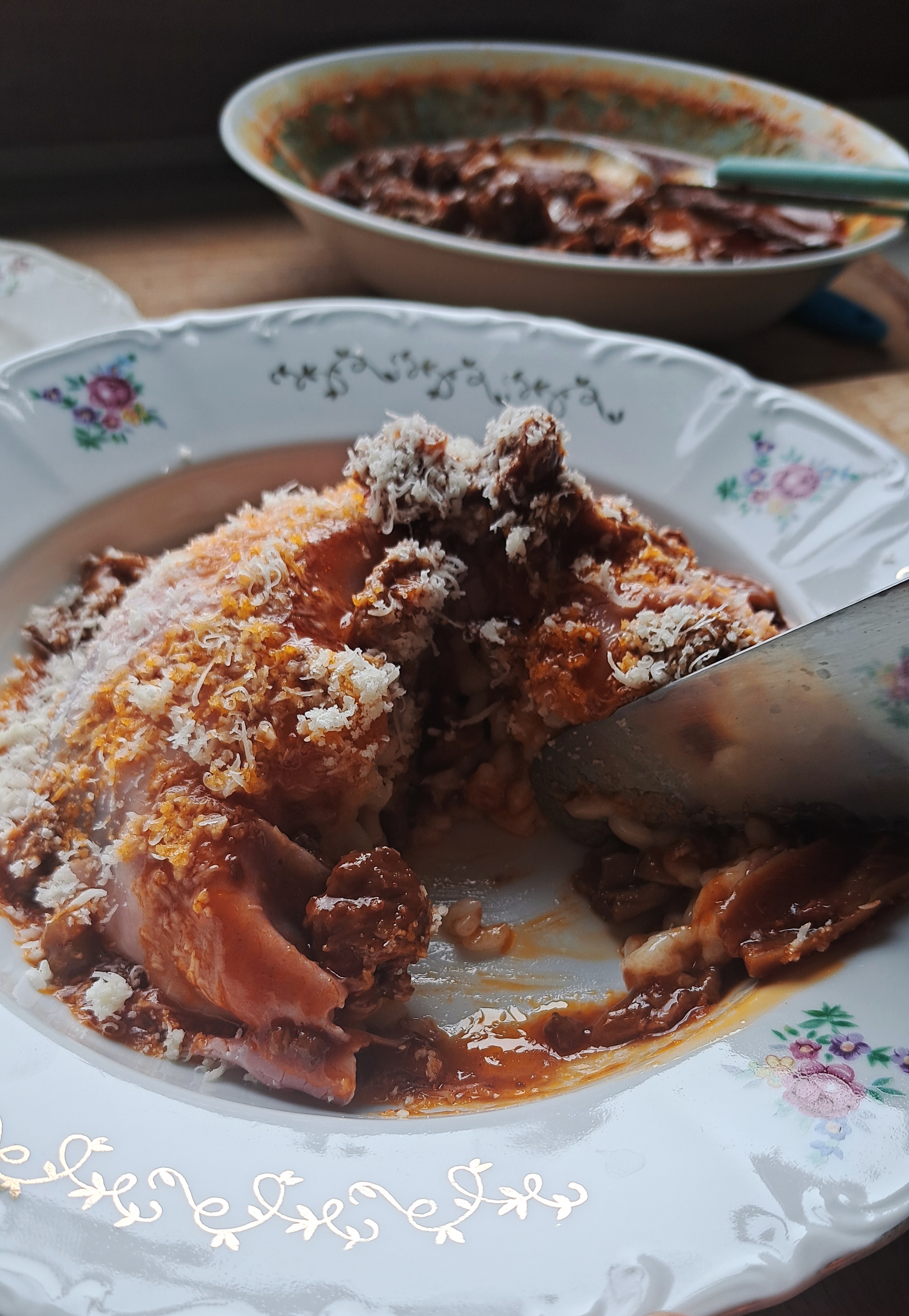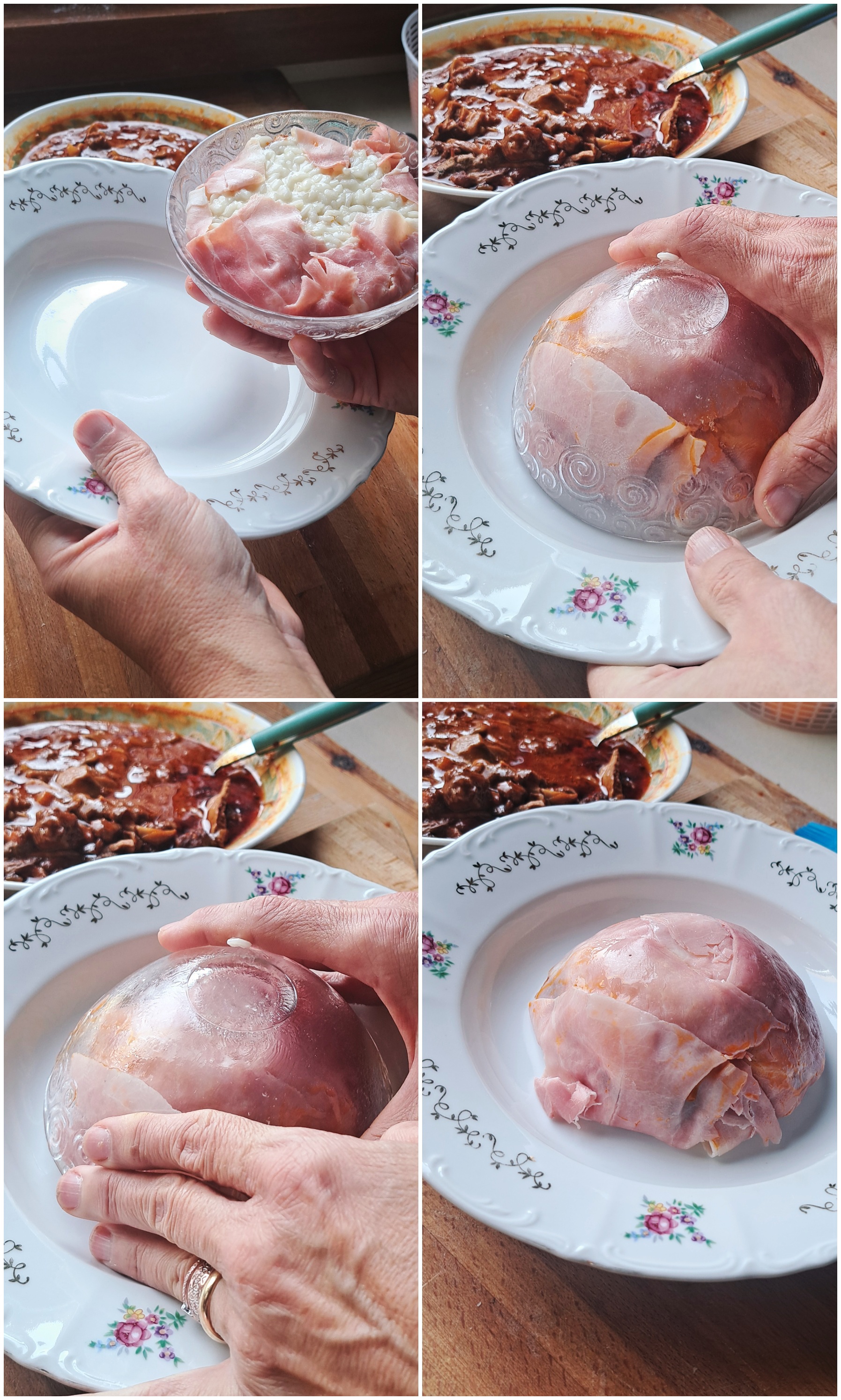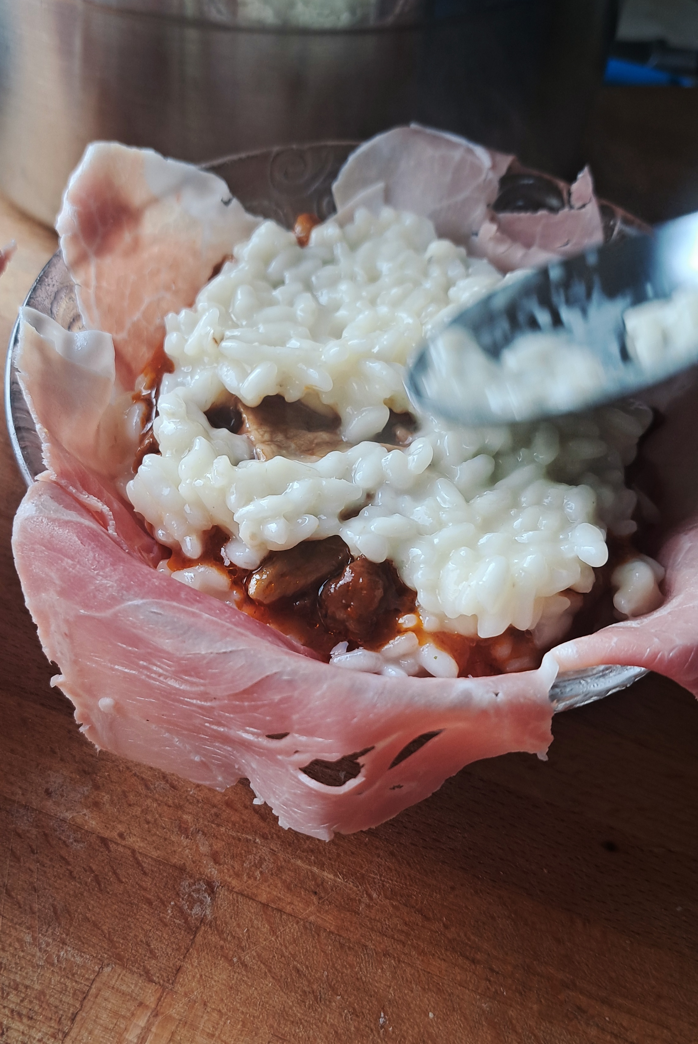 Portiamo a cottura, condiamo con abbondante Parmigiano Reggiano e procediamo con il montaggio del piatto: prepariamo una ciotolina da dessert, la ricopriamo con il prosciutto cotto, facendone sbordare una parte e la riempiamo a metà con il risotto. Mettiamo 1 o 2 cucchiai di ragù di funghi e salamino e ricopiamo con il risotto, pressando leggermente. Ricopriamo con la parte di prosciutto cotto sbordante e capovolgiamo il savarin in una fondina. Concludiamo il piatto con un cucchiaio di ragù di salamino e funghi sopra al savarin e una abbondante manciata di Parmigiano Reggiano grattugiato.