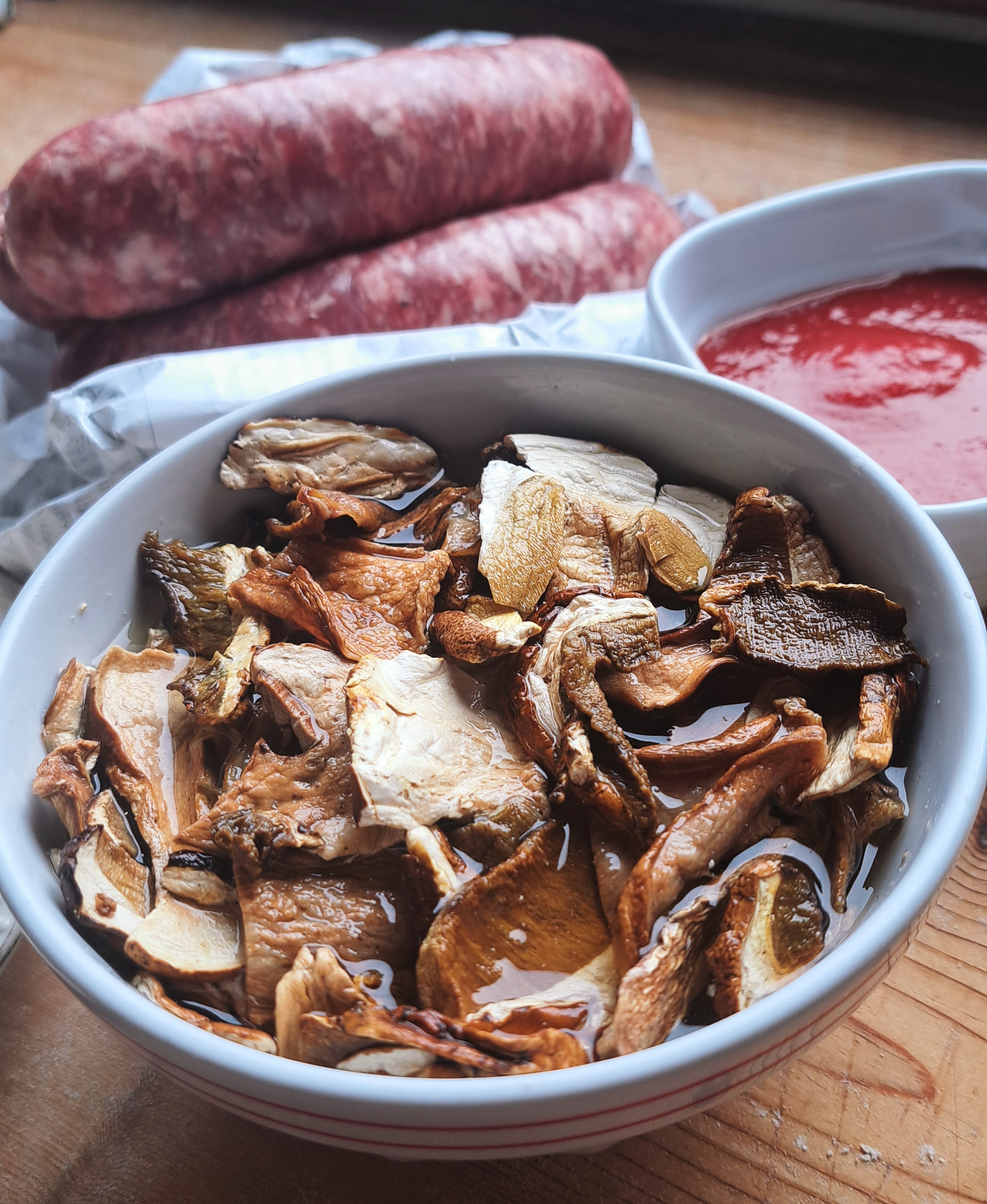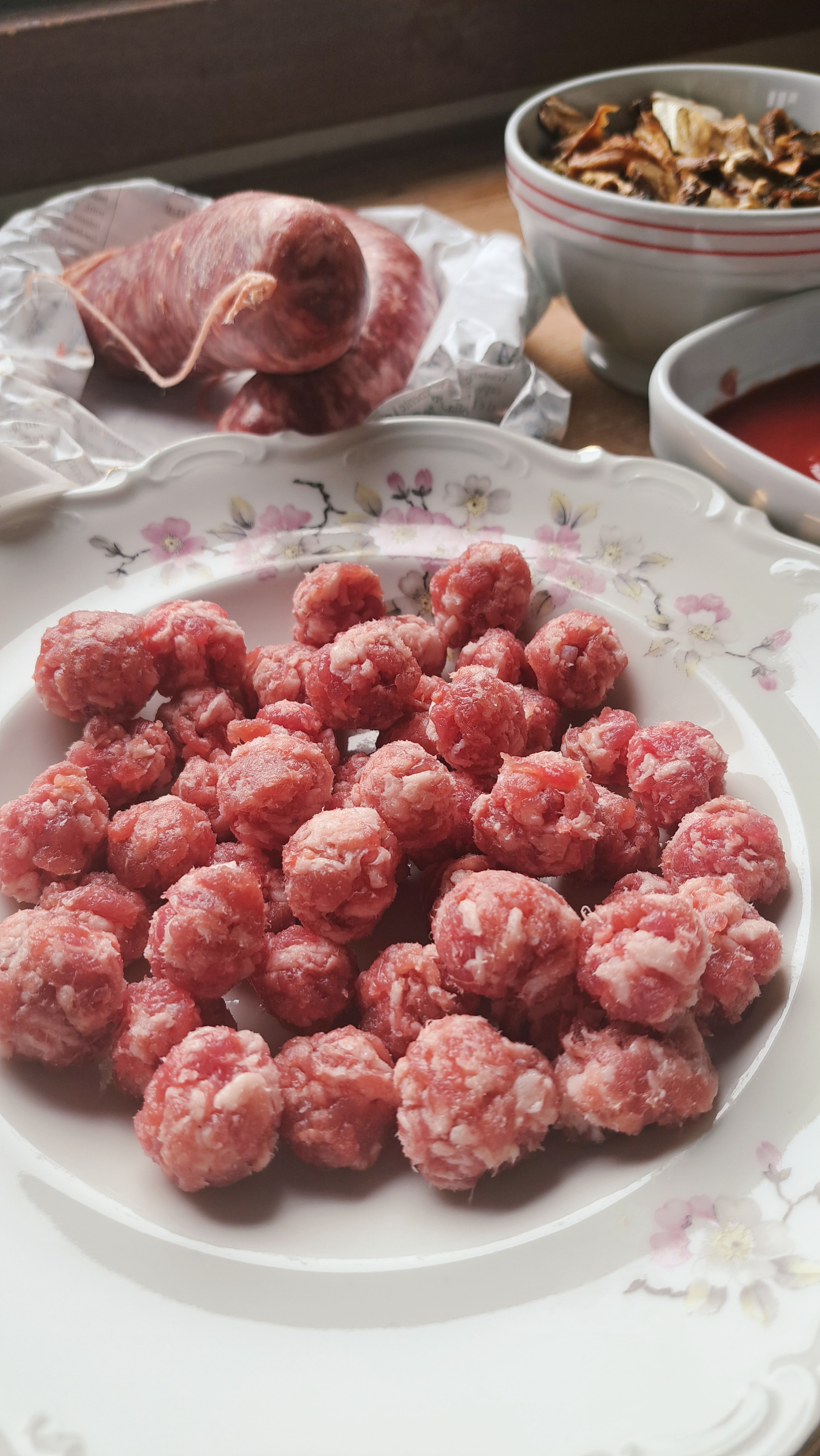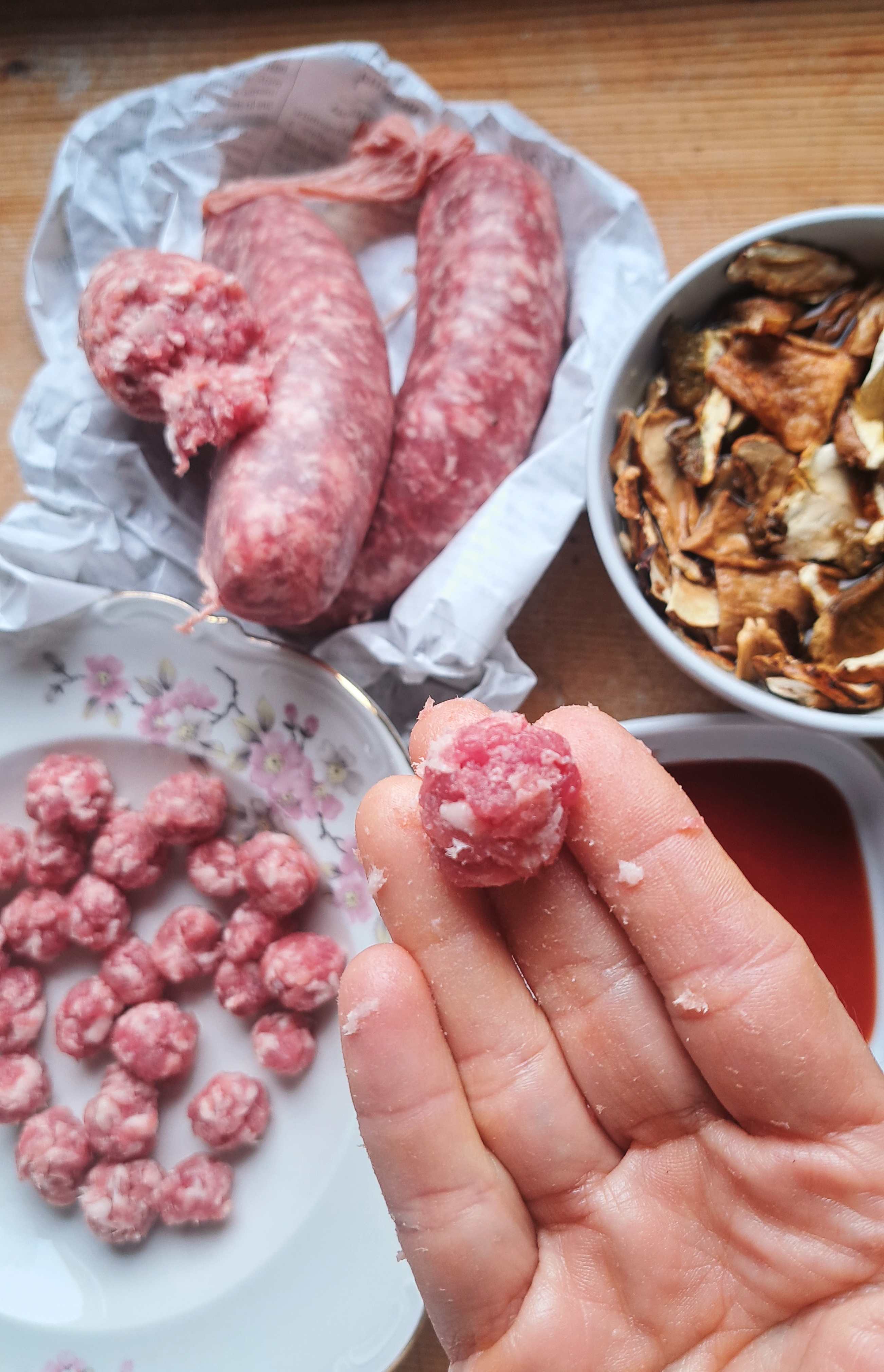 Partiamo con il preparare il sugo con i salamini e i funghi; ammolliamo i funghi secchi in una ciotola con acqua tiepida e nel frattempo prepariamo tante piccole polpettine con la pasta del salamino.