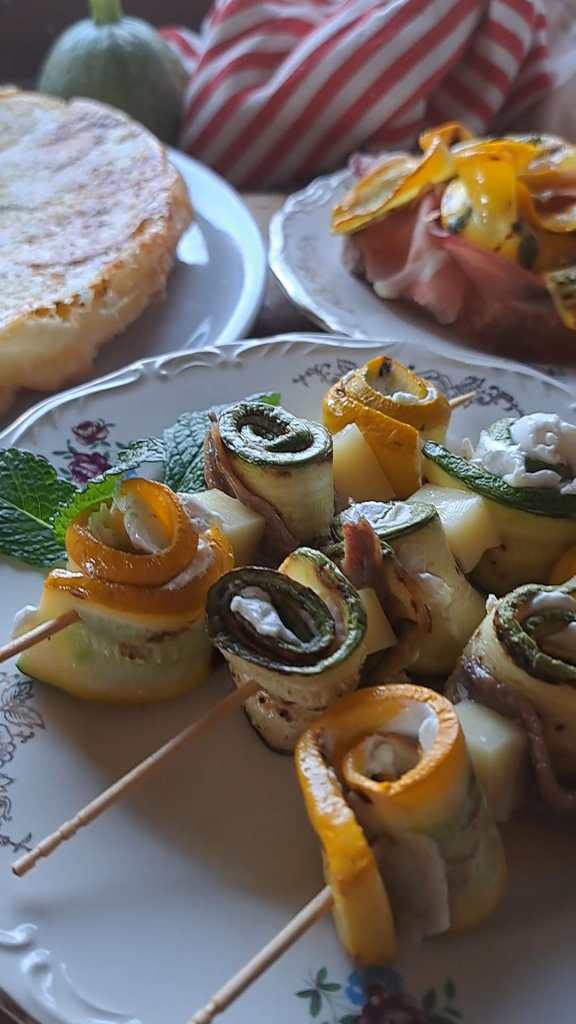 - Su uno spiedino di legno infiliamo alternandoli i rotolini di zucchine, i cubetti di formaggio (noi abbiamo usato una fontina) e un’alice del mar Cantabrico che con il suo gusto deciso contrasta con la dolcezza delle zucchine