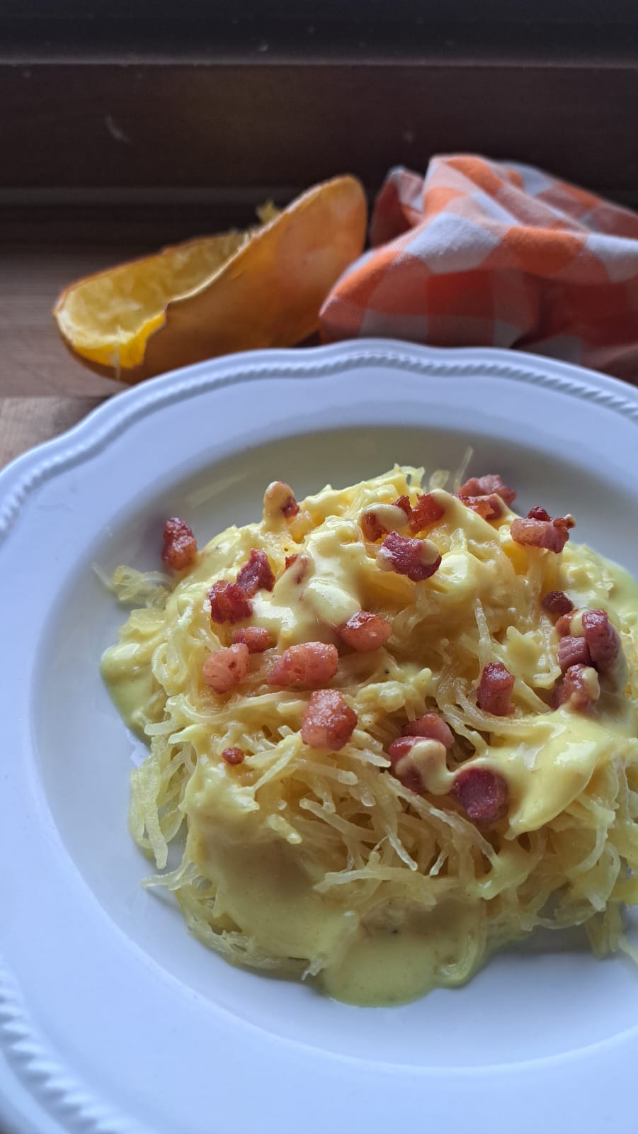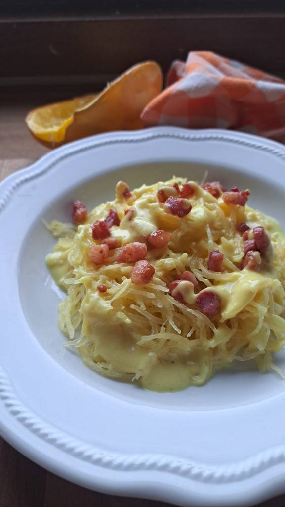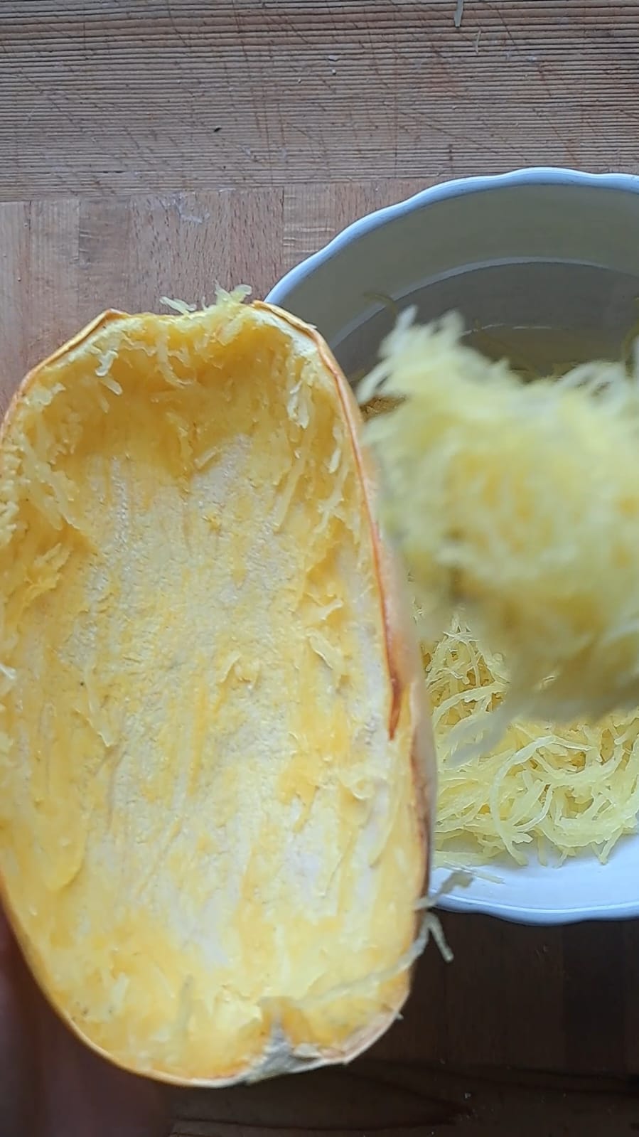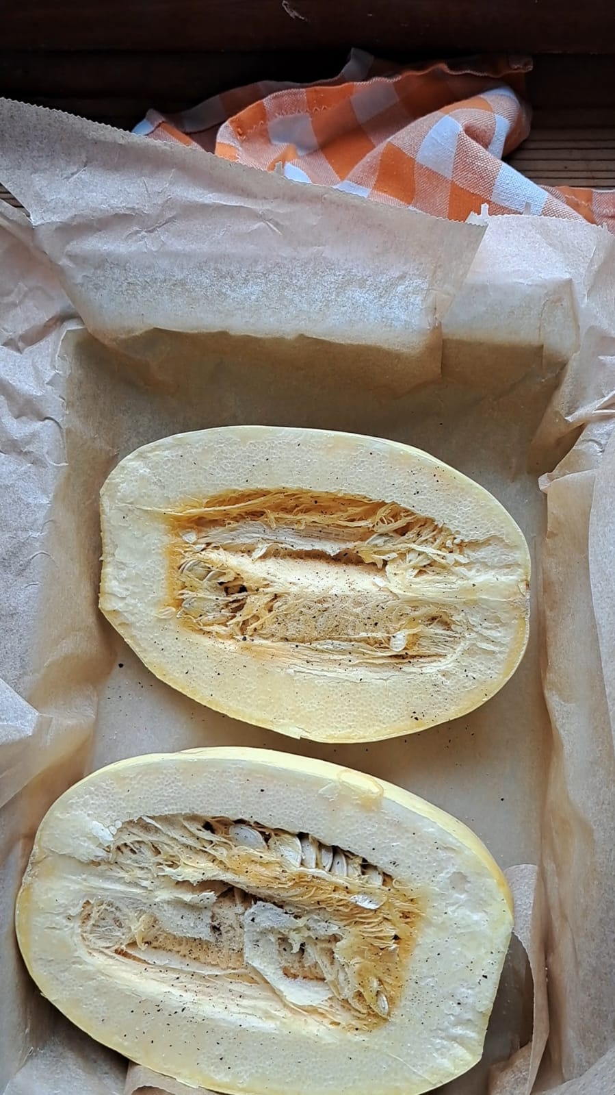 After baking, let it cool for about ten minutes, then gently scrape the flesh with a fork—little by little it will turn into real vegetable “spaghetti.” You can do this well in advance since there’s no risk of it overcooking or sticking like regular pasta!